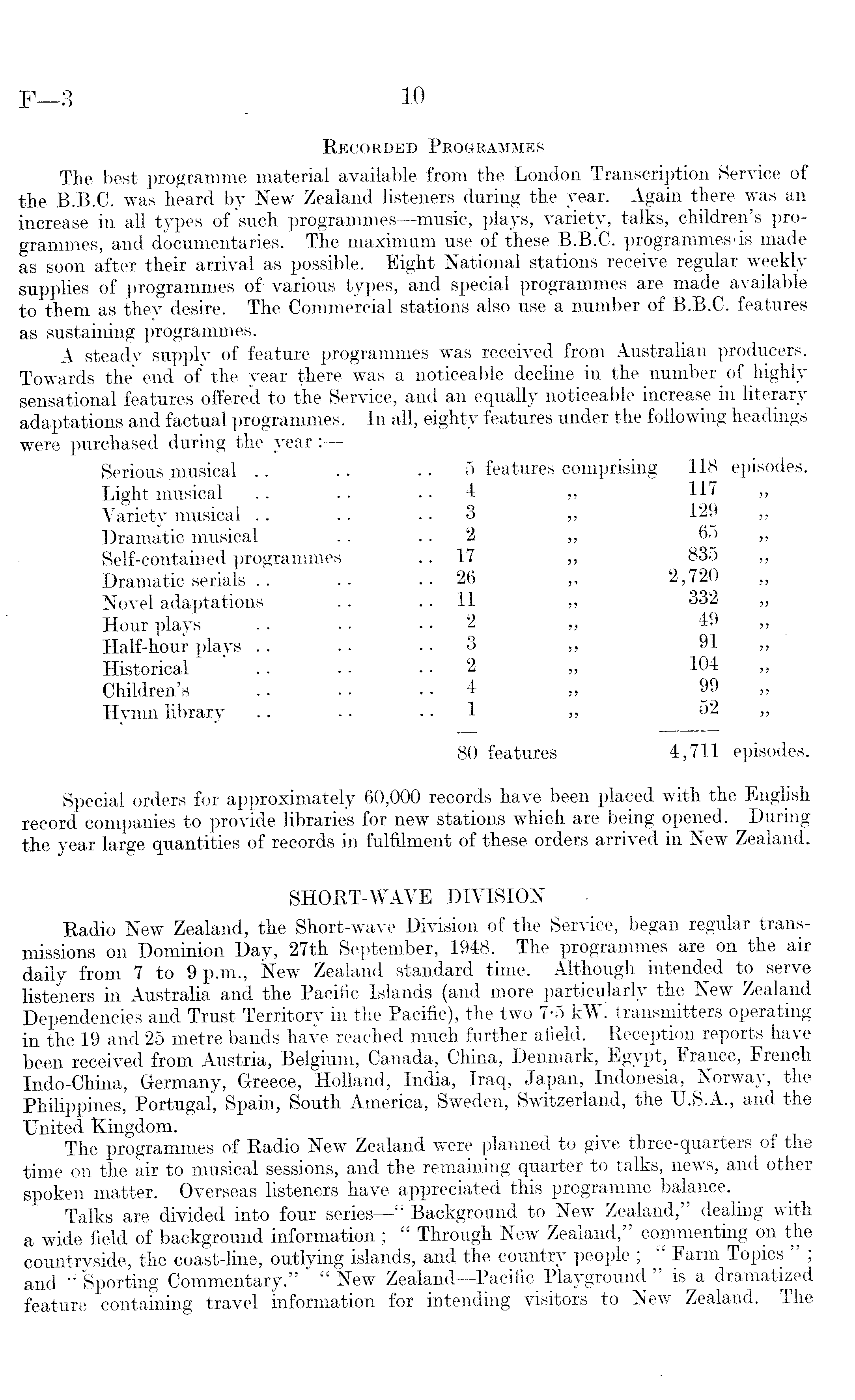 Recorded Programmes The best programme material available from the London Transcription Service of the 8.8.C. was heard by New Zealand listeners during the year. Again there was an increase in all types of such programmes —music, plays, variety, talks, children's programmes, and documentaries. The maximum use of these 8.8.C. programmes-is made as soon after their arrival as possible. Eight National stations receive regular weekly supplies of programmes of various types, and special programmes are made available to them as they desire. The Commercial stations also use a number of 8.8.C. features as sustaining programmes. A steady supply of feature programmes was received from Australian producers. Towards the end of the year there was a noticeable decline in the number of highly sensational features offered to the Service, and an equally noticeable increase in literary adaptations and factual programmes. In all, eighty features under the following headings were purchased during the year : Serious .musical .. .. 5 features comprising 118 episodes. Light musical .. .. .. 4 „ 117 „ Variety musical .. .. 3 „ 129 „ Dramatic musical .. 2 „ 65 „ Self-contained programmes .. 17 „ 835 „ Dramatic serials .. .... 26 ~ 2,720 „ Novel adaptations .. 11 „ 332 „ Hour plays .. .. 2 „ 49 „ Half-hour plays .. .. .. 3 ~ 91 „ Historical .. . ■ .. 2 „ 104 „ Children's .. .. .. 4 ~ 99 „ Hymn library .. .. .. 1 „ 52 „ 80 features 4,711 episodes. Special orders for approximately 60,000 records have been placed with the English record companies to provide libraries for new stations which are being opened. During the year large quantities of records in fulfilment of these orders arrived in New Zealand. SHORT-WAVE DIVISION Radio New Zealand, the Short-wave Division of the Service, began regular transmissions on Dominion Day, 27th September, 1948. The programmes are on the air daily from 7 to 9 p.m., New Zealand standard time. Although intended to serve listeners in Australia and the Pacific Islands (and more particularly the New Zealand Dependencies and Trust Territory in the Pacific), the two 7-5 kW. transmitters operating in the 19 and 25 metre bands have reached much further afield. Reception reports have been received from Austria, Belgium, Canada, China, Denmark, Egypt, France, French Indo-China, Germany, Greece, Holland, India, Iraq, Japan, Indonesia, Norway, the Philippines, Portugal, Spain, South America, Sweden, Switzerland, the U.S.A., and the United Kingdom. The programmes of Radio New Zealand were planned to give three-quarters of the time on the air to musical sessions, and the remaining quarter to talks, news, and other spoken matter. Overseas listeners have appreciated this programme balance. Talks are divided into four series—" Background to New Zealand,' dealing with a wide field of background information ; " Through New Zealand," commenting on the countryside, the coast-line, outlying islands, and the country people ; " Farm Topics " ; and " Sporting Commentary." " New Zealand —Pacific Playground " is a dramatized feature containing travel information for intending visitors to New Zealand. The