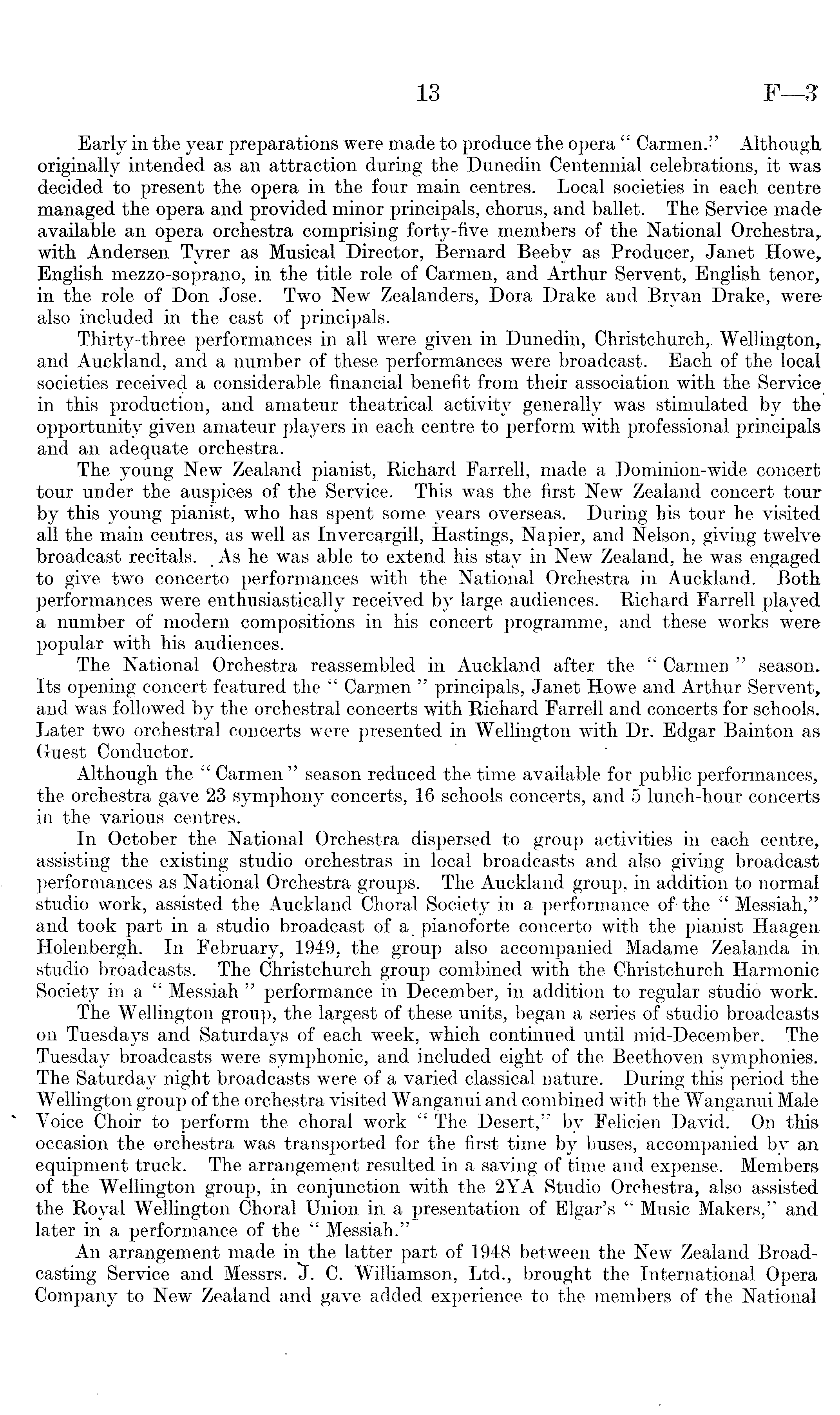 Early in the year preparations were made to produce the opera " Carmen.'' Although, originally intended as an attraction during the Dunedin Centennial celebrations, it was decided to present the opera in the four main centres. Local societies in each centre managed the opera and provided minor principals, chorus, and ballet. The Service made available an opera orchestra comprising forty-five members of the National Orchestra, with Andersen Tyrer as Musical Director, Bernard Beeby as Producer, Janet Howe, English mezzo-soprano, in the title role of Carmen, and Arthur Servent, English tenor, in the role of Don Jose. Two New Zealanders, Dora Drake and Bryan Drake, were also included in the cast of principals. Thirty-three performances in all were given in Dunedin, Christchurch, Wellington, and Auckland, and a number of these performances were broadcast. Each of the local societies received a considerable financial benefit from their association with the Service in this production, and amateur theatrical activity generally was stimulated by the opportunity given amateur players in each centre to perform with professional principals and an adequate orchestra. The young New Zealand pianist, Richard Farrell, made a Dominion-wide concert tour under the auspices of the Service. This was the first New Zealand concert tour by this young pianist, who has spent some years overseas. During his tour he visited all the main centres, as well as Invercargill, Hastings, Napier, and Nelson, giving twelve broadcast recitals. _As he was able to extend his stay in New Zealand, he was engaged to give two concerto performances with the National Orchestra in Auckland. Both performances were enthusiastically received by large audiences. Richard Farrell played a number of modern compositions in his concert programme, and these works were popular with his audiences. The National Orchestra reassembled in Auckland after the " Carmen " season. Its opening concert featured the " Carmen " principals, Janet Howe and Arthur Servent, and was followed by the orchestral concerts with Richard Farrell and concerts for schools. Later two orchestral concerts were presented in Wellington with Dr. Edgar Bainton as Guest Conductor. Although the " Carmen " season reduced the time available for public performances, the orchestra gave 23 symphony concerts, 16 schools concerts, and 5 lunch-hour concerts in the various centres. In October the National Orchestra dispersed to group activities in each centre, assisting the existing studio orchestras in local broadcasts and also giving broadcast performances as National Orchestra groups. The Auckland group, in addition to normal studio work, assisted the Auckland Choral Society in a performance of the " Messiah," and took part in a studio broadcast of a. pianoforte concerto with the pianist Haagen Holenbergh. In February, 1949, the group also accompanied Madame Zealanda in studio broadcasts. The Christchurch group combined with the Christchurch Harmonic Society in a " Messiah " performance in December, in addition to regular studio work. The Wellington group, the largest of these units, began a series of studio broadcasts on Tuesdays and Saturdays of each week, which continued until mid-December. The Tuesday broadcasts were symphonic, and included eight of the Beethoven symphonies. The Saturday night broadcasts were of a varied classical nature. During this period the Wellington group of the orchestra visited Wanganui and combined with the Wanganui Male Voice Choir to perform the choral work " The Desert," by Felicien David. On this occasion the orchestra was transported for the first time by buses, accompanied by an equipment truck. The arrangement resulted in a saving of time and expense. Members of the Wellington group, in conjunction with the 2YA Studio Orchestra, also assisted the Royal Wellington Choral Union in a presentation of Elgar's " Music Makers," and later in a performance of the " Messiah." An arrangement made in the latter part of 1948 between the New Zealand Broadcasting Service and Messrs. tf. C. Williamson, Ltd., brought the International Opera Company to New Zealand and gave added experience to the members of the National
