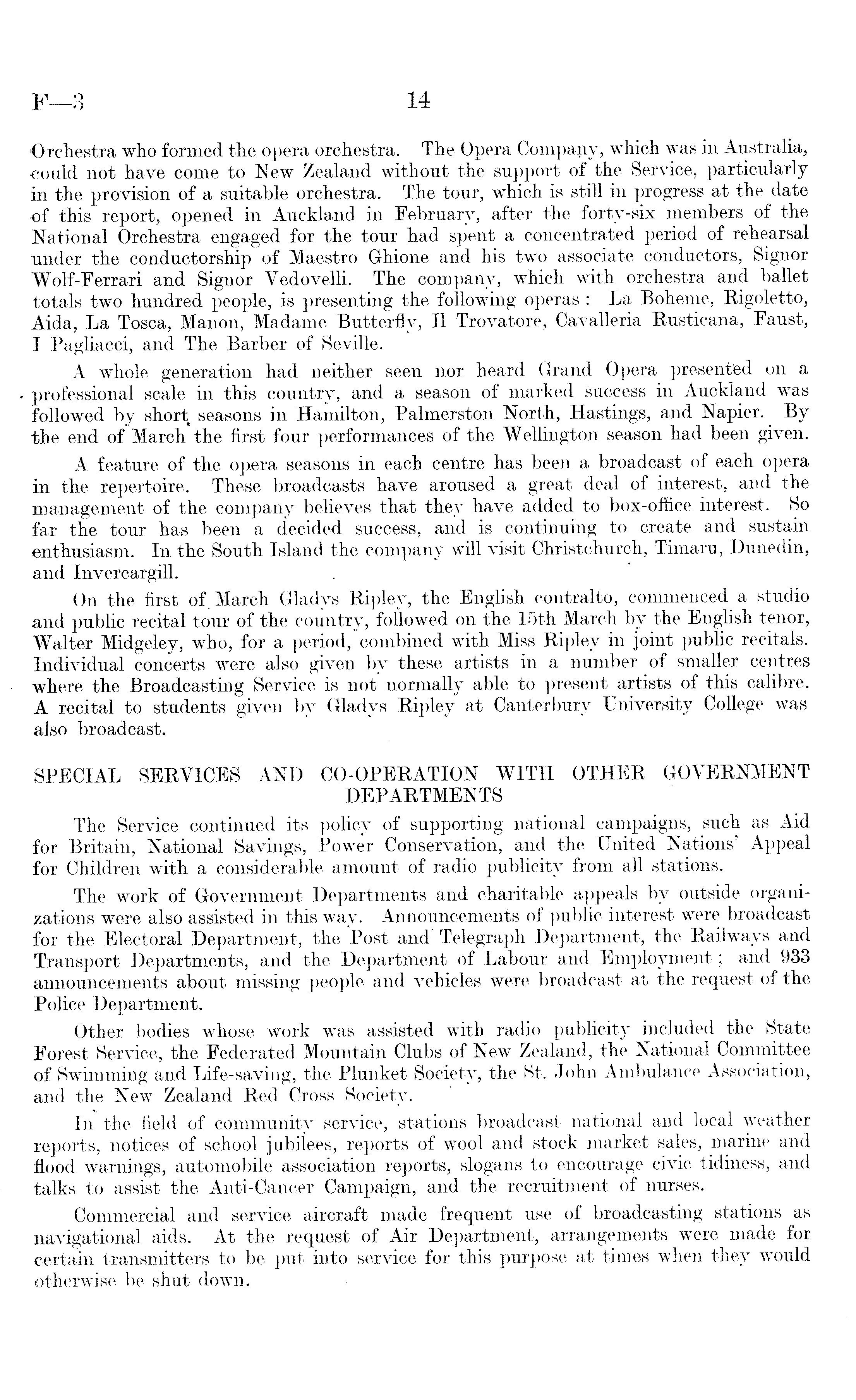 Orchestra who formed the opera orchestra. The Opera Company, which was in Australia, could not have come to New Zealand without the support of the Service, particularly in the provision of a suitable orchestra. The tour, which is still in progress at the date of this report, opened in Auckland in February, after the forty-six members of the National Orchestra engaged for the tour had spent a concentrated period of rehearsal under the conductor ship of Maestro Ghione and his two associate conductors, Signor Wolf-Ferrari and Signor Vedovelli. The company, which with orchestra and ballet totals two hundred people, is presenting the following operas : La Boheme, Rigoletto, Aida, La Tosca, Manon, Madame Butterfly, II Trovatore, Cavalleria Rusticana, Faust, I Pagliacci, and The Barber of Seville. A whole generation had neither seen nor heard Grand Opera presented on a professional scale in this country, and a season of marked success in Auckland was followed by short seasons in Hamilton, Palmerston North, Hastings, and Napier. By the end of March the first four performances of the Wellington season had been given. A feature of the opera seasons in each centre has been a broadcast of each opera in the repertoire. These broadcasts have aroused a great deal of interest, and the management of the company believes that they have added to box-office interest. So far the tour has been a decided success, and is continuing to create and sustain enthusiasm. In the South Island the company will visit Christchurch, Timaru, Dunedin, and Invercargill. On the first of. March Gladys Ripley, the English contralto, commenced a studio and public recital tour of the country, followed on the 15th March by the English tenor, Walter Midgeley, who, for a period, combined with Miss Ripley in joint public recitals. Individual concerts were also given by these artists in a number of smaller centres where the Broadcasting Service is not normally able to present artists of this calibre. A recital to students given by Gladys Ripley at Canterbury University College was also broadcast. SPECIAL SERVICES AND CO-OPERATION WITH OTHER GOVERNMENT DEPARTMENTS The Service continued its policy of supporting national campaigns, such as Aid for Britain, National Savings, Power Conservation, and the United Nations' Appeal for Children with a considerable amount of radio publicity from all stations. The work of Government Departments and charitable appeals by outside organizations were also assisted in this way. Announcements of public interest were broadcast for the Electoral Department, the Post and" Telegraph Department, the Railways and Transport Departments, and the Department of Labour and Employment; and 933 announcements about missing people and vehicles were broadcast at the request of the Police Department. Other bodies whose work was assisted with radio publicity included the State Forest Service, the Federated Mountain Clubs of New Zealand, the National Committee of Swimming and Life-saving, the Plunket Society, the St. John Ambulance Association, and the New Zealand Red Cross Society. In the field of community service, stations broadcast national and local weather reports, notices of school jubilees, reports of wool and stock market sales, marine and flood warnings, automobile association reports, slogans to encourage civic tidiness, and talks to assist the Anti-Cancer Campaign, and the recruitment of nurses. Commercial and service aircraft made frequent use of broadcasting stations as navigational aids. At the request of Air Department, arrangements were made for certain transmitters to be put into service for this purpose at times when they would otherwise be shut down.