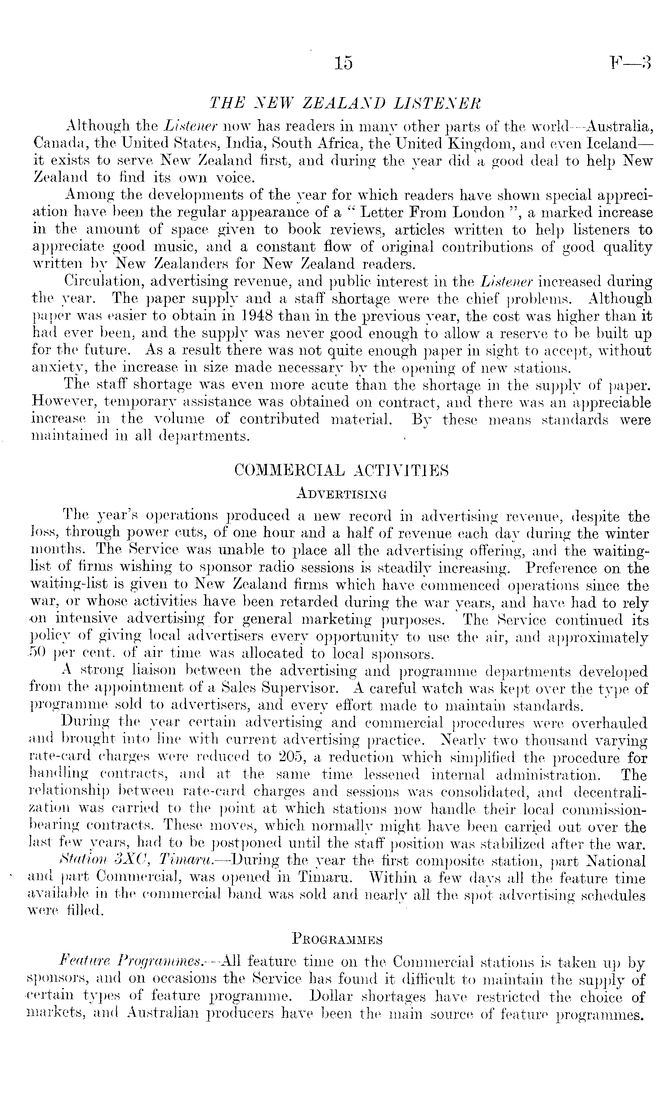 THE NEW ZEALAND LISTENER Although the Listener now has readers in many other parts of the world —Australia, Canada, the United States, India, South Africa, the United Kingdom, and even Iceland — it exists to serve New Zealand first, and during the year did a good deal to help New Zealand to find its own voice. Among the developments of the year for which readers have shown special appreciation have been the regular appearance of a " Letter From London ", a marked increase in the amount of space given to book reviews, articles written to help listeners to appreciate good music, and a constant flow of original contributions of good quality written by New Zealanders for New Zealand readers. Circulation, advertising revenue, and public interest in the Listener increased during -the year. The paper supply and a staff shortage were the chief problems. Although paper was easier to obtain in 1948 than in the previous year, the cost was higher than it had ever been, and the supply was never good enough to allow a reserve to be built up for the future. As a result there was not quite enough paper in sight to accept, without anxiety, the increase in size made necessary by the opening of new stations. The staff shortage was even more acute than the shortage in the supply of paper. However, temporary assistance was obtained on contract, and there was an appreciable increase in the volume of contributed material. By these means standards were maintained in all departments. COMMEKCIAL ACTIVITIESAdvertising The year's operations produced a new record in advertising revenue, despite the loss, through power cuts, of one hour and a half of revenue each day during the winter months. The Service was unable to place all the advertising offering, and the waitinglist of firms wishing to sponsor radio sessions is steadily increasing. Preference on the waiting-list is given to New Zealand firms which have commenced operations since the war, or whose activities have been retarded during the war years, and have had to rely -on intensive advertising for general marketing purposes. The Service continued its policy of giving local advertisers every opportunity to use the air, and approximately 50 per cent, of air time was allocated to local sponsors. A strong liaison between the advertising and programme departments developed from the appointment of a Sales Supervisor. A careful watch was kept over the type of programme sold to advertisers, and every effort made to maintain standards. During the year certain advertising and commercial procedures were overhauled and brought into line with current advertising practice. Nearly two thousand varying rate-card charges were reduced to 205, a reduction which simplified the procedure for handling contracts, and at the same time lessened internal administration. The relationship between rate-card charges and sessions was consolidated, and decentralisation was carried to the point at which stations now handle their local commissionbearing contracts. These moves, which normally might have been carried out over the last few years, had to be postponed until the staff position was stabilized after the war. Station 3XC, Timaru.—During the year the first composite station, part National and part Commercial, was opened in Timaru. Within a few days all the feature time available in the commercial band was sold and nearly all the spot advertising schedules were filled. Programmes Feature Programmes.—-All feature time on the Commercial stations is taken up by sponsors, and on occasions the Service has found it difficult to maintain the supply of •certain types of feature programme. Dollar shortages have restricted .the choice of markets, and Australian producers have been the main source of feature programmes.
