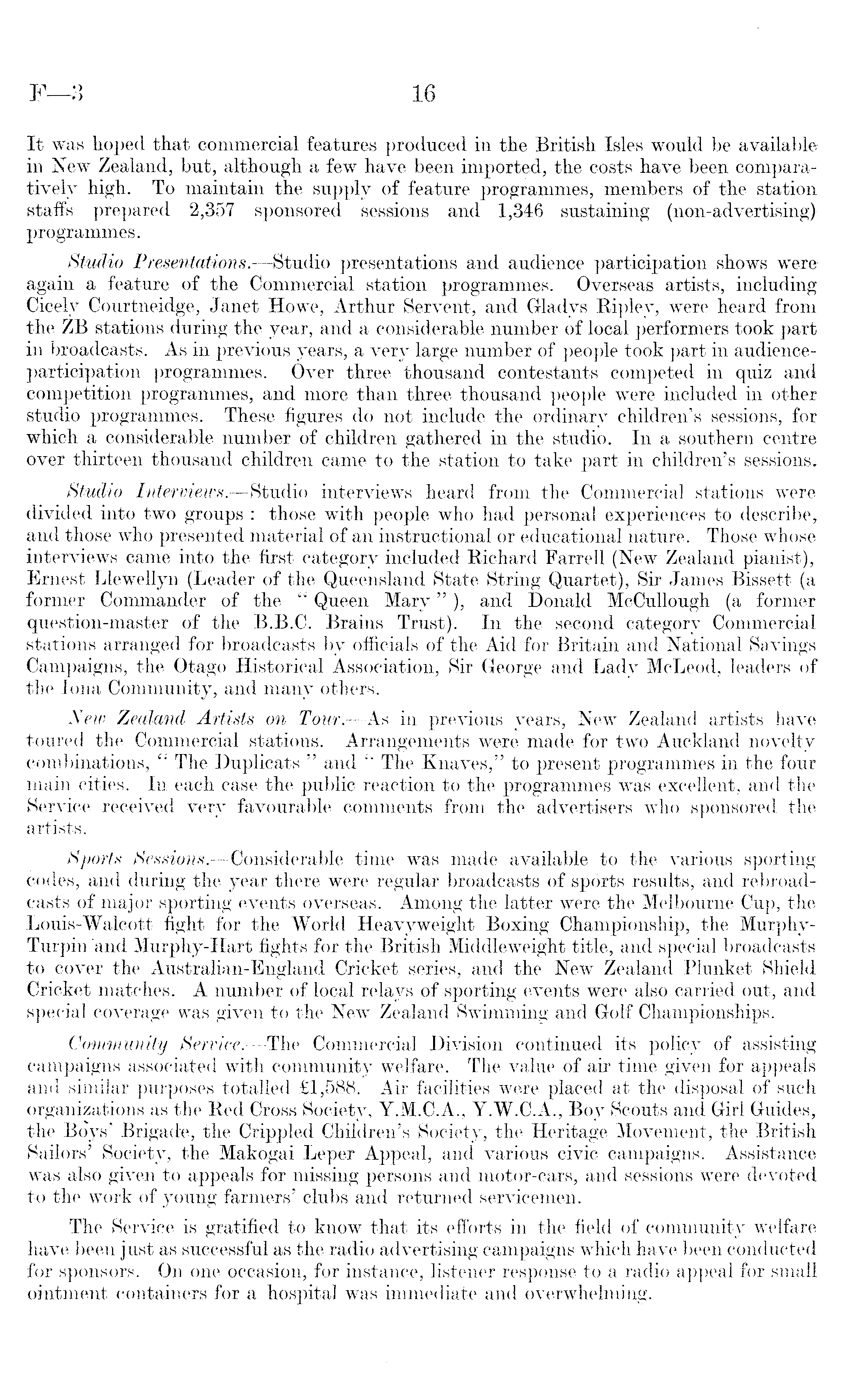 It was hoped that commercial features produced in the British Isles would be available in New Zealand, but, although a few have been imported, the costs have been comparatively high. To maintain the supply of feature programmes, members of the station staffs prepared 2,357 sponsored sessions and 1,346 sustaining (non-advertising) programmes. Studio Presentations. —Studio presentations and audience participation shows were again a feature of the Commercial station programmes. Overseas artists, including Cicely Courtneidge, Janet Howe, Arthur Servent, and Gladys Ripley, were heard from the ZB stations during the year, and a considerable number of local performers took part in broadcasts. As in previous years, a very large number of people took part in audienceparticipation programmes. Over three thousand contestants competed in quiz and competition programmes, and more than three thousand people were included in other studio programmes. These figures do not include the ordinary children's sessions, for which a considerable number of children gathered in the studio. In a southern centre over thirteen thousand children came to the station to take part in children's sessions. Studio Interviews. —Studio interviews heard from the Commercial stations were divided into two groups : those with people who had personal experiences to describe, and those who presented material of an instructional or educational nature. Those whose interviews came into the first category included Richard Farrell (New Zealand pianist),, Ernest Llewellyn (Leader of the Queensland State String Quartet), Sir James Bissett (a former Commander of the " Queen Mary" ), and Donald McCullough (a former question-master of the 8.8.C. Brains Trust). In the second category Commercial stations arranged for broadcasts by officials of the Aid for Britain and National Savings Campaigns, the Otago Historical Association, Sir George and Lady McLeod, leaders of the lona Community, and many others. New Zealand Artists on Tour.—As in previous years, New Zealand artists have toured the Commercial stations. Arrangements were made for two Auckland novelty combinations, " The Duplicats " and " The Knaves," to present programmes in the four main cities. In each case the public reaction to the programmes was excellent, and the Service received very favourable comments from the advertisers who sponsored the artists. Sports Sessions.—Considerable time was made available to the various sporting codes, and during the year there were regular broadcasts of sports results, and rebroadcasts of major sporting events overseas. Among the latter were the Melbourne Cup, the Louis-Walcott fight for the World Heavyweight Boxing Championship, the MurphyTurpin 'and Murphy-Hart fights for the British Middleweight title, and special broadcasts to cover the Australian-England Cricket series, and the New Zealand Plunket Shield Cricket matches. A number of local relays of sporting events were also carried out, and special coverage was given to the New Zealand Swimming and Golf Championships. Community Service.—The Commercial Division continued its policy of assisting campaigns associated with community welfare. The value of air time given for appeals and similar purposes totalled £1,588. Air facilities were placed at the disposal of such organizations as the Red Cross Society, Y.M.C.A., Y.W.C.A., Boy Scouts and Girl Guides, the Boys' Brigade, the Crippled Children's Society, the Heritage Movement, the British Sailors' Society, the Makogai Leper Appeal, and various civic campaigns. Assistance was also given to appeals for missing persons and motor-cars, and sessions were devoted to the work of young farmers' clubs and returned servicemen. The Service is gratified to know that its efforts in the field of community welfarehave been just as successful as the radio advertising campaigns which have been conducted for sponsors. Oil one occasion, for instance, listener response to a radio appeal for small ointment containers for a hospital was immediate and overwhelming.