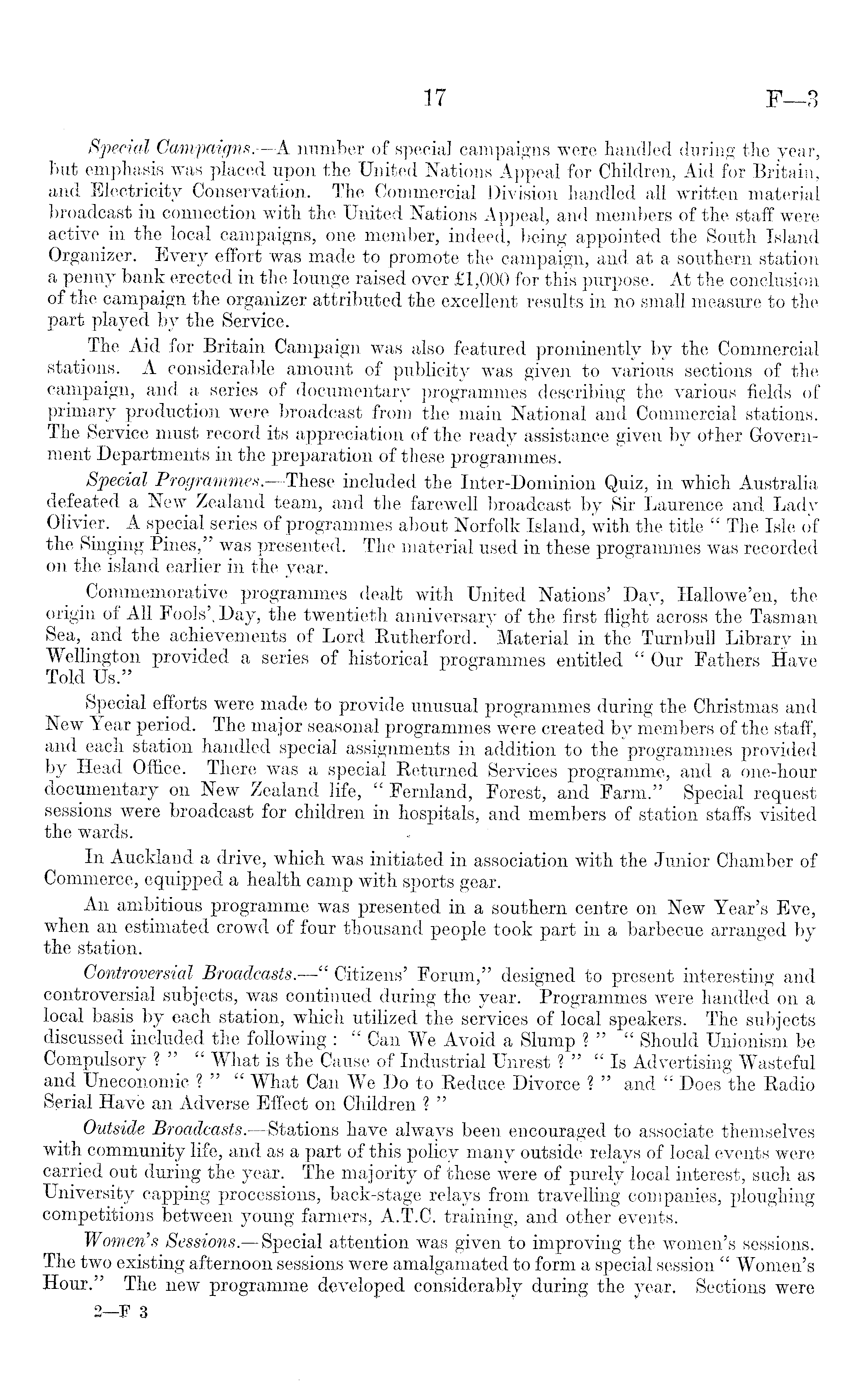 Special Campaigns.—A. number of special campaigns were handled during the year, but emphasis was placed upon the United Nations Appeal for Children, Aid for Britain, and Electricity Conservation. The Commercial Division handled all written material broadcast in connection with the United Nations Appeal, and members of the staff were active in the local campaigns, one member, indeed, being appointed the South Island Organizer. Every effort was made to promote the campaign, and at a southern station a penny bank erected in the lounge raised over £l,OOO for this purpose. At the conclusion of the campaign the organizer attributed the excellent results in no small measure to the part played by the Service. The Aid for Britain Campaign was also featured prominently by the Commercial stations. A considerable amount of publicity was given to various sections of the campaign, and a series of documentary programmes describing the various fields of primary production were broadcast from the main National and Commercial stations. The Service must record its appreciation of the ready assistance given by other Government Departments in the preparation of these programmes. Special Programmes.—These included the Inter-Dominion Quiz, in which Australia defeated a New Zealand team, and the farewell broadcast by Sir Laurence and. Lady Olivier. A special series of programmes about Norfolk Island, with the title " The Isle of the Singing Pines," was presented. The material used in these programmes was recorded on the island earlier in the year. Commemorative programmes dealt with United Nations' Day, Hallowe'en, the origin of All Fools', Day, the twentieth anniversary of the first flight across the Tasman Sea, and the achievements of Lord Rutherford. Material in the Turnbull Library in Wellington provided a series of historical programmes entitled " Our Fathers Have Told Us." Special efforts were made to provide unusual programmes during the Christmas and New Year period. The major seasonal programmes were created by members of the staff, and each station handled special assignments in addition to the programmes provided by Head Office. There was a special Returned Services programme, and a one-hour documentary on New Zealand life, " Fernland, Forest, and Farm." Special request sessions were broadcast for children in hospitals, and members of station staffs visited the wards. In Auckland a drive, which was initiated in association with the Junior Chamber of Commerce, equipped a health camp with sports gear. An ambitious programme was presented in a southern centre on New Year's Eve, when an estimated crowd of four thousand people took part in a barbecue arranged by the station. Controversial Broadcasts.—" Citizens' Forum," designed to present interesting and controversial subjects, was continued during the year. Programmes were handled on a local basis by each station, which utilized the services of local speakers. The subjects discussed included the following : " Can We Avoid a Slump ? " " Should Unionism be Compulsory ? " " What is the Cause of Industrial Unrest ? " "Is Advertising Wasteful and Uneconomic ? " " What Can We Do to Reduce Divorce ? " and " Does the Radio Serial Have an Adverse Effect on Children ? " Outside Broadcasts.—Stations have always been encouraged to associate themselves with community life, and as a part of this policy many outside relays of local events were carried out during the year. The majority of these were of purely local interest, such as University capping processions, back-stage relays from travelling companies, ploughing competitions between young farmers, A.T.C. training, and other events. Women's Sessions.—Special attention was given to improving the women's sessions. The two existing afternoon sessions were amalgamated to form a special session " Women's Hour." The new programme developed considerably during the year. Sections were