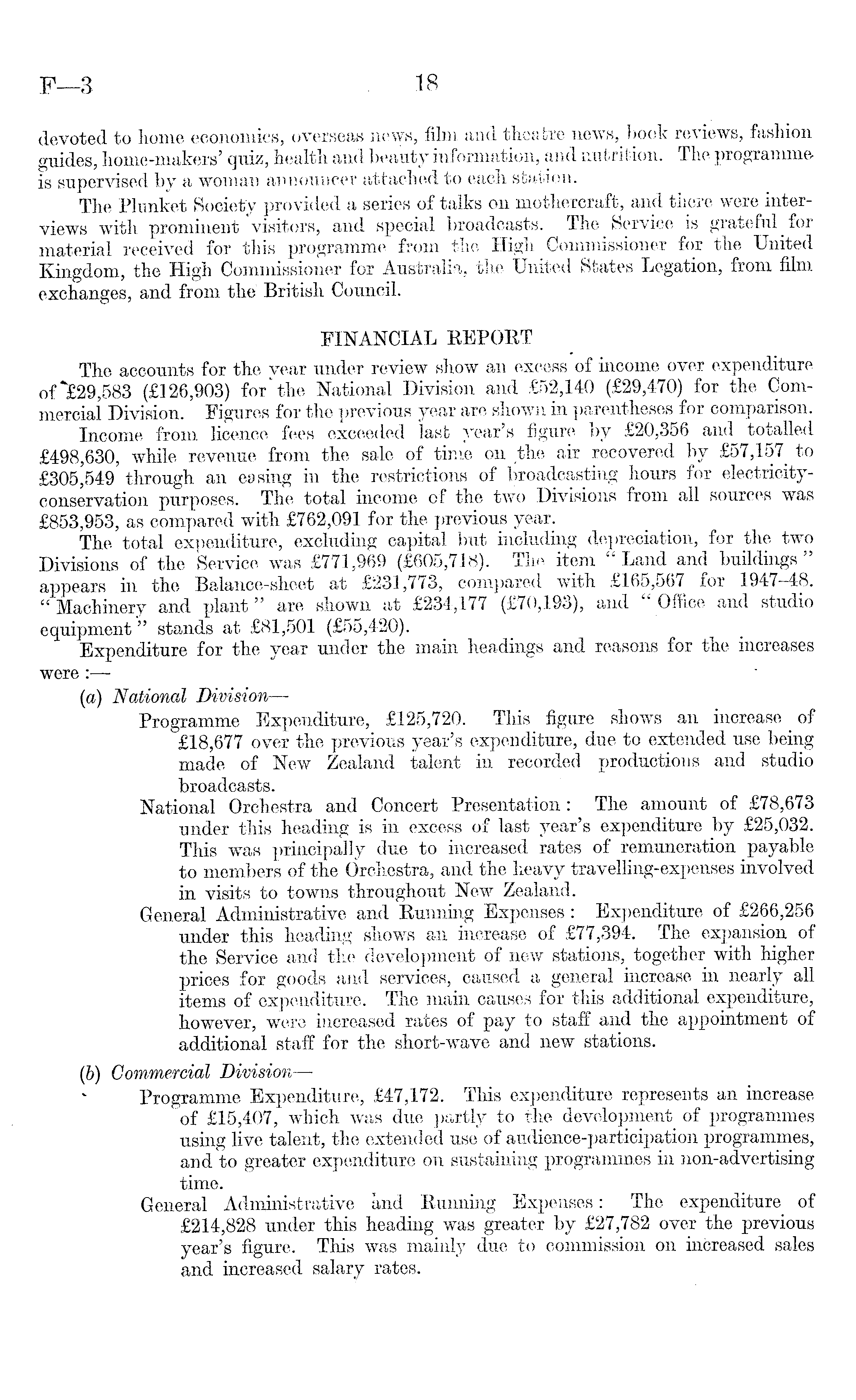 devoted to home economics, overseas news, film and theatre news, book reviews, fashion guides, home-makers' quiz, health and beauty information, and nutrition. The programme is supervised by a woman announcer attached to each station. The Plunket Society provided a series of talks on mothercraft, and there were interviews with prominent visitors, and special broadcasts. The Service is grateful for material received for this programme from the High Commissioner for the United Kingdom, the High Commissioner for Australia, the United States Legation, from film exchanges, and from the British Council. FINANCIAL REPORT The accounts for the year under review show an excess of income over expenditure 0f'*£29,583 (£126,903) for the National Division and £52,140 (£29,470) for the Commercial Division. Figures for the previous year are shown in parentheses for comparison. Income from licence fees exceeded last year's figure by £20,356 and totalled £498,630, while revenue from the sale of time on the air recovered by £57,157 to £305,549 through an easing in the restrictions of broadcasting hours for electricityconservation purposes. The total income of the two Divisions from all sources was £853,953, as compared with £762,091 for the previous year. The total expenditure, excluding capital but including depreciation, for the two Divisions of the Service was £771,969 (£605,718). The item " Land and buildings " appears in the Balance-sheet at £231,773, compared with £165,567 for 1947-48. " Machinery and plant" are shown at £234,177 (£70,193), and "Office and studio equipment" stands at £81,501 (£55,420). Expenditure for the year under the main headings and reasons for the increases were: — (a) National Division— Programme Expenditure, £125,720. This figure shows an increase _of £18,677 over the previous year's expenditure, due to extended use being made of New Zealand talent in recorded productions and studio broadcasts. National Orchestra and Concert Presentation : The amount of £78,673 under this heading is in excess of last year's expenditure by £25,032. This was principally due to increased rates of remuneration payable to members of the Orchestra, and the heavy travelling-expenses involved in visits to towns throughout New Zealand. General Administrative and Running Expenses : Expenditure of £266,256 under this heading shows an increase of £77,394. The expansion of the Service and the development of new stations, together with higher prices for goods and services, caused a general increase in nearly all items of expenditure. The main causes for this additional expenditure, however, were increased rates of pay to staff and the appointment of additional staff for the short-wave and new stations. (b) Commercial Division —- Programme Expenditure, £47,172. This expenditure represents an increase of £15,407, which wa§ due partly to the development of programmes using live talent, the extended use of audience-participation programmes, and to greater expenditure on sustaining programmes in non-advertising time. General Administrative and Running Expenses: The expenditure of £214,828 under this heading was greater by £27,782 over the previous year's figure. This was mainly due to commission on increased sales and increased salary rates.