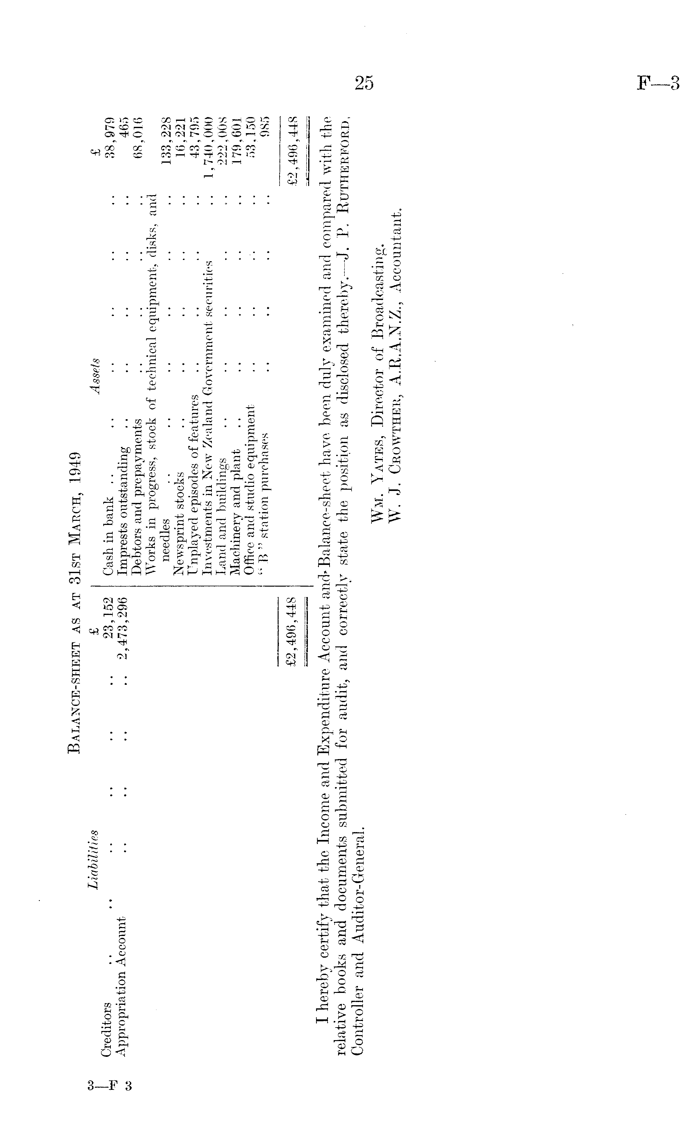 Balance-sheet as at 31st March, 1949 Liabilities £ Assets £ Creditors .. .. .. .. .. .. 23,152 Cash in bank .. .. .. .. .. .. 38,979 Appropriation Account .. .. .. ..2,473,296 Imprests outstanding .. .. .. .. .. 465 Debtors and prepayments .. .. .. . . 68,016 Works in progress, stock of technical equipment, disks, and needles .. .. .. .. .. .. 133,228 Newsprint stocks .. .. .. .. .. 16,221 Unplayed episodes of features .. .. .. .. 43,795 Investments in New Zealand Government securities .. 1,740,000 Land and buildings .. .. .. .. .. 222,008 Machinery and plant .. .. .. .. .. 179,601 Office and studio equipment .. .. . . .. 53,150 " B" station purchases .. .. .. .. 985 £2,496,448 £2,496,448 I hereby certify that the Income and Expenditure Account and* Balance-sheet have been duly examined and compared with the relative books and documents submitted for audit, and correctly state the position as disclosed thereby.— J. P. Rutherford, Controller and Auditor- General. Wm. Yates, Director of Broadcasting. W. J. Crowther, A.R.A.N.Z., Accountant,