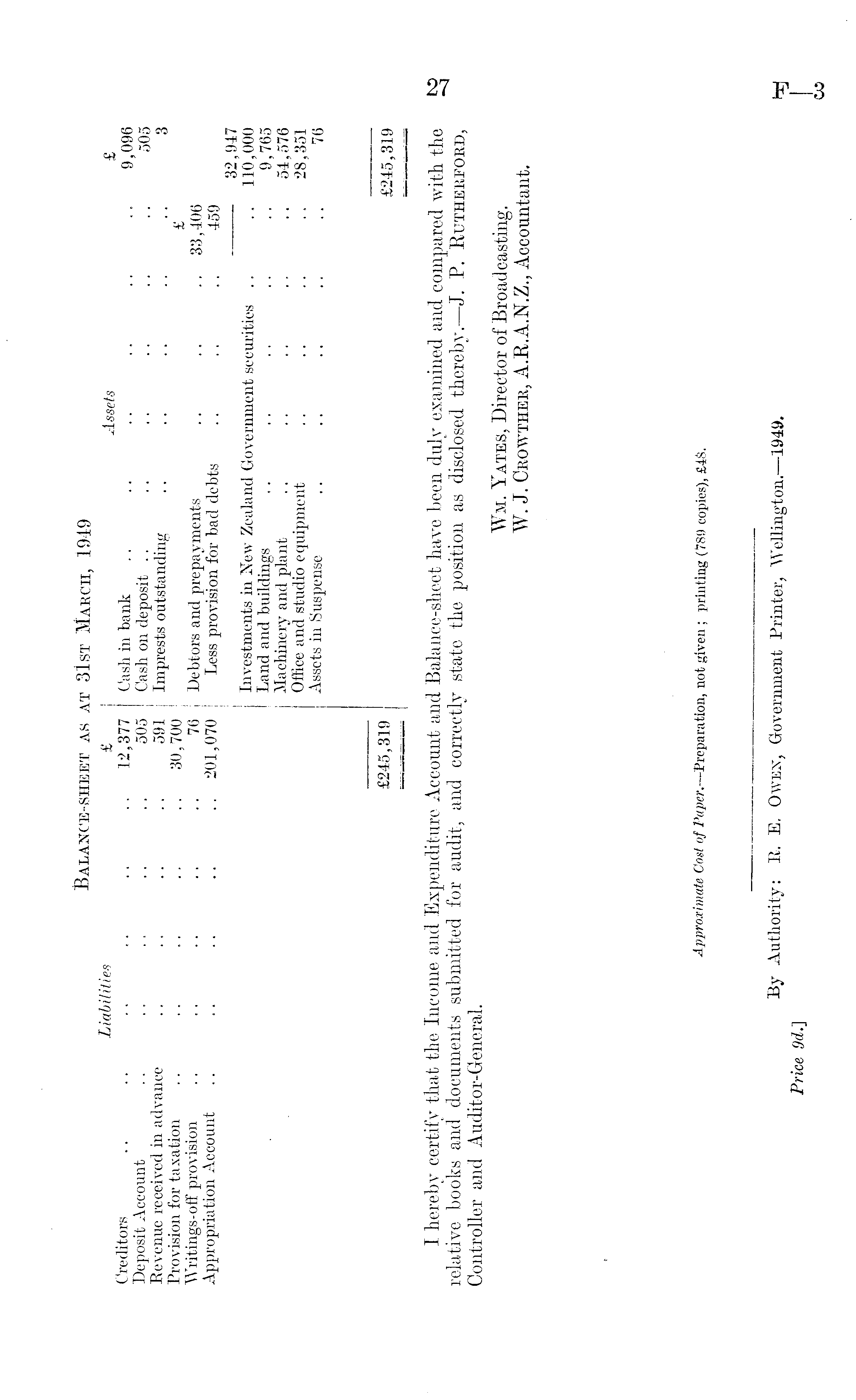 Balance-sheet as at 31st March, 1949 Liabilities £ Assets £ Creditors .. .. . . .. .. .. 12,377 Cash in bank .. .. .. .. .. .. 9,096 Deposit Account .. .. .. .. .. 505 Cash on deposit .. .. .. .. .. ... 'sos Revenue received in advance .. .. .. .. 591 Imprests outstanding .. .. .. .. .. 3 Provision for taxation .. .. .. .. .. 30,700 £ Writings-off provision .. .. .. .. .. 76 Debtors and prepayments .. .. .. 33,406 Appropriation Account .. .. .. .. .. 201,070 Less provision for bad debts .. .. .. 459 32,947 Investments in New Zealand Government securities .. .. 110,000 Land and buildings .. .. .. .. .. 9,765 Machinery and plant .. .. .. .. .. 54,576 Office and studio equipment .. .. .. .. 28,351 Assets in Suspense .. .. .. .. .. 76 £245,319 £245,319 I hereby certify that the Income and Expenditure Account and Balance-sheet have been duly examined and compared with the relative books and documents submitted for audit, and correctly state the position as disclosed thereby.— J. P. Rutherford, Controller and Auditor-General. Wm. Yates, Director of Broadcasting. W. J. Crowther, A.R.A.N.Z., Accountant.
