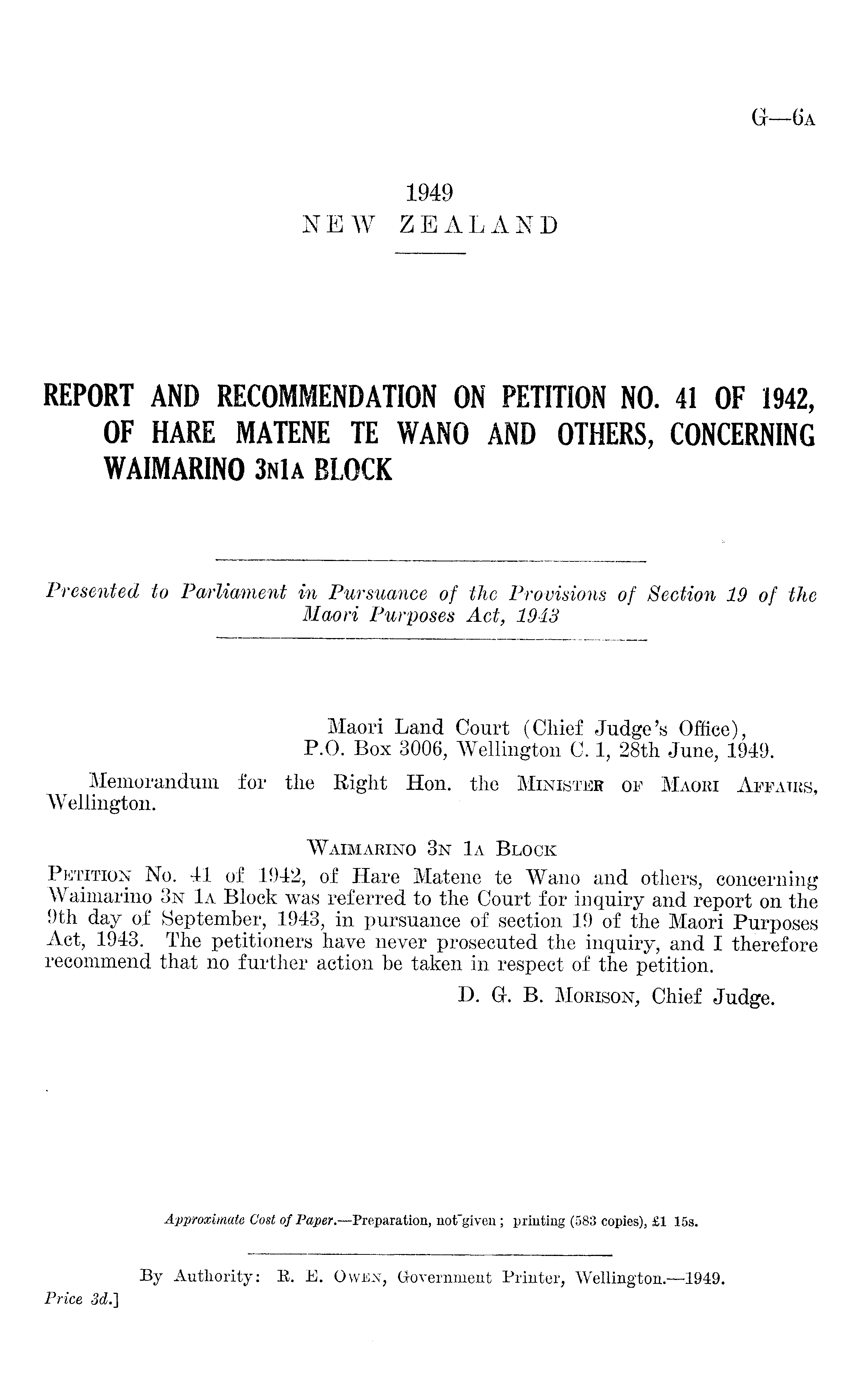 REPORT AND RECOMMENDATION ON PETITION NO. 41 OF 1942, OF HARE MATENE TE WANO AND OTHERS, CONCERNING WAIMARINO 3n1a BLOCK