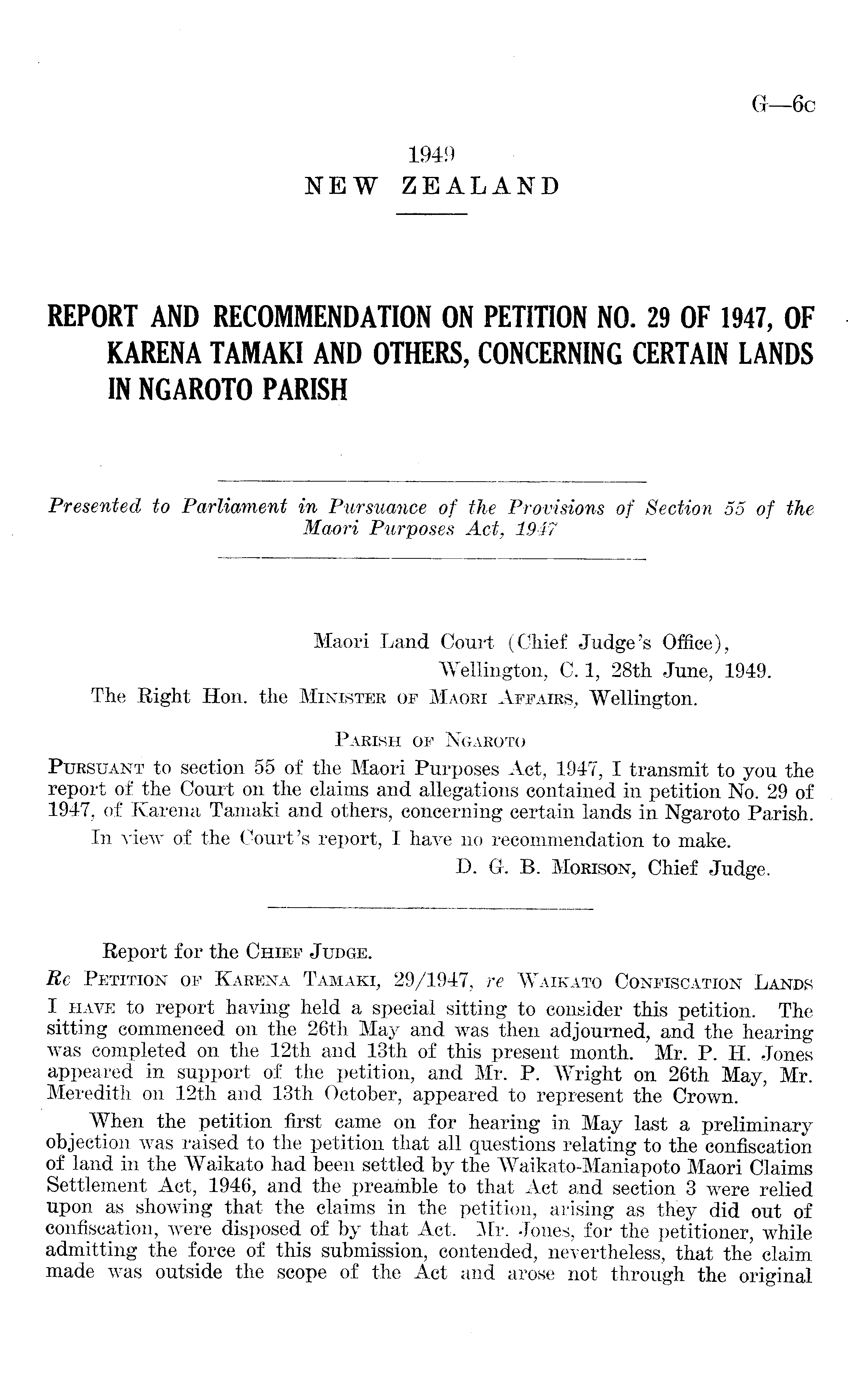 Report for the Chief Judge. Re Petition of Karena Tamaki, 29/1947, re Waikato Confiscation Lands I have to report having held a special sitting to consider this petition. The sitting commenced on the 26th May and was then adjourned, and the hearing was completed on the 12th and 13th of this present month. Mr. P. H. Jones appeared in support of the petition, and Mr. P. Wright on 26th May, Mr. Meredith on 12th and 13th October, appeared to represent the Crown. When the petition first came on for hearing in May last a preliminary objection was raised to the petition that all questions relating to the confiscation of land in the Waikato had been settled by the Waikato-Maniapoto Maori Claims Settlement Act, 1946, and the preamble to that Act and section 3 were relied upon as showing that the claims in the petition, arising as they did out of confiscation, were disposed of by that Act. Mr. Jones, for the petitioner, while admitting the force of this submission, contended, nevertheless, that the claim made was outside the scope of the Act and arose not through the original