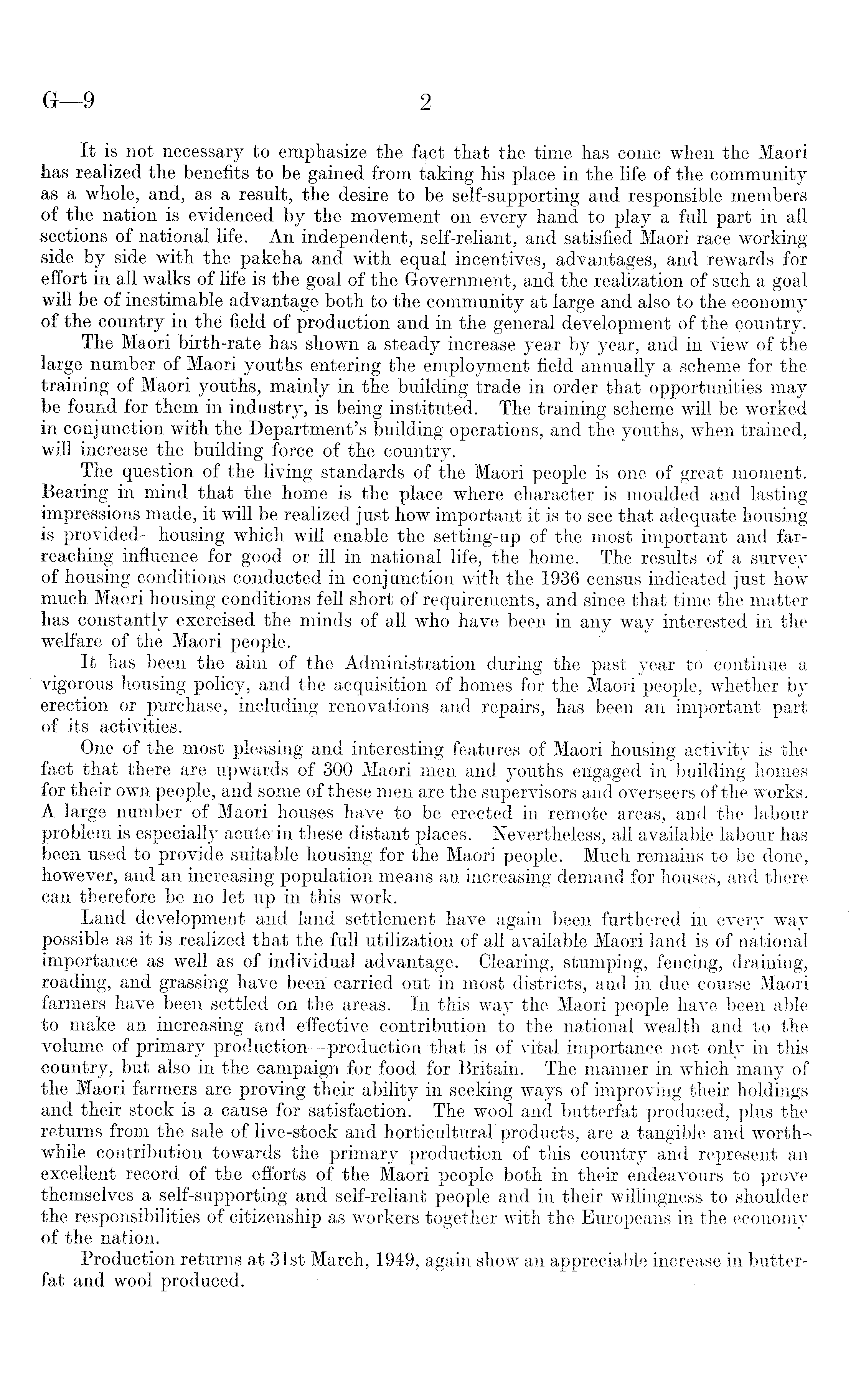 It is not necessary to emphasize the fact that the time has come when the Maori has realized the benefits to be gained from taking his place in the life of the community as a whole, and, as a result, the desire to be self-supporting and responsible members of the nation is evidenced by the movement on every hand to play a full part in all sections of national life. An independent, self-reliant, and satisfied Maori race working side by side with the pakeha and with equal incentives, advantages, and rewards for effort in all walks of life is the goal of the Government, and the realization of such a goal will be of inestimable advantage both to the community at large and also to the economy of the country in the field of production and in the general development of the country. The Maori birth-rate has shown a steady increase year by year, and in view of the large number of Maori youths entering the employment field annually a scheme for the training of Maori youths, mainly in the building trade in order that opportunities may be found for them in industry, is being instituted. The training scheme will be worked in conjunction with the Department's building operations, and the youths, when trained, will increase the building force of the country. The question of the living standards of the Maori people is one of great moment. Bearing in mind that the home is the place where character is moulded and lasting impressions made, it will be realized just how important it is to see that adequate housing is provided—housing which will enable the setting-up of the most important and farreaching influence for good or ill in national life, the home. The results of a survey of housing conditions conducted in conjunction with the 1936 census indicated just how much Maori housing conditions fell short of requirements, and since that time the matter has constantly exercised the minds of all who have been in any way interested in the welfare of the Maori people. It has been the aim of the _ Administration during the past year to continue a vigorous housing policy, and the acquisition of homes for the Maori people, whether by erection or purchase, including renovations and repairs, has been an important part of its activities. One of the most pleasing and interesting features of Maori housing activity is the fact that there are upwards of 300 Maori men and youths engaged in building homes for their own people, and some of these men are the supervisors and overseers of the works. A large number of Maori houses have to be erected in remote areas, and the labour problem is especially acute'in these distant places. Nevertheless, all available labour has been used to provide suitable housing for the Maori people. Much remains to be done, however, and an increasing population means an increasing demand for houses, and there can therefore be no let up in this work. Land development and land settlement have again been furthered in every way possible as' it is realized that the full utilization of all available Maori land is of national importance as well as of individual advantage. Clearing, stumping, fencing, draining, roading, and grassing have been" carried out in most districts, and in due course Maori farmers have been settled on the areas. In this way the Maori people have been able to make an increasing and effective contribution to the national wealth and to the volume of primary production—production that is of vital importance not only in this country, but also in the campaign for food for Britain. The manner in which many of the Maori farmers are proving their ability in seeking ways of improving their holdings and their stock is a cause for satisfaction. The wool and butterfat produced, plus the returns from the sale of live-stock and horticultural products, are a tangible and worths while contribution towards the primary production of this country and represent an excellent record of the efforts of the Maori people both in their endeavours to prove themselves a self-supporting and self-reliant people and in their willingness to shoulder. the responsibilities of citizenship as workers together with the Europeans in the economy of the nation. Production returns at 31st March, 1949, again show an appreciable increase in butterfat and wool produced.