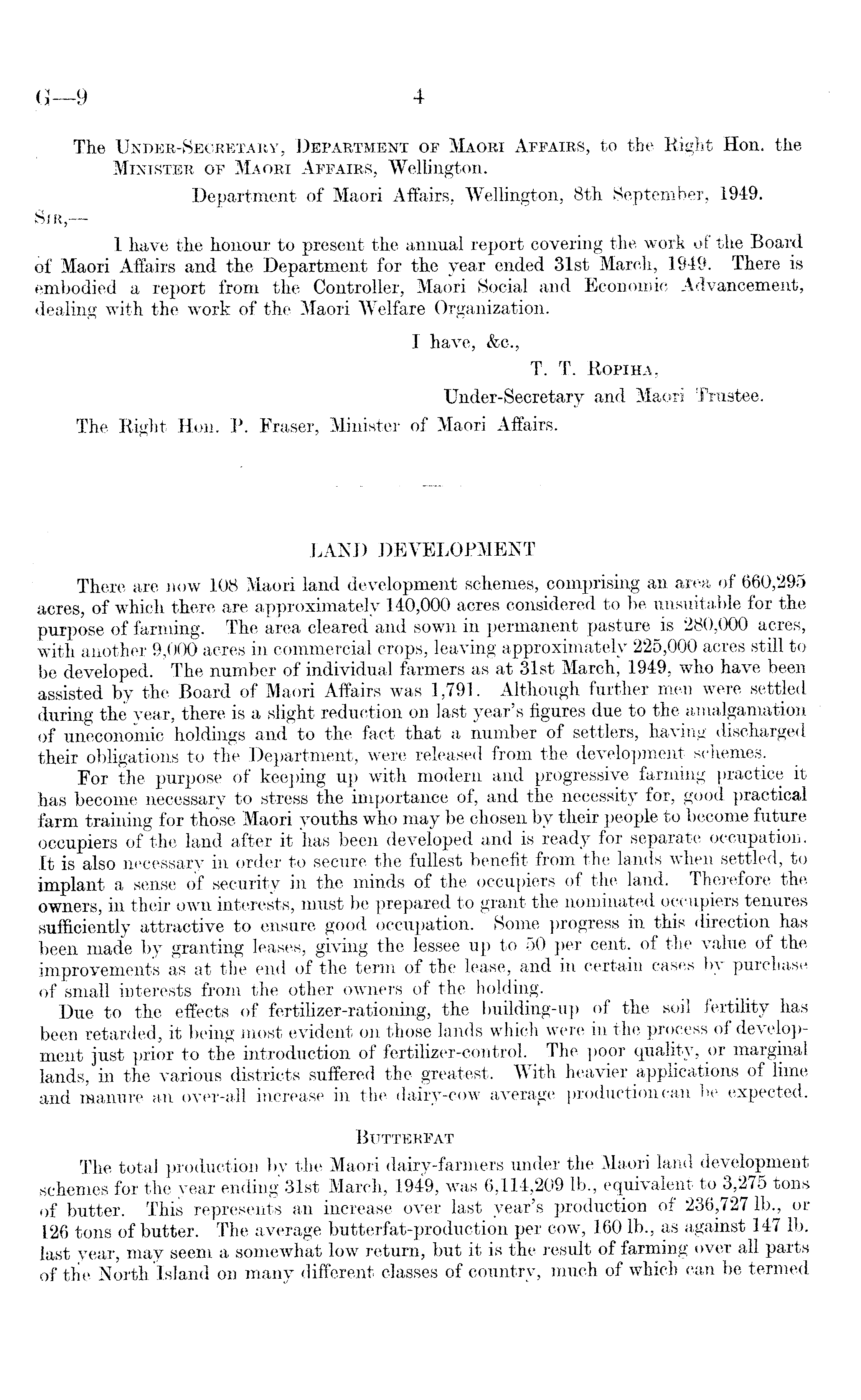 The Under-Secretary, Department of Maori Affairs, to the Right Hon. the Minister of Maori Affairs, Wellington. Department of Maori Affairs, Wellington, Bth September, 1949. Sir, — I have the honour to present the annual report covering the work of the Board of Maori Affairs and the Department for the year ended 31st March, 1949. There is embodied a report from the Controller, Maori Social and Economic Advancement, dealing with the work of the Maori Welfare Organization. I have, &c., T. T. Ropiha, Under-Secretary and Maori Trustee. The Right Hon. P. Fraser, Minister of Maori Affairs. LAND DEVELOPMENT There are now 108 Maori land development schemes, comprising an area of 660,295 acres, of which there are approximately 140,000 acres considered to be unsuitable for the purpose of farming. The area cleared and sown in permanent pasture is 280,000 acres, with another 9,000 acres in commercial crops, leaving approximately 225,000 acres still to be developed. The number of individual farmers as at 31st March, 1949, who have been assisted by the Board of Maori Affairs was 1,791. Although further men were settled during the year, there is a slight reduction on last year's figures due to the amalgamation of uneconomic holdings and to the fact that a number of settlers, having discharged their obligations to the Department, were released from the development schemes. For the purpose of keeping up with modern and progressive farming practice it has become necessary to stress the importance of, and the necessity for, good practical farm training for those Maori youths who may be chosen by their people to become future occupiers of the land after it has been developed and is ready for separate occupation. It is also necessary in order to secure the fullest benefit from the lands when settled, to implant a sense of security in the minds of the occupiers of the land. Therefore the owners, in their own interests, must be prepared to grant the nominated occupiers tenures sufficiently attractive to ensure good occupation. Some progress in this direction has been made by granting leases, giving the lessee up to 50 per cent, of the value of the improvements as at the end of the term of the lease, and in certain cases by purchase of small interests from the other owners of the holding. Due to the effects of fertilizer-rationing, the building-up of the soil fertility has been retarded, it being most evident on those lands which were in the process of development just prior to the introduction of fertilizer-control. The poor quality, or marginal lands, in the various districts suffered the greatest. With heavier applications of lime and manure an over-all increase in the dairy-cow average production can be expected. Butterfat The total production by the Maori dairy-farmers under the Maori land development schemes for the year ending 31st March, 1949, was 6,114,209 lb., equivalent to 3,275 tons of butter. This represents an increase over last year's production of 236,727 lb., or 126 tons of butter. The average butterfat-production per cow, 160 lb., as against 147 lb. last year, may seem a somewhat low return, but it is the result of farming over all parts of the North Island on many different classes of country, much of which can be termed