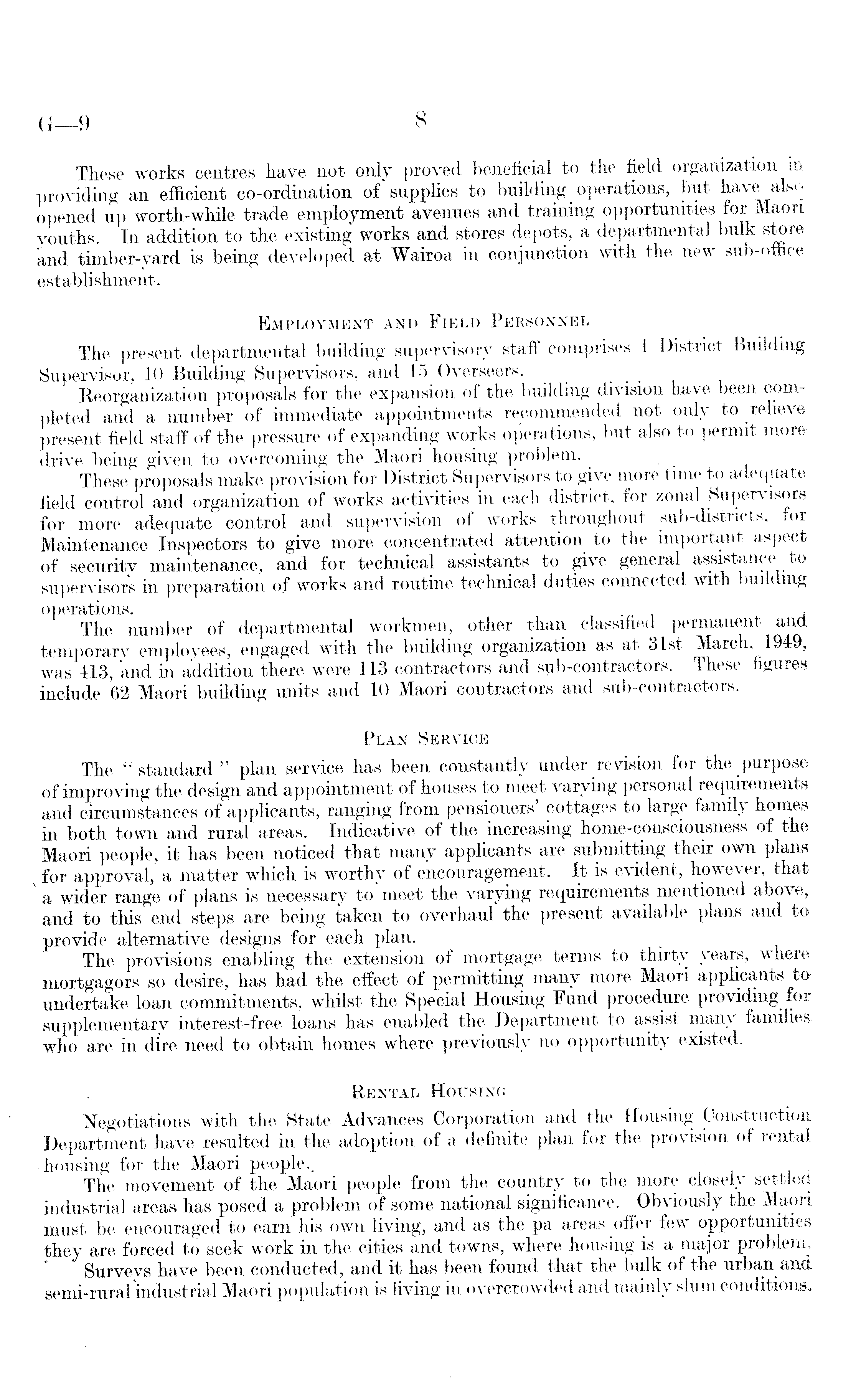 These works centres have not only proved beneficial to the field organization in providing an efficient co-ordination of supplies to building operations, but have also opened up worth-while trade employment avenues and training opportunities for Maori youths. In addition to the existing works and stores depots, a departmental bulk store and timber-yard is being developed at Wairoa in conjunction with the new sub-office establishment. Employment and Field Personnel The present departmental building supervisory staff comprises 1 District Building Supervisor, 10 Building Supervisors, and 15 Overseers. Reorganization proposals for the expansion of the building division have been completed and a number of immediate appointments recommended not only to relieve present field staff of the pressure of expanding works operations, but also to permit more drive being given to overcoming the Maori housing problem. These proposals make provision for District Supervisors to give more tune to adequate field control and organization of works activities in each district, for zonal Supervisors for more adequate control and supervision of works throughout sub-districts, for Maintenance Inspectors to give more concentrated attention to the important aspect of security maintenance, and for technical assistants to give general assistance to supervisors in preparation of works and routine technical duties connected with building operations. , The number of departmental workmen, other than classified permanent ana temporary employees, engaged with the building organization as at 31st March, 1949, was 413, and in addition there were 113 contractors and sub-contractors. These figures include 62 Maori building units and 10 Maori contractors and sub-contractors. Plan Service The " standard " plan service has been constantly under revision for the purpose of improving the design and appointment of houses to meet varying personal requirements and circumstances of applicants, ranging from pensioners' cottages to large family homes in both town and rural areas. Indicative of the increasing home-consciousness of the Maori people, it has been noticed that many applicants are submitting their own plans for approval, a matter which is worthy of encouragement: It is evident, however, that ' a wider range of plans is necessary to meet the varying requirements mentioned above, and to this end steps are being taken to overhaul the present available plans and to provide alternative designs for each plan. The provisions enabling the extension of mortgage terms to thirty years, where mortgagors so desire, has had the effect of permitting many more Maori applicants to undertake loan commitments, whilst the Special Housing Fund procedure providing for supplementary interest-free loans has enabled the Department to assist many families who are in dire need to obtain homes where previously no opportunity existed. Rental Housing Negotiations with the State Advances Corporation and the Housing Construction Department have resulted in the adoption of a definite plan for the provision of rental -housing for the Maori people.. The movement of the Maori people from the country to the more closely settled industrial areas has posed a problem of some national significance. Obviously the Maori must be encouraged to earn his own living, and as the pa areas offer few opportunities they are forced to seek work in the cities and towns, where housing is a major problem. Surveys have been conducted, and it has been found that the bulk of the urban and semi-rural industrial Maori population is living in overcrowded and mainly slum conditions.