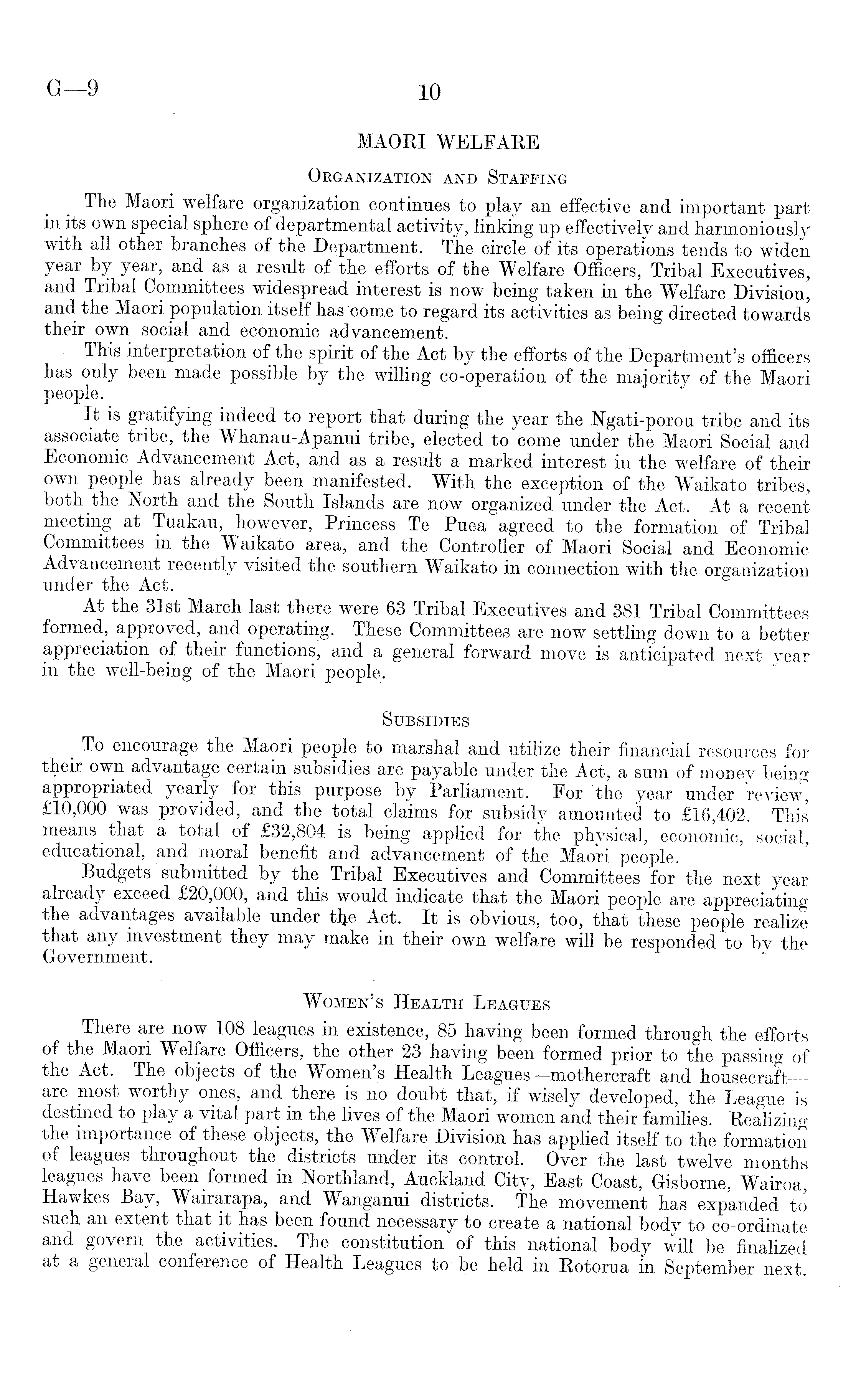 MAORI WELFARE Organization and Staffing The Maori welfare organization continues to play an effective and important part in its own special sphere of departmental activity, linking up effectively and harmoniously with all other branches of the Department. The circle of its operations tends to widen year by year, and as a result of the efforts of the Welfare Officers, Tribal Executives, and Tribal Committees widespread interest is now being taken in the Welfare Division, and the Maori population itself has come to regard its activities as being directed towards their own social and economic advancement. This interpretation of the spirit of the Act by the efforts of the Department's officers has only been made possible by the willing co-operation of the majority of the Maori people. It is gratifying indeed to report that during the year the Ngati-porou tribe and its associate tribe, the Whanau-Apanui tribe, elected to come under the Maori Social and Economic Advancement Act, and as a result a marked interest in the welfare of their own people has already been manifested. With the exception of the Waikato tribes, both the North and the South Islands are now organized under the Act. At a recent meeting at Tuakau, however, Princess Te Puea agreed to the formation of Tribal Committees in the Waikato area, and the Controller of Maori Social and Economic Advancement recently visited the southern Waikato in connection with the organization under the Act. At the 31st March last there were 63 Tribal Executives and 381 Tribal Committees formed, approved, and operating. These Committees are now settling down to a better appreciation of their functions, and a general forward move is anticipated next vear in the well-being of the Maori people. Subsidies To encourage the Maori people to marshal and utilize their financial resources for own advantage certain subsidies are payable under the Act, a sum of money being appropriated yearly for this purpose by Parliament. For the year under review, £lO,OOO was provided, and the total claims for subsidy amounted to £16,402. This means that a total of £32,804 is being applied for the physical, economic, social, educational, and moral benefit and advancement of the Maori people. Budgets submitted by the Tribal Executives and Committees for the next year already exceed £20,000, and this would indicate that the Maori people are appreciating the advantages available under tlje Act. It is obvious, too, that these people realize that any investment they may make in their own welfare will be responded to by the Government. Women's Health Leagues There are now 108 leagues in existence, 85 having been formed through the efforts of the Maori Welfare Officers, the other 23 having been formed prior to the passing of the Act. The objects of the Women's Health Leagues—mothercraft and housecraftare most worthy ones, and there is no doubt that, if wisely developed, the League is destined to play a vital part in the lives of the Maori women and their families. Realizing the importance of these objects, the Welfare Division has applied itself to the formation of leagues throughout the districts under its control. Over the last twelve months leagues have been formed in Northland, Auckland City, East Coast, Gisborne, Wairoa, Hawkes Bay, Wairarapa, and Wanganui districts. The movement has expanded to' such an extent that it has been found necessary to create a national bo.dy to co-ordinate and govern the activities. The constitution of this national body will be finalized at a general conference of Health Leagues to be held in Rotorua in September next.