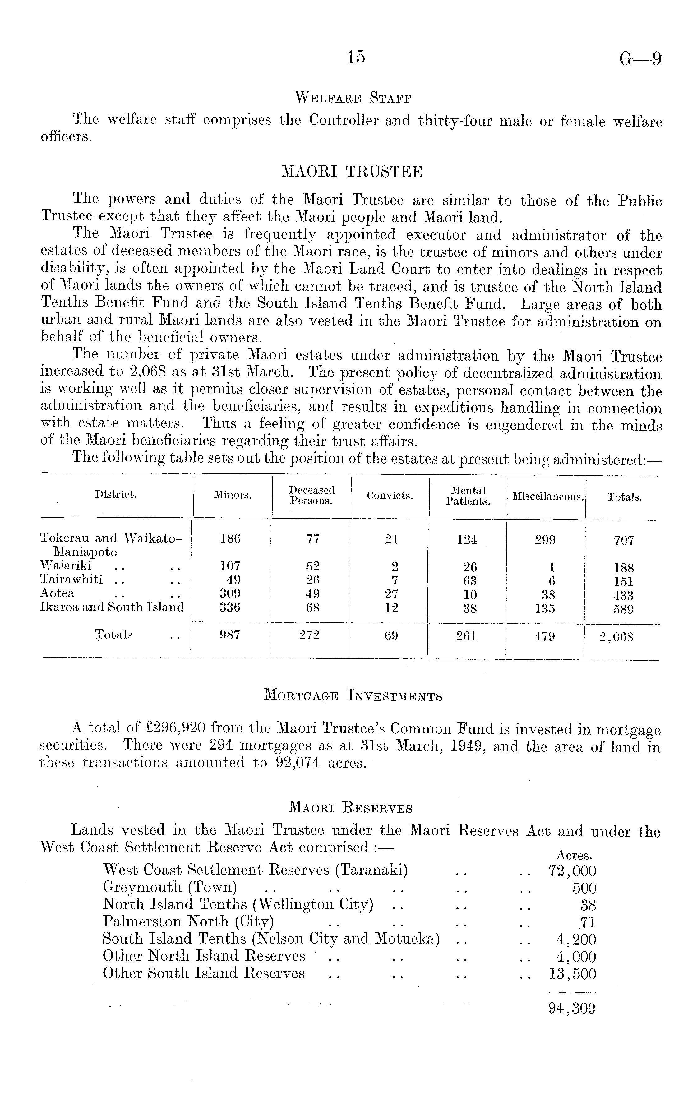Welfare Staff The welfare staff comprises the Controller and thirty-four male or female welfare officers. MAORI TRUSTEE The powers and duties of the Maori Trustee are similar to those of the Public Trustee except that they affect the Maori people and Maori land. The Maori Trustee is frequently appointed executor and administrator of the estates of deceased members of the Maori race, is the trustee of minors and others under disability, is often appointed by the Maori Land Court to enter into dealings in respect of Maori lands the owners of which cannot be traced, and is trustee of the North Island Tenths Benefit Fund and the South Island Tenths Benefit Fund. Large areas of both urban and rural Maori lands are also vested in the Maori Trustee for administration on behalf of the beneficial owners. The number of private Maori estates under administration by the Maori Trustee increased to 2,068 as at 31st March. The present policy of decentralized administration is working well as it permits closer supervision of estates, personal contact between the administration and the beneficiaries, and results in expeditious handling in connection with estate matters. Thus a feeling of greater confidence is engendered in the minds of the Maori beneficiaries regarding their trust affairs. The following table sets out the position of the estates at present being administered:—