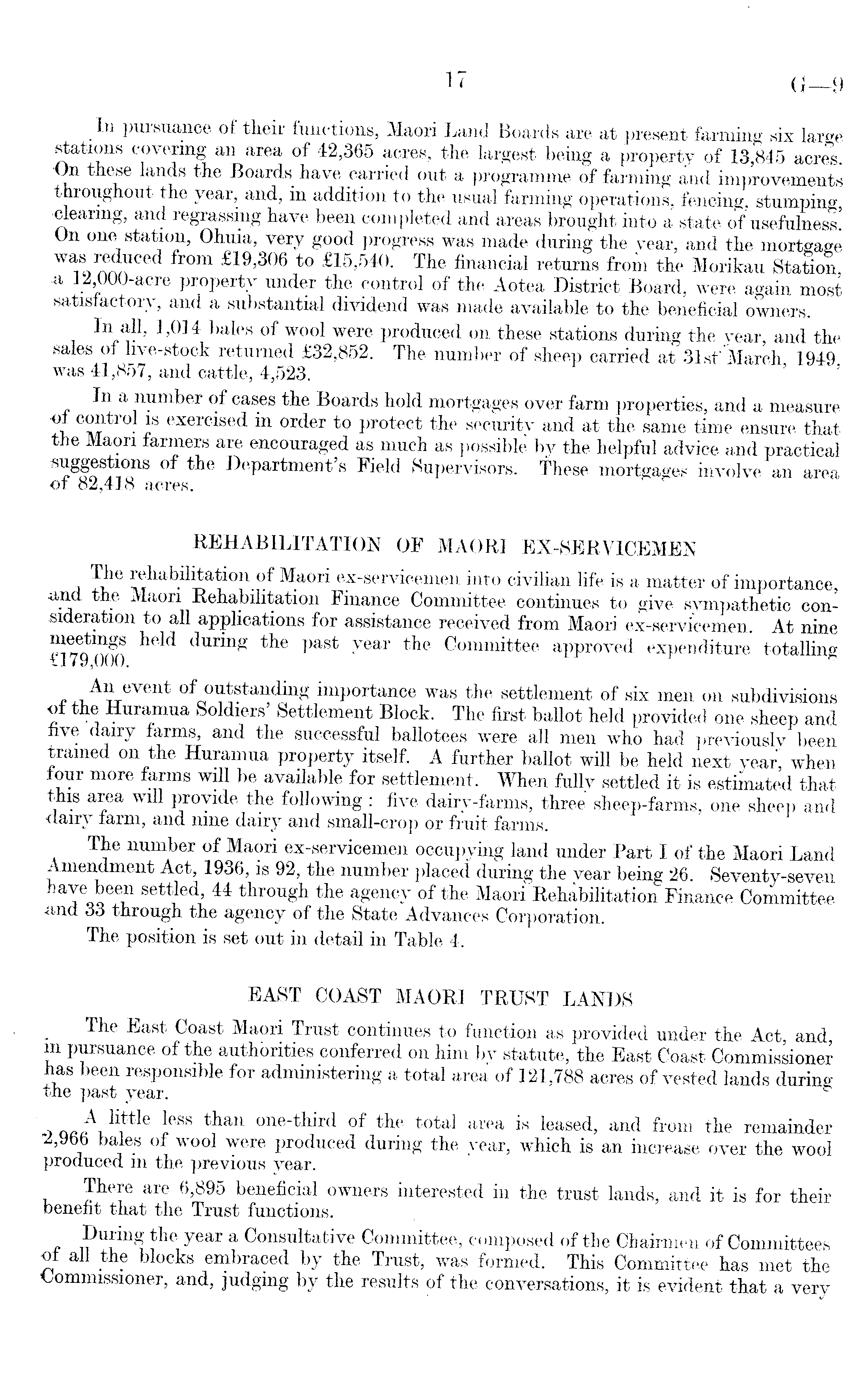 In puisuance of their functions, Maori Land Boards are at present farming six large stations covering an area of 42,365 acres, the largest being a property of 13,845 acres. On these lands the Boards have carried out a programme of farming and improvements throughout the year, and, in addition to the usual farming operations, fencing, stumping •clearing, and regrassing have been completed and areas brought into a state of usefulness! On one station, Ohuia, very good progress was made during the year, and the mortgage was reduced from £19,306 to £15,540. The financial returns from the Morikau Station a 12 000-acre property under the control of the Aotea District Board, were again most satisfactory, and a substantial dividend was made available to the beneficial owners. In all, 1,014 bales of wool were produced on these stations during the vear, and the sales of live-stock returned £32,852. The number of sheep carried at 31st' March 1949 was 41,857, and cattle, 4,523. ' ' In a number of cases the Boards hold mortgages over farm properties, and a measure of control is exercised m order to protect the security and at the same time ensure that the Maori farmers are encouraged as much as possible by the helpful advice and practical S ' l . g £ ff^° nS Department's Field Supervisors. These mortgages involve an area of 82,418 acres. REHABILITATION OF MAORI EX-SERVICEMEN rehabilitation of Maori ex-servicemen into civilian life is a matter of importance, -and the Maori Rehabilitation Finance Committee continues to give sympathetic consideration to all applications for assistance received from Maori ex-servicemen. At nine during the past year the Committee approved expenditure totalling » t/jV/UU. A T T eVent im P ortance w as the settlement of six men on subdivisions of the Huramua Soldiers' Settlement Block. The first ballot held provided one sheep and five dairy farms, and the successful ballotees were all men who had previously been trained on the Huramua property itself. A further ballot will be held next year, when four more farms will be available for settlement. When fully settled it is estimated that this area will provide the following : five dairy-farms, three sheep-farms, one sheep and dairy farm, and nine dairy and small-crop or fruit farms. The number of Maori ex-servicemen occupying land under Part I of the Maori Land Amendment Act, 1936, is 92, the number placed during the vear being 26. Seventy-seven have been settled, 44 through the agency of the Maori Rehabilitation Finance Committee and 33 through the agency of the State Advances Corporation. The position is set out in detail in Table 4. EAST COAST MAORI TRUST LANDS The East Coast Maori Trust continues to function as provided under the Act and m pursuance of the authorities conferred on him by statute, the East Coast Commissioner has been responsible for administering a total area of 121,788 acres of vested lands during the past year. less th an one-third of the total area is leased, and from the remainder 2,966 bales of wool were produced during the year, which is an increase over the wool produced m the previous year. There are 6,895 beneficial owners interested in the trust lands, and it is for their benefit that the Trust functions. During the year a Consultative Committee, composed of the Chairmen of Committees of all the blocks embraced by the Trust, was formed. This Committee has met the Commissioner, and, judgmg by the results of the conversations, it is evident that a very