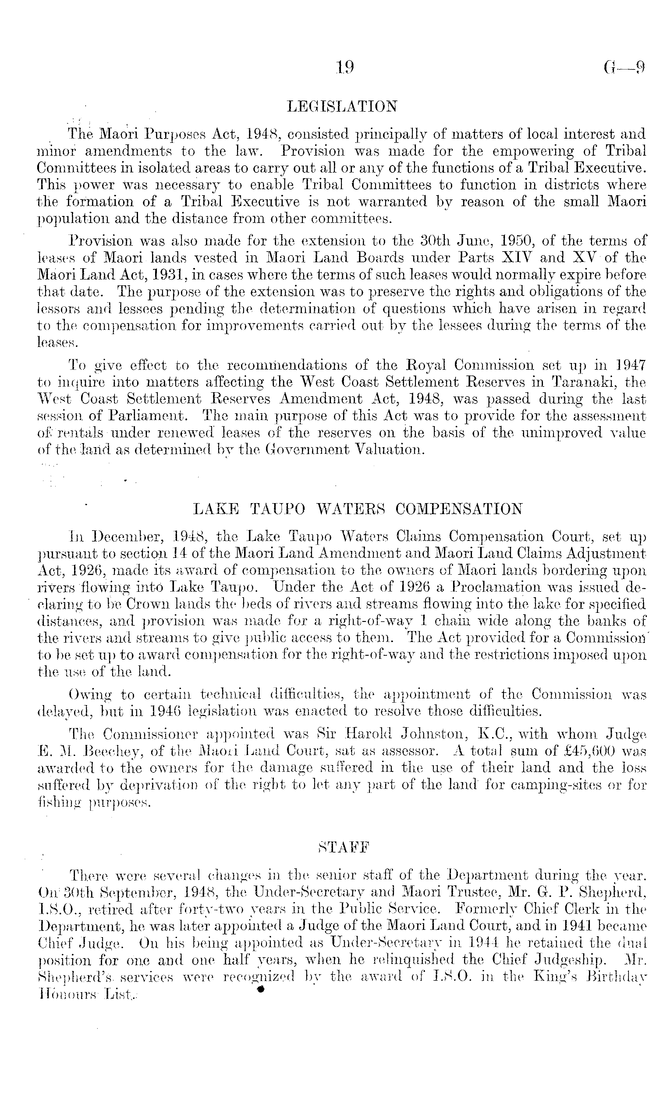 LEGISLATION The Maori Purposes Act, 1948, consisted principally of matters of local interest and minor amendments to the law. Provision was made for the empowering of Tribal Committees in isolated areas to carry out all or any of the functions of a Tribal Executive. This power Was .necessary to enable Tribal Committees to function in districts where the formation of a Tribal Executive is not warranted by reason of the small Maori population and the distance from other committees. Provision was also made for the extension to the 30th June, 1950, of the terms of leases of Maori lands vested in Maori Land Boards under Parts XIY and XV of the Maori Land Act, 1931, in cases where the terms of such leases would normally expire before that date. The purpose of the extension was to preserve the rights and obligations of the lessors and lessees pending the determination of questions which, have arisen in regard to the compensation for improvements carried out by the lessees during the terms of the leases. To give effect to the recommendations of the Royal Commission set up in 1947 to inquire into matters affecting the West Coast Settlement Reserves in Taranaki, the West Coast Settlement Reserves Amendment Act, 1948, was passed during the last session of Parliament. The main purpose of this Act was to provide for the assessment of. rentals under renewed leases of the reserves on the basis of the unimproved value of the land as determined by the Government Valuation. LAKE TAUPO WATERS COMPENSATION In December, 1948, the Lake Taupo Waters Claims Compensation Court, set up pursuant to section 14 of the Maori Land Amendment and Maori Land Claims Adjustment Act, 1926, made its award of compensation to the owners of Maori lands bordering upon rivers flowing into Lake Taupo. Under the Act of 1926 a Proclamation was issued declaring to fee Crown lands the beds of rivers and streams flowing into the lake for specified distances, and provision was made for a right-of-way 1 chain wide along the banks of the rivers and streams to give public access to them. The Act provided for a Commission' to be set up to award compensation for the right-of-way and the restrictions imposed upon the use of the land. Owing to certain technical difficulties, the appointment of the Commission was delayed, but in 1946 legislation was enacted to resolve those difficulties. The Commissioner appointed was Sir Harold Johnston, K.C., with whom Judge E..M. Beechey, of the Maori Land Court, sat as assessor. A total sum of £45,600 was awarded to the owners for the damage suffered in the use of their land and the loss suffered by deprivation of the right to let any part of the land' for camping-sites or for fishing purposes. STAFF There were several changes in the senior staff of the Department during the year. On 30th September, 1948, the Under-Secretary and Maori Trustee, Mr. G. P. Shepherd, 1.5.0., retired after forty-two years in the Public Service. Formerly Chief Clerk in the Department* he was later appointed a Judge of the Maori Land Court, and in 1941 became Chief Judge. On his being appointed as Under-Secretary in 1944 he retained the dual position for one and one half years, when he relinquished the Chief Judgeship. Mr. Shepherd's: services were recognized by the award of 1.5.0. in the King's Birthday Honours List..: #
