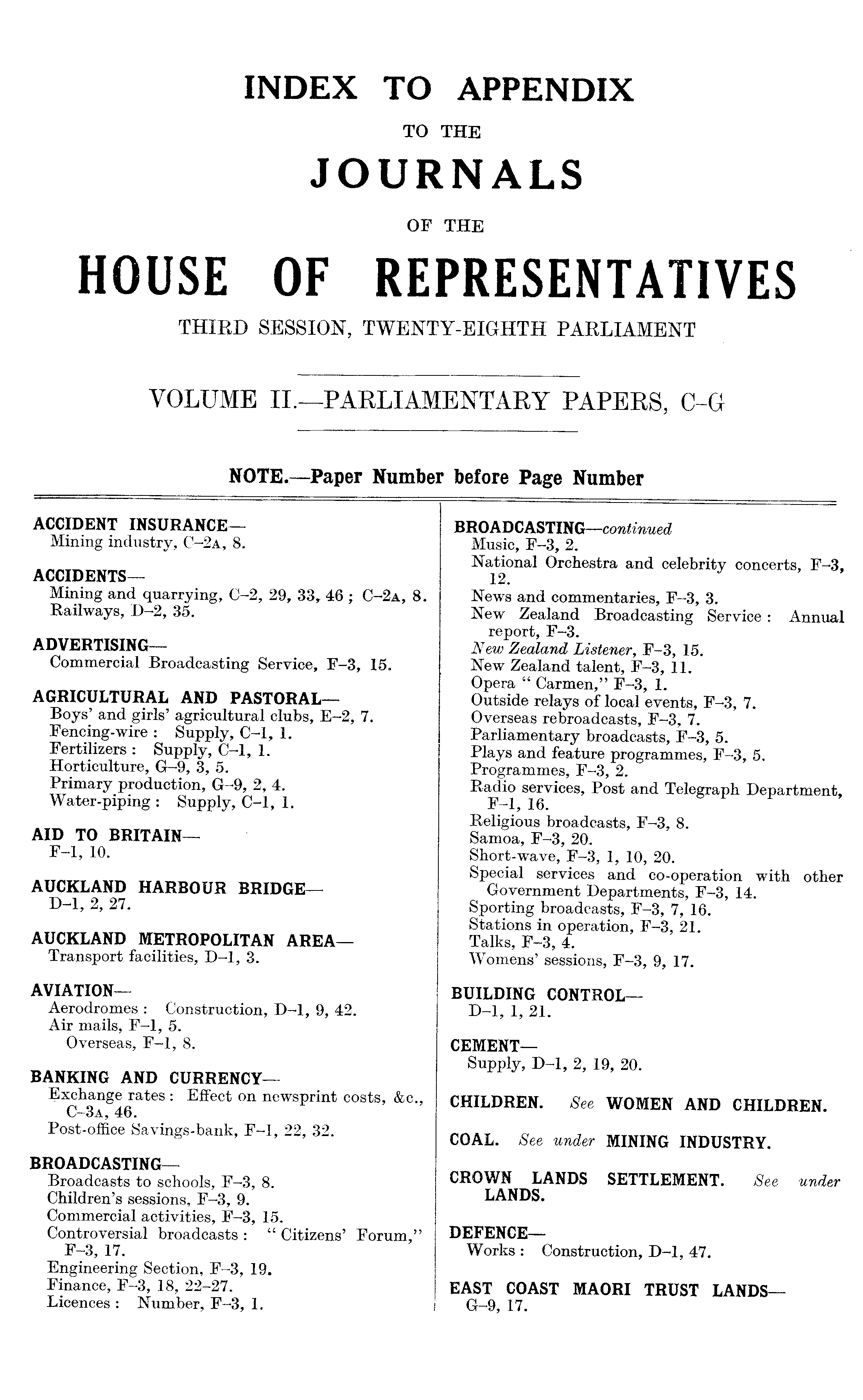 ACCIDENT INSURANCE— Mining industry, C-2a, 8. ACCIDENTS— Mining and quarrying, C-2, 29, 33, 46 ; C-2a, 8. Railways, D-2, 35. ADVERTISING— Commercial Broadcasting Service, F-3, 15. AGRICULTURAL AND PASTORAL— Boys' and girls' agricultural clubs, E-2, 7. Fencing-wire : Supply, C-l, 1. Fertilizers : Supply, C-l, 1. Horticulture, G-9, 3, 5. Primary production, G-9, 2, 4. Water-piping : Supply, C-l, 1. AID TO BRITAIN— F-l, 10. AUCKLAND HARBOUR BRIDGE—- „ D-l, 2, 27. AUCKLAND METROPOLITAN AREA— Transport facilities, D-l, 3. AVIATION— Aerodromes : Construction, D-l, 9, 42. Air mails, F-l, 5. Overseas, F-l, 8. BANKING AND CURRENCY— Exchange rates : Effect on newsprint costs, &c., C-3a, 46. Post-office Savings-bank, F-l, 22, 32. BROADCASTING— Broadcasts to schools, F-3, 8. Children's sessions, F-3, 9. Commercial activities, F-3, 15. Controversial broadcasts : " Citizens' Forum," F-3, 17. Engineering Section, F-3, 19. Finance, F-3, 18, 22-27. Licences : Number, F-3, 1.