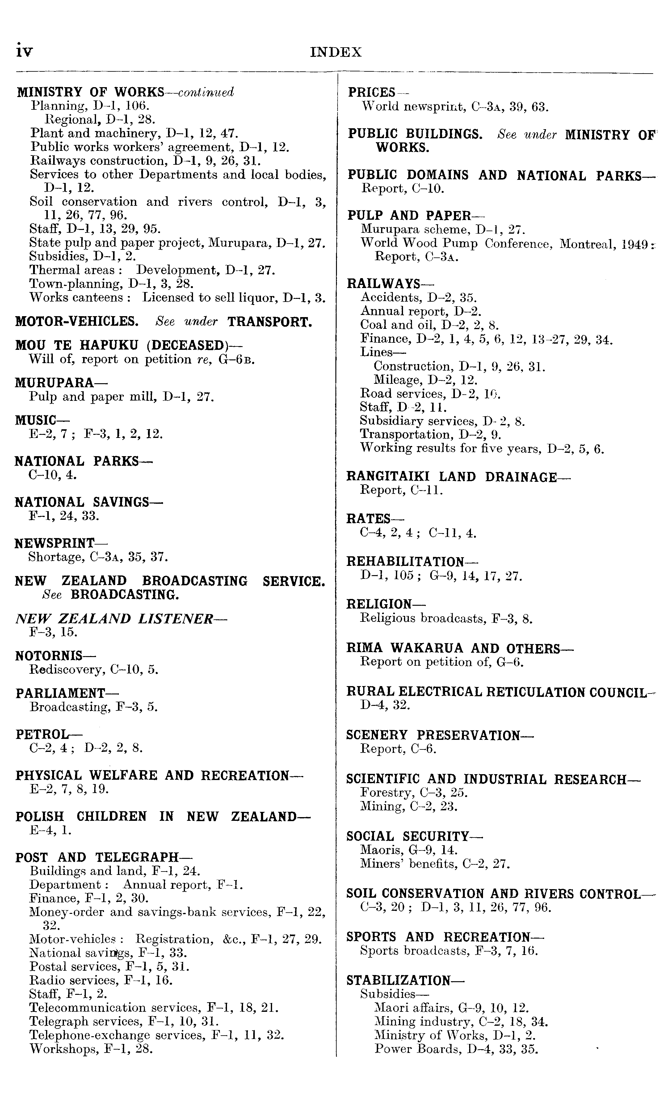 PRICES - World newsprint, C-3a, 39, 63. PUBLIC BUILDINGS. See under MINISTRY OF WORKS. PUBLIC DOMAINS AND NATIONAL PARKS— Report, C-10. PULP AND PAPER— Murupara scheme, D-l, 27. World Wood Pump Conference, Montreal, 1949 r Report, C-3a. RAILWAYS Accidents, D-2, 35. Annual report, D-2. Coal and oil, D-2, 2, 8. Finance, D-2, 1, 4, 5, 6, 12, 13-27, 29, 34. Lines— Construction, D-l, 9, 26, 31. Mileage, D-2, 12. Road services, D-2, 10. Staff, D -2, 11. Subsidiary services, D- 2, 8. Transportation, D-2, 9. Working results for five years, D-2, 5, 6. RANGITAIKI LAND DRAINAGE— Report, C—ll. RATES— C-4, 2, 4; 0-11,4. REHABILITATION— D-l, 105; G-9, 14, 17, 27. RELIGION— Religious broadcasts, F-3, 8. RIMA WAKARUA AND OTHERS— Report on petition of, G-6. RURAL ELECTRICAL RETICULATION COUNCIL-D-4, 32. SCENERY PRESERVATION— Report, C-6. SCIENTIFIC AND INDUSTRIAL RESEARCH— Forestry, C-3, 25. Mining, C-2, 23. SOCIAL SECURITY— Maoris, G-9, 14. Miners' benefits, C-2, 27. SOIL CONSERVATION AND RIVERS CONTROL— C-3, 20; D-l, 3, 11, 26, 77, 96. SPORTS AND RECREATION— Sports broadcasts, F-3, 7, 16. STABILIZATION— Subsidies— Maori affairs, G-9, 10, 12. Mining industry, C-2, 18, 34. Ministry of Works, D-l, 2. Power Boards, D-4, 33, 35.