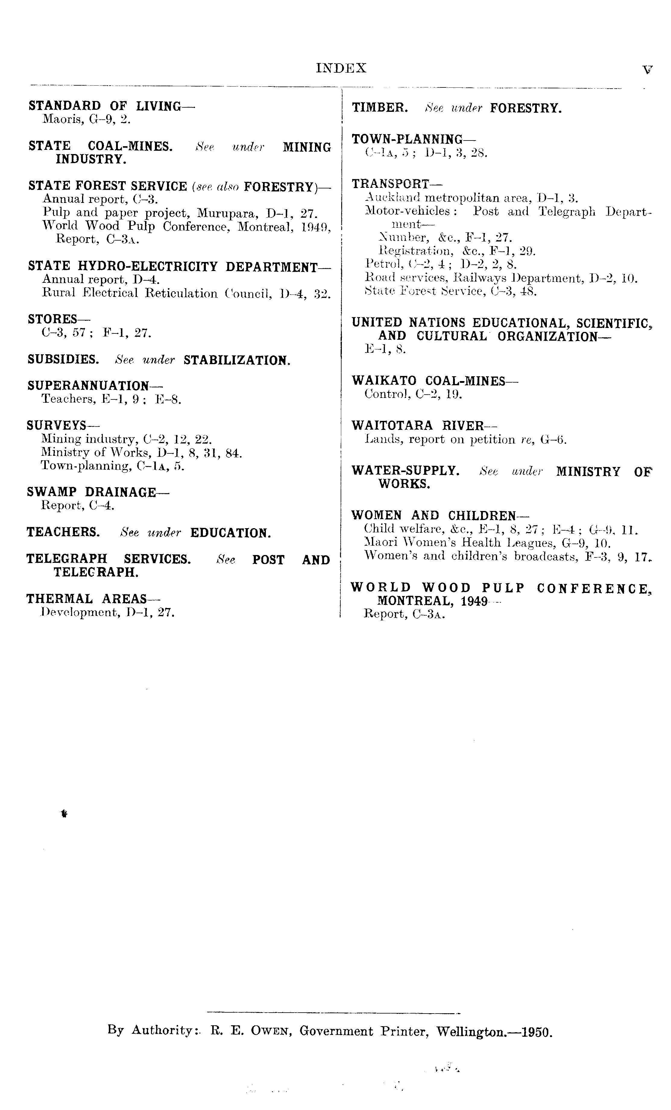 STANDARD OF LIVING— Maoris, G-9, 2. STATE COAL-MINES. See under MINING INDUSTRY. STATE FOREST SERVICE (see also FORESTRY)— Annual report, C-3. Pulp and paper project, Murupara, D-l, 27. World Wood Pulp Conference, Montreal, 1949, Report, C-3a. STATE HYDRO-ELECTRICITY DEPARTMENT— Annual report, D-4. Rural Electrical Reticulation Council, D-4, 32. STORES— C-3, 57 ; F-l, 27. SUBSIDIES. See under STABILIZATION. SUPERANNUATION— Teachers, E-l, 9 ; E-8. SURVEYS— Mining industry, C-2, 12, 22. Ministry of Works, D-l, 8, 31, 84. Town-planning, C-la, 5. SWAMP DRAINAGE— Report, C-4. TEACHERS. See under EDUCATION. TELEGRAPH SERVICES. See POST AND TELEGRAPH. THERMAL AREAS— Development, D-l, 27.