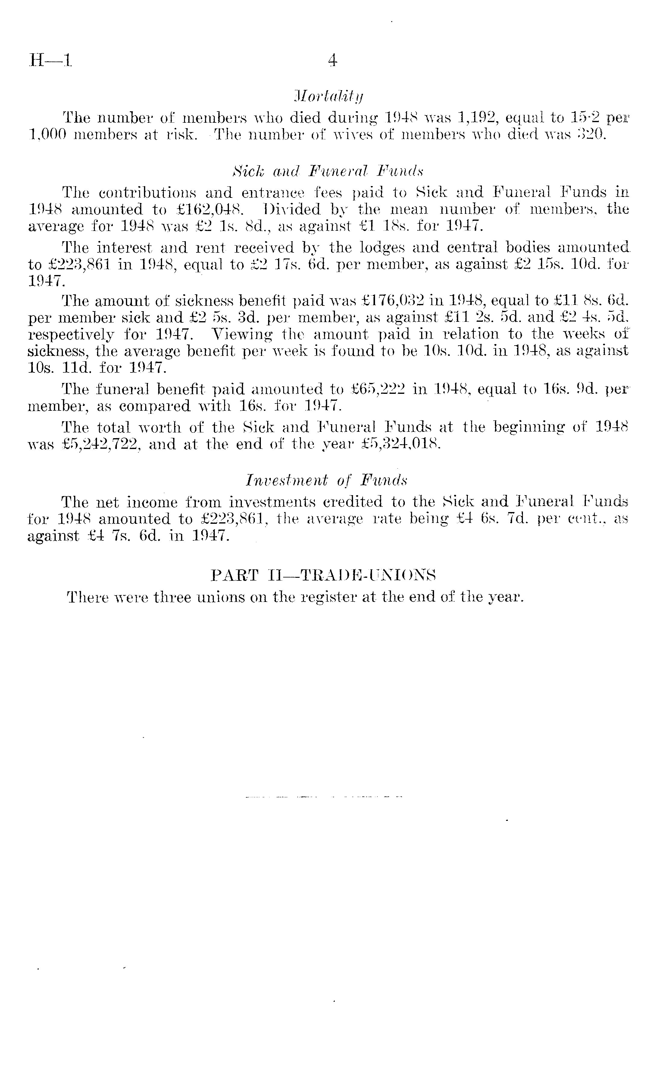 Mortality The number of members who died during 1948 was 1,192, equal to 15-2 per 1,000 members at risk. The number of wives of members who died was 320. Sick and Funeral Funds The contributions and entrance fees paid to Sick' and Funeral Funds in 1948 amounted to £162,048. Divided by the mean number of members, the average for 1948 was £2 Is. Bd., as against £1 18s. for 1947. The interest and rent received by the lodges and central bodies amounted to £223,861 in 1948, equal to £2 17s. 6d. per member, as against £2 15s. lOd. for 1947. The amount of sickness benefit paid was £176,032 in 1948, equal to £ll Bs. 6d. per member sick and £2 ss. 3d. per member, as against £ll 2s. sd. and £2 4s. sd. respectively for 1947. Viewing the amount paid in relation to the weeks of sickness, the average benefit per week is found to be 10s. lOd. in 1948, as against 10s. lid. for 1947. The funeral benefit paid amounted to £65,222 in 1948, equal to 16s. 9d. per member, as compared with 16s. for 1947. The total worth of the Sick and Funeral Funds at the beginning of 1948 was £5,242,722, and at the end of the year £5,324,018. Investment of Funds The net income from investments credited to the Sick and Funeral Funds for 1948 amounted to £223,861, the average rate being £4 6s. 7d. per cent., as against £4 7s. 6d. in 1947. PART lI—TRADE-UNIONS There were three unions on the register at the end of the year.