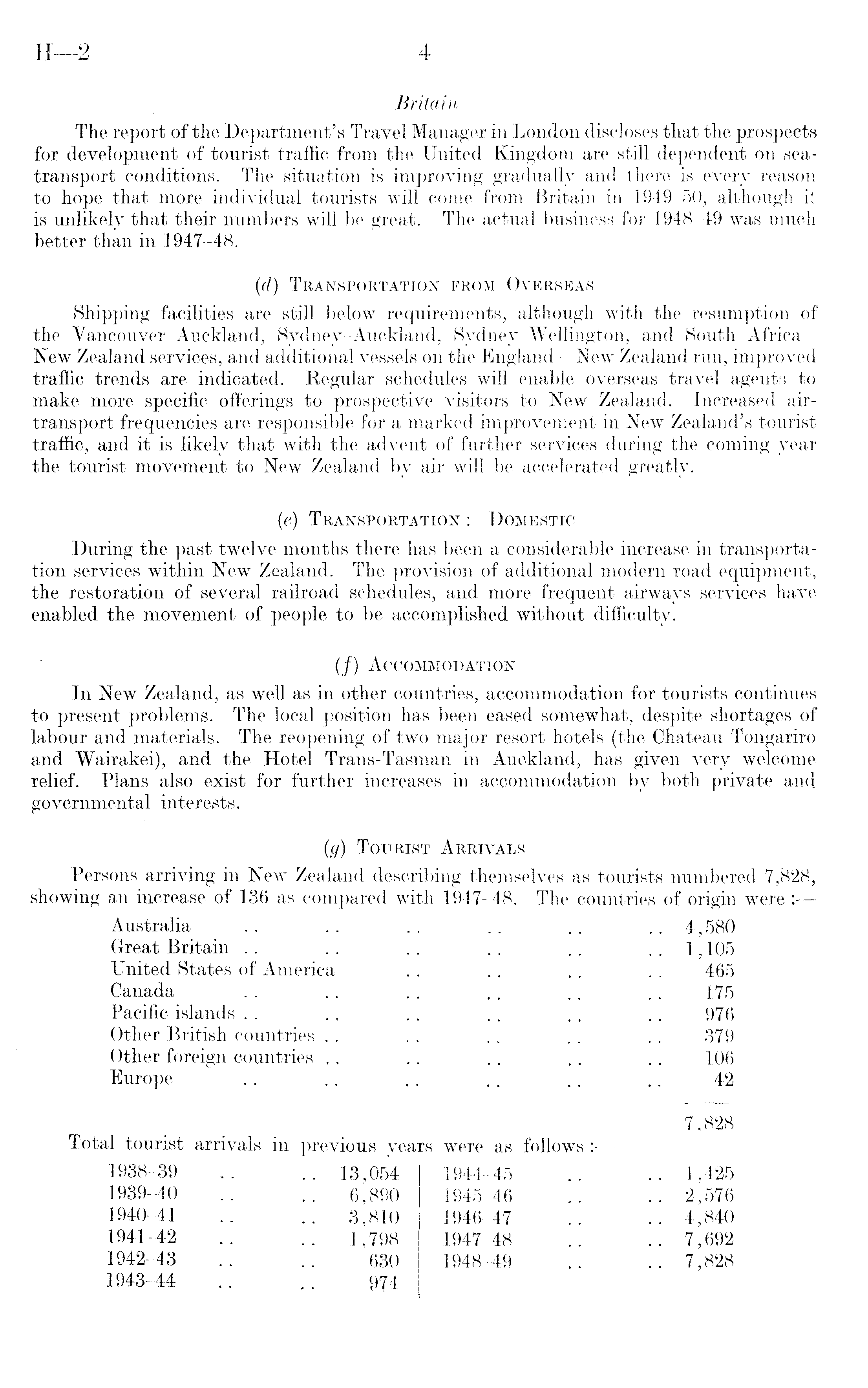 Britain The report of the Department's Travel Manager in London discloses that the prospects for development of tourist traffic from the United Kingdom are still dependent on seatransport conditions. The situation is improving gradually and there is every reason to hope that more individual tourists will come from Britain in 1949-50, although it is unlikely that their numbers will be great. The actual business for 1948-49 was much better than in 1947-48. (d) Transportation from Overseas Shipping facilities are still below requirements, although with the resumption of the Vancouver-Auckland, Sydney-Auckland, Sydney-Wellington, and South Africa - New Zealand services, and additional vessels on the England - New Zealand run, improved traffic trends are indicated. Kegular schedules will enable overseas travel agents to make more specific offerings to prospective visitors to New Zealand. Increased airtransport frequencies are responsible for a marked improvement in New Zealand's tourist traffic, and it is likely that with the advent of further services during the coming year the tourist movement to New Zealand by air will be accelerated greatly. (e) Transportation : Domestic During the past twelve months there has been a considerable increase in transportation services within New Zealand. The provision of additional modern road equipment, the restoration of several railroad schedules, and more frequent airways services have enabled the movement of people to be accomplished without difficulty. (/) Accommodation In New Zealand, as well as in other countries, accommodation for tourists continues to present problems. The local position has been eased somewhat, despite shortages of labour and materials. The reopening of two major resort hotels (the Chateau Tongariro and Wairakei), and the Hotel Trans-Tasman in Auckland, has given very welcome relief. Plans also exist for further increases in accommodation by both private and governmental interests. (g) Tourist Arrivals Persons arriving in New Zealand describing themselves as tourists numbered 7,828, showing an increase of 136 as compared with 1947-48. The countries of origin were : Australia .. .. .. .. .. .. 4,580 Great Britain .. .. .. .. .. • • 1,105 United States of America .. .. .. .. 465 Canada .. .. .. ~ .. .. 175 Pacific islands .. .. .. .. .. .. 976 Other British countries .. .. .. .. .. 379 Other foreign countries . . . . .. .. .. 106 Europe .. .. ~ .. .. .. 42 7,828 Total tourist arrivals in previous years were as follows : 1938-39 .. .. 13,054 1944-45 .. .. 1,425 1939-40 .. .. 6,890 1945-46 .. .. 2,576 1940-41 .. .. 3,810 1946-47 .. .. 4,840 1941-42 .. .. 1,798 1947-48 .. .. 7,692 1942-43 .. .. 630 1948-49 .. .. 7,828 1943-44 ~ .. 974