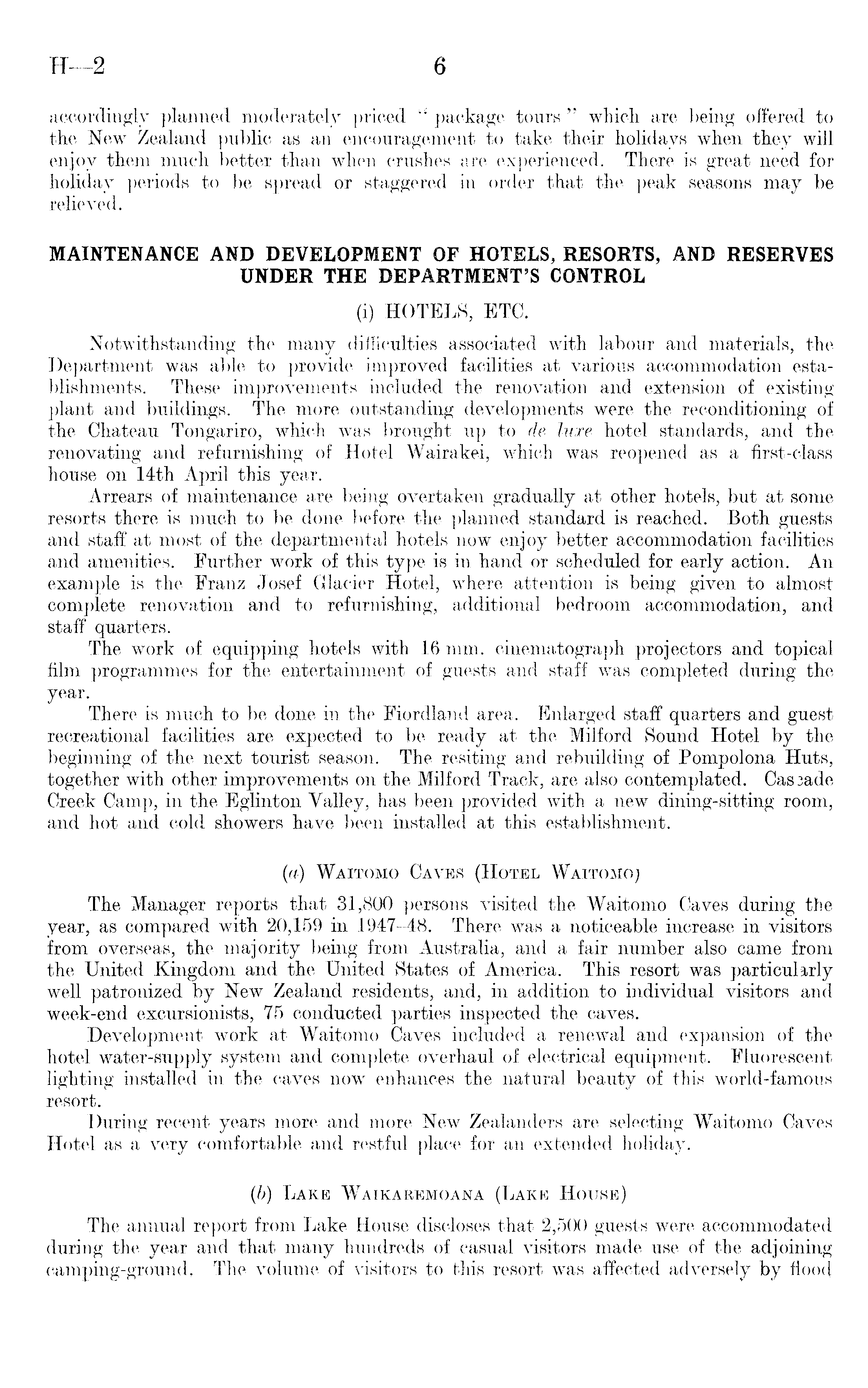 accordingly planned moderately priced " package tours " which are being offered to the New Zealand public as an encouragement to take their holidays when they will enjoy them much better than when crushes are experienced. There is great need for holiday periods to be spread or staggered in order that the peak seasons may be relieved. MAINTENANCE AND DEVELOPMENT OF HOTELS, RESORTS, AND RESERVES UNDER THE DEPARTMENT'S CONTROL (i) HOTELS, ETC. Notwithstanding the many difficulties associated with labour and materials, the Department was able to provide improved facilities at various accommodation establishments. These improvements included the renovation and extension of existing plant and buildings. The more outstanding developments were the reconditioning of the Chateau Tongariro, which was brought up to de luxe hotel standards, and the renovating and refurnishing of Hotel Wairakei, which was reopened as a first-class house on 14th April this year. Arrears of maintenance are being overtaken gradually at other hotels, but at some resorts there is much to be done before the planned standard is reached. Both guests and staff at most of the departmental hotels now enjoy better accommodation facilities and amenities. Further work of this type is in hand or scheduled for early action. An example is the Franz Josef Glacier Hotel, where attention is being given to almost complete renovation and to refurnishing, additional bedroom accommodation, and staff quarters. The work of equipping hotels with 16 mm. cinematograph projectors and topical film programmes for the entertainment of guests and staff was completed during the year. There is much to be done in the Fiordland area. Enlarged staff quarters and guest recreational facilities are expected to be ready at the Milford Sound Hotel by the beginning of the next tourist season. The resiting and rebuilding of Pompolona Huts, together with other improvements on the Milford Track, are also contemplated. Cas3ade Creek Camp, in the Eglinton Valley, has been provided with a new dining-sitting room, and hot and cold showers have been installed at this establishment. (a) Waitomo Caves (Hotel Waitomoj The Manager reports that 31,800 persons visited the Waitomo Caves during the year, as compared with 20,159 in 1947-48. There was a noticeable increase in visitors from overseas, the majority being from Australia, and a fair number also came from the United Kingdom and the United States of America. This resort was particularly well patronized by New Zealand residents, and, in addition to individual visitors and week-end excursionists, 75 conducted parties inspected the caves. Development work at Waitomo Caves included a renewal and expansion of the hotel water-supply system and complete overhaul, of electrical equipment. Fluorescent lighting installed in the caves now enhances the natural beauty of this world-famous resort. During recent years more and more New Zealanders are selecting Waitomo Caves Hotel as a very comfortable and restful place for an extended holiday. (b) Lake Waikaremoana (Lake House) The annual report from Lake House discloses that 2,500 guests were accommodated during the year and that many hundreds of casual visitors made use of the adjoining camping-ground, The volume of visitors to this resort was affected adversely by flood