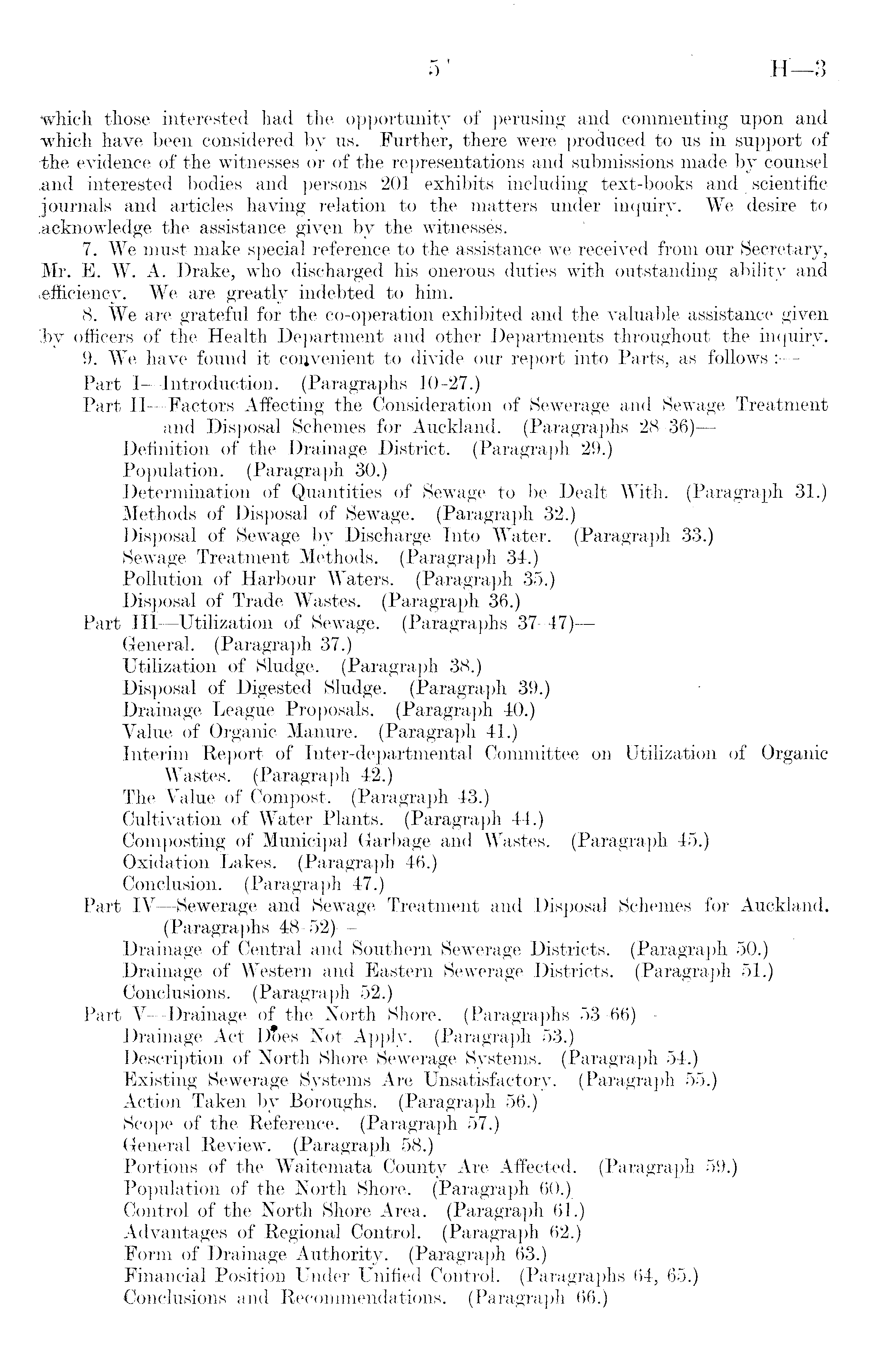 which those interested had the opportunity of perusing and commenting upon and which have been considered by us. Further, there were produced to us in support of the evidence of the witnesses or of the representations and submissions made by counsel .and interested bodies and persons 201 exhibits including text-books and scientific journals and articles having relation to the matters under inquiry. We desire to .acknowledge the assistance given by the witnesses. 7. We must make special reference to the assistance we received from our Secretary, Mr. E. W. A. Drake, who discharged his onerous duties with outstanding ability and .efficiency. We are greatly indebted to him. 8. We are grateful for the co-operation exhibited and the valuable assistance given lay officers of the Health Department and other Departments throughout the inquiry. 9. We have found it convenient to divide our report into Parts, as follows : Part I—lntroduction. (Paragraphs 10-27.) Part ll—Factors Affecting the Consideration of Sewerage and Sewage Treatment and Disposal Schemes for Auckland. (Paragraphs 28-36) — Definition of the Drainage District. (Paragraph 29.) Population. (Paragraph 30.) Determination of Quantities of Sewage to be Dealt With. (Paragraph 31.) Methods of Disposal of Sewage. (Paragraph 32.) Disposal of Sewage by Discharge Into Water. (Paragraph 33.) Sewage Treatment Methods. (Paragraph 34.) Pollution of Harbour Waters. (Paragraph 35.) Disposal of Trade Wastes. (Paragraph 36.) Part III —Utilization of Sewage. (Paragraphs 37-47) —- General. (Paragraph 37.) Utilization of Sludge. (Paragraph 38.) Disposal of Digested Sludge. (Paragraph 39.) Drainage League Proposals. (Paragraph 40.) Value of Organic Manure. (Paragraph 41.) Interim Report of Inter-departmental Committee on Utilization of Organic Wastes. (Paragraph 42.) The Value of Compost. (Paragraph 43.) Cultivation of Water Plants. (Paragraph 44.) Composting of Municipal Garbage and Wastes. (Paragraph 45.) Oxidation Lakes. (Paragraph 46.) Conclusion. (Paragraph 47.) Part IV —Sewerage and Sewage Treatment and Disposal Schemes for Auckland. (Paragraphs 48-52) — Drainage of Central and Southern Sewerage Districts. (Paragraph 50.) Drainage of Western and Eastern Sewerage Districts. (Paragraph 51.) Conclusions. (Paragraph 52.) Part V—Drainage of the North Shore. (Paragraphs 53-66) — Drainage Act D?>es Not Apply. (Paragraph 53.) Description of North Shore Sewerage Systems. (Paragraph 54.) Existing Sewerage Systems Are Unsatisfactory. (Paragraph 55.) Action Taken by Boroughs. (Paragraph 56.) Scope of the Reference. (Paragraph 57.) General Review. (Paragraph 58.) Portions of the Waitemata County Are Affected. (Paragraph 59.) Population of the North Shore. (Paragraph 60.) Control of the North Shore Area. (Paragraph 61.) Advantages of Regional Control. (Paragraph 62.) Form of Drainage Authority. (Paragraph 63.) Financial Position Under Unified Control. (Paragraphs 64, 65.) Conclusions and Recommendations. (Paragraph 66.)