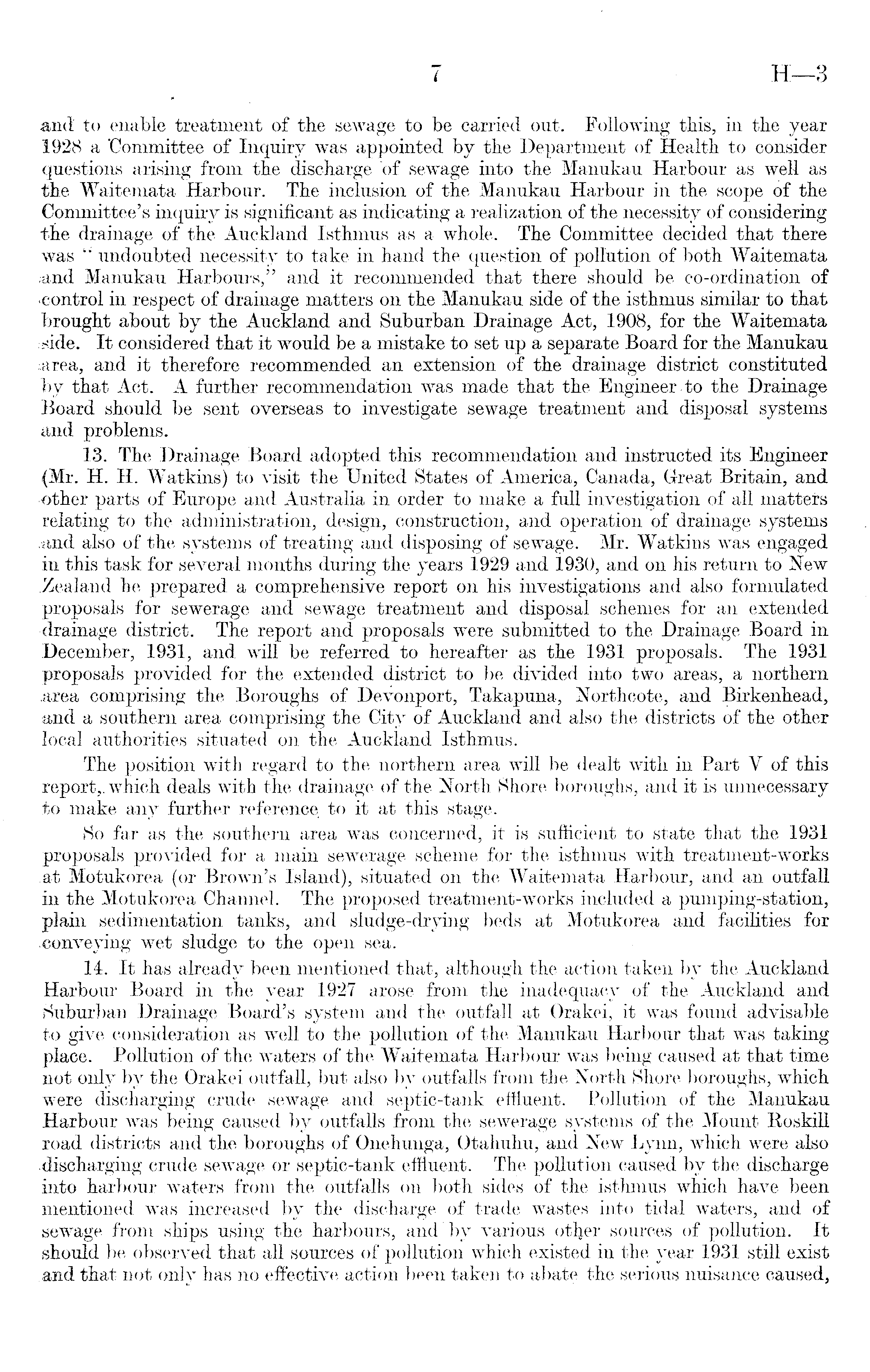 and to enable treatment of the sewage to be carried out. Following this, in the year 1928 a 'Committee of Inquiry was appointed by the Department of Health to consider questions arising from the discharge of sewage into the Manukau Harbour as weM as the Waitemata Harbour. The inclusion of the Manukau Harbour in the scope of the Committee's inquiry is significant as indicating a realization of the necessity of considering the drainage of the Auckland Isthmus as a whole. The Committee decided that there was " undoubted necessity to take in hand the question of pollution of both Waitemata ;and Manukau Harbours," and it recommended that there should be co-ordination of 'Control in respect of drainage matters on the Manukau side of the isthmus similar to that brought about by the A uc kland and Suburban Drainage Act, 1908, for the Waitemata ■side. It considered that it would be a mistake to set up a separate Board for the Manukau. .area, and it therefore recommended an extension of the drainage district constituted by that Act. A further recommendation was made that the Engineer to the Drainage Board should be sent overseas to investigate sewage treatment and disposal systems and problems. 13. The Drainage Board adopted this recommendation and instructed its Engineer (Mr. H. H. Watkins) to visit the United States of America, Canada, Great Britain, and other parts of Europe and Australia in order to make a full investigation of all matters relating to the administration, design, construction, and operation of drainage systems .and also of the systems of treating and disposing of sewage. Mr. Watkins was engaged in this task for several months during the years 1929 and 1930, and on his return to New .Zealand he prepared a comprehensive report on his investigations and also formulated proposals for sewerage and sewage treatment and disposal schemes for an extended drainage district. The report and proposals were submitted to the Drainage Board in December, 1931, and will be referred to hereafter as the 1931 proposals. The 1931 proposals provided for the extended district to be divided into two areas, a northern .area comprising the Boroughs of Devonport, Takapuna, Northcote, and Birkenhead, and a southern area comprising the City of Auckland and also the districts of the other local authorities situated on the Auckland Isthmus. The position with regard to the northern area will be dealt with in Part V of this report,, which deals with the drainage of the North Shore boroughs, and it is unnecessary to make any further reference to it at this stage. So far as the southern area was concerned, it is sufficient to state that the 1931 proposals provided for a main sewerage scheme for the isthmus with treatment-works at Motukorea (or Brown's Island), situated on the Waitemata Harbour, and an outfall in the Motukorea Channel. The proposed treatment-works included a pumping-station, plain sedimentation tanks, and sludge-drying beds at Motukorea and facilities for .conveying wet sludge to the open sea. 14. It has already been mentioned that, although the action taken by the Auckland Harbour Board in the year 1927 arose from the inadequacy of the Auckland and .Suburban Drainage Board's system and the outfall at Orakei, it was found advisable to give consideration as well to the pollution of the Manukau Harbour that was taking place. Pollution of the waters of the Waitemata Harbour was being caused at that time not only by the Orakei outfall, but also by outfalls from the North Shore boroughs, which were discharging crude sewage and septic-tank effluent. Pollution of the Manukau Harbour was being caused by outfalls from the sewerage systems of the Mount Roskill road districts and the boroughs of Onehunga, Otahuhu, and New Lynn, which were also discharging crude sewage or septic-tank effluent. The pollution caused by the discharge into harbour waters from the outfalls on both sides of the isthmus which have been mentioned was increased by the discharge of trade wastes into tidal waters, and of sewage from ships using the harbours, and'by various otljer sources of pollution. It should be observed that all sources of pollution which existed in the year 1931 still exist and that not only has no effective action been taken to abate the serious nuisance caused,