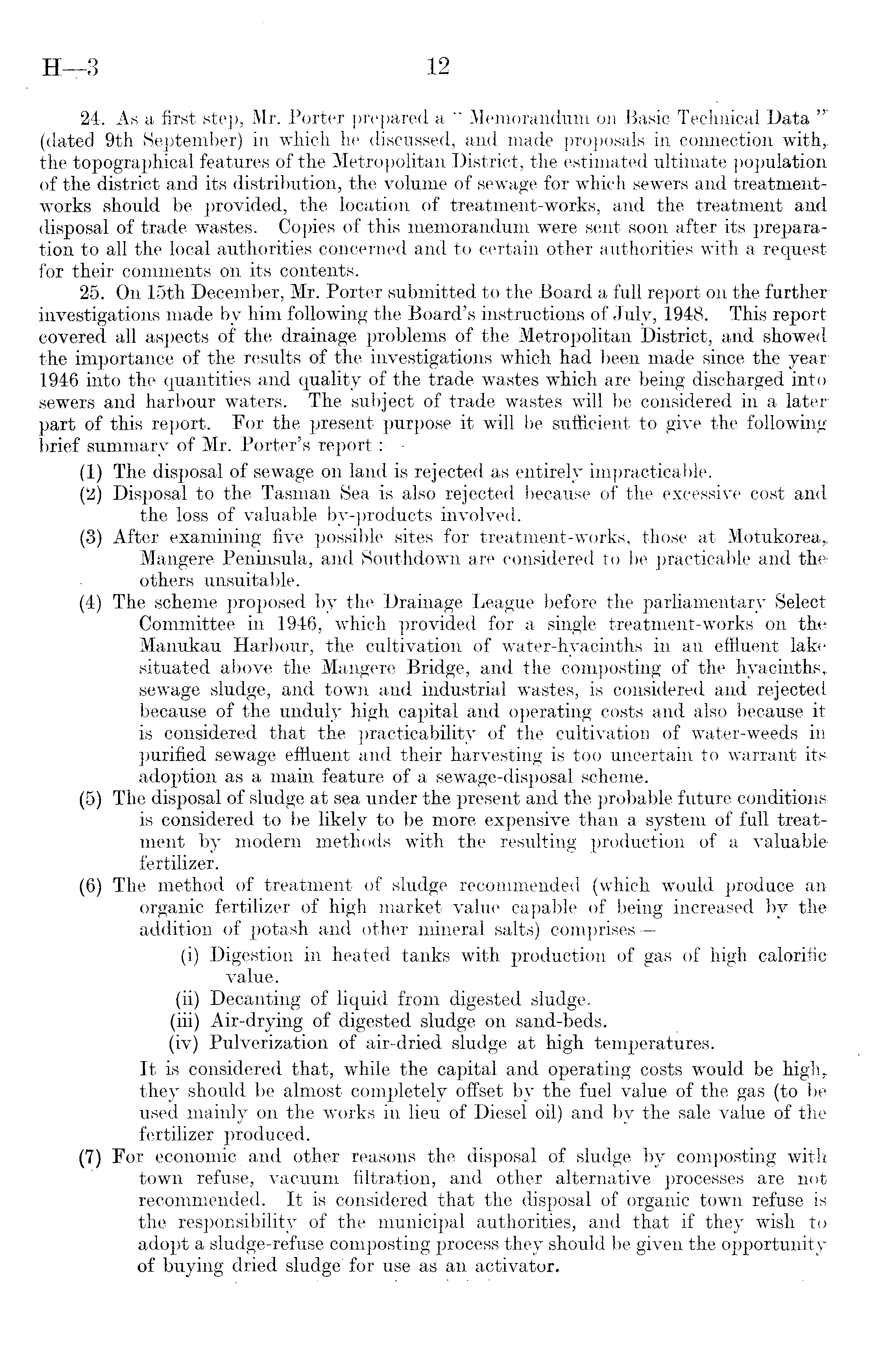 24. As $ first step, Mr. Porter prepared a " Memorandum on Basic Technical Data ' r (dated 9th September) in which he discussed, and made proposals in connection with,, the topographical features of the Metropolitan District, the estimated ultimate population of the district and its distribution, the volume of sewage for which sewers and treatmentworks should be provided, the location of treatment-works, and the treatment and disposal of trade wastes. Copies of this memorandum were sent soon after its preparation to all the local authorities concerned and to certain other authorities with a request for their comments on its contents. 25. On 15th December, Mr. Porter submitted to the Board a full report on the further investigations made by him following the Board's instructions of July, 1948. This report covered all aspects of the drainage problems of the Metropolitan District, and showed the importance of the results of the investigations which had been made since the year 1946 into the quantities and quality of the trade wastes which are being discharged into sewers and harbour waters. The subject of trade wastes will be considered in a later part of this report. For the present purpose it will be sufficient to give the following brief summary of Mr. Porter's, report: — (1) The disposal of sewage on land is rejected as entirely impracticable. (2) Disposal to the Tasman Sea is also rejected because of the excessive cost and the loss of valuable by-products involved. (3) After examining five possible sites for treatment-works, those at Motukorea,, Mangere Peninsula, and Southdown are considered to be practicable and the others unsuitable. (4) The scheme proposed by the Drainage League before the parliamentary Select Committee in 1946, which provided for a single treatment-works on the Manukau Harbour, the cultivation of water-hyacinths in an effluent lake situated above the Mangere Bridge, and the composting of the hya'cinths,. sewage sludge, and town and industrial wastes, is considered and rejected because of the unduly high capital and operating costs and also because it is considered that the practicability of the cultivation of water-weeds in purified sewage effluent and their harvesting is too uncertain to warrant itsadoption as a main feature of a sewage-disposal scheme. (5) The disposal of sludge at. sea under the present and the probable future conditions is considered to be likely to be more expensive than a system of full treatment by modern metho/ls with the resulting production of a valuable fertilizer. (6) The method of treatment of sludge recommended (which would produce an organic fertilizer of high market value capable of being increased by the addition of potash and other mineral salts) comprises—(i) Digestion in heated tanks with production of gas of high calorific value. (ii) Decanting of liquid from digested sludge. (iii) Air-drying of digested sludge on sand-beds. (iv) Pulverization of air-dried sludge at high temperatures. It is considered that, while the capital and operating costs would be high, they should be almost completely offset by the fuel value of the gas (to be used mainly on the works in lieu of Diesel oil) and by the sale value of the fertilizer produced. (7) For economic and other reasons the disposal of sludge by composting with town refuse, vacuum filtration, and other alternative processes are not recommended. It is considered that the disposal of organic town refuse is the responsibility of the municipal authorities, and that if they wish to adopt a sludge-refuse composting process they should be given the opportunity of buying dried sludge for use as an activator.