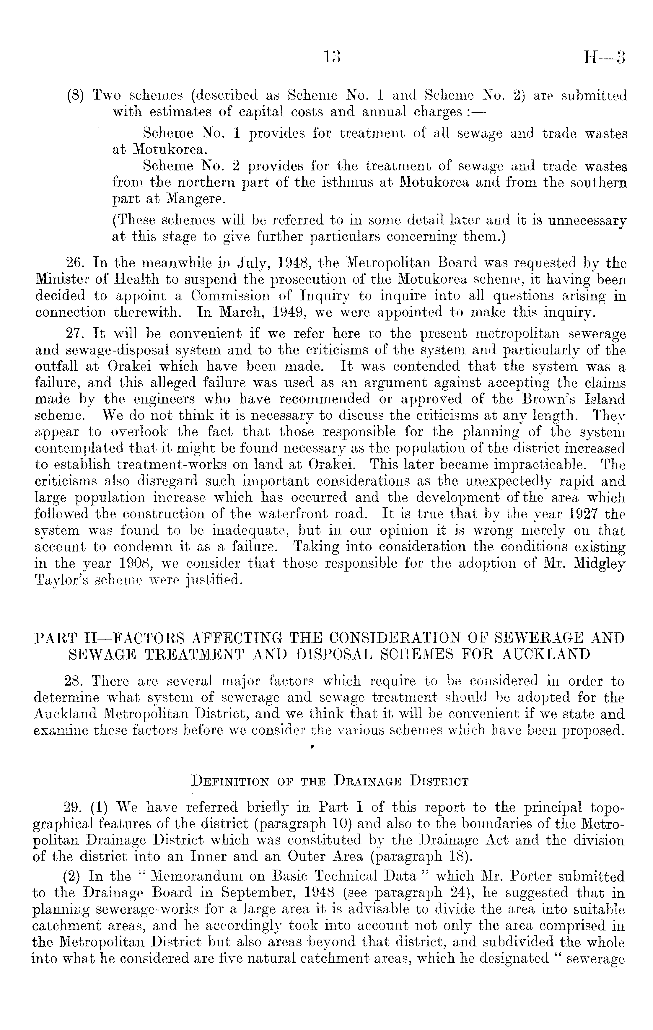 (8) Two schemes (described as Scheme No. 1 and Scheme No. 2) are submitted with estimates of capital costs and annual charges : Scheme No. 1 provides for treatment of all sewage and trade wastes at Motukorea. Scheme No. 2 provides for the treatment of sewage and trade wastes from the northern part of the isthmus at Motukorea and from the southern part at Mangere. (These schemes will be referred to in some detail later and it is unnecessary at this stage to give further particulars concerning them.) 26. In the meanwhile in July, 1948, the Metropolitan Board was requested by the Minister of Health to suspend the prosecution of the Motukorea scheme, it having been decided to appoint a Commission of Inquiry to inquire into all questions arising in connection therewith. In March, 1949, we were appointed to make this inquiry. 27. It will be convenient if we refer here to the present metropolitan sewerage and sewage-disposal system and to the criticisms of the system and particularly of the outfall at Orakei which have been made. It was contended that the system was a failure, and this alleged failure was used as an argument against accepting the claims made by the engineers who have recommended or approved of the Brown's Island scheme. We do not think it is necessary to discuss the criticisms at any length. They appear to overlook the fact that those responsible for the planning of the system contemplated that it might be found necessary as the population of the district increased to establish treatment-works on land at Orakei. This later became impracticable. The criticisms also disregard such important considerations as the unexpectedly rapid and large population increase which has occurred and the development of the area which followed the construction of the waterfront road. It is true that by the year 1927 the system was found to be inadequate, but in our opinion it is wrong merely on that account to condemn it as a failure. Taking into consideration the conditions existing in the year 1908, we consider that those responsible for the adoption of Mr. Midgley Taylor's scheme were justified. PART lI—FACTORS AFFECTING THE CONSIDERATION OF SEWERAGE AND SEWAGE TREATMENT AND DISPOSAL SCHEMES FOR AUCKLAND 28. There are several major factors which require to be considered in order to determine what system of sewerage and sewage treatment should be adopted for the Auckland Metropolitan District, and we think that it will be convenient if we state and examine these factors before we consider the various schemes which have been proposed. Definition of the Drainage District 29. (1) We have referred briefly in Part I of this report to the principal topographical features of the district (paragraph 10) and also to the boundaries of the Metropolitan Drainage District which was constituted by the Drainage Act and the division of the district into an Inner and an Outer Area (paragraph 18). (2) In the " Memorandum on Basic Technical Data " which Mr. Porter submitted to the Drainage Board in September, 1948 (see paragraph 24), he suggested that in planning sewerage-works for a large area it is advisable to divide the area into suitable catchment areas, and he accordingly took into account not only the area comprised in the Metropolitan District but also areas beyond that district, and subdivided the whole into what he considered are five natural catchment areas, which he designated " sewerage
