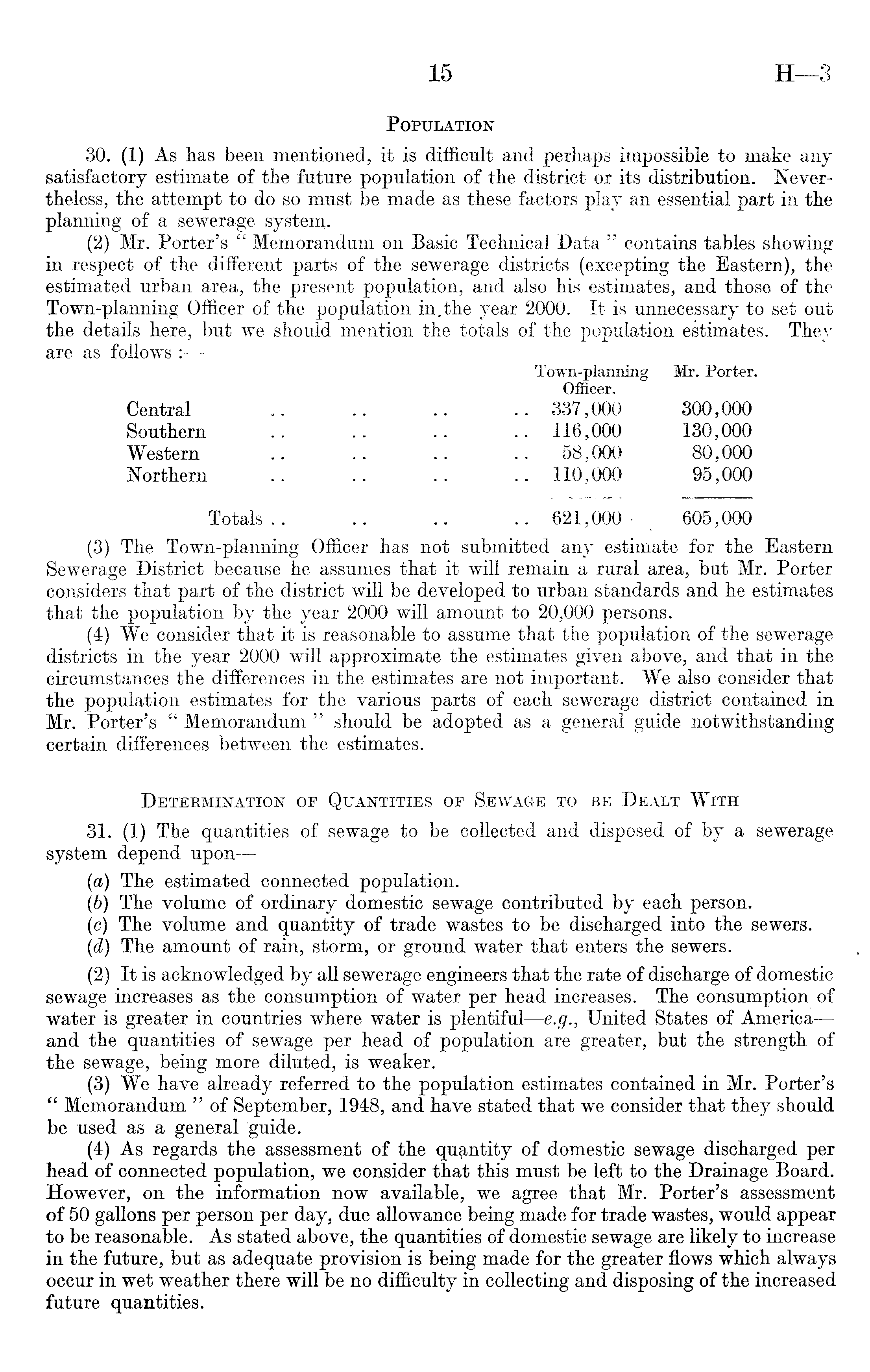 Population 30. (1) As Has been mentioned, it is difficult and perhaps impossible to make any satisfactory estimate of the future population of the district or its distribution. Nevertheless, the attempt to do so must be made as these factors play an essential part in the planning of a sewerage system. (2) Mr. Porter's " Memorandum on Basic Technical Data " contains tables showing in respect of the different parts of the sewerage districts (excepting the Eastern), the estimated urban area, the present population, and also his estimates, and those of the Town-planning Officer of the population in.the year 2000. It is unnecessary to set out the details here, but we should mention the totals of the population estimates. They are as follows :■— Town-planning Mr. Porter. Officer. Central .. .. .. .. 337,000 300,000 Southern 116,000 130,000 Western .. .. .. .. 58,000 80,000 Northern .. .. .. .. 110,000 95,000 Totals.. .. .. .. 621,000 605,000 (3) The Town-planning Officer has not submitted any estimate for the Eastern Sewerage District because he assumes that it will remain a rural area, but Mr. Porter considers that part of the district will be developed to urban standards and he estimates that the population by the year 2000 will amount to 20,000 persons. (4) We consider that it is reasonable to assume that the population of the sewerage districts in the year 2000 will approximate the estimates given above, and that in the circumstances the differences in the estimates are not important. We also consider that the population estimates for the various parts of each sewerage district contained in Mr. Porter's " Memorandum " should be adopted as a general guide notwithstanding certain differences between the estimates. Determination op Quantities of Sewage to be Dealt With 31. (1) The quantities of sewage to be collected and disposed of by a sewerage system depend upon — (a) The estimated connected population. (b) The volume of ordinary domestic sewage contributed by each person. (c) The volume and quantity of trade wastes to be discharged into the sewers. (d) The amount of rain, storm, or ground water that enters the sewers. (2) It is acknowledged by all sewerage engineers that the rate of discharge of domestic sewage increases as the consumption of water per head increases. The consumption of water is greater in countries where water is plentiful—e.g., United States of America — and the quantities of sewage per head of population are greater, but the strength of the sewage, being more diluted, is weaker. (3) We have already referred to the population estimates contained in Mr. Porter's " Memorandum " of September, 1948, and have stated that we consider that they should be used as a general guide. (4) As regards the assessment of the quantity of domestic sewage discharged per head of connected population, we consider that this must be left to the Drainage Board. However, on the information now available, we agree that Mr. Porter's assessment of 50 gallons per person per day, due allowance being made for trade wastes, would appear to be reasonable. As stated above, the quantities of domestic sewage are likely to increase in the future, but as adequate provision is being made for the greater flows which always occur in wet weather there will be no difficulty in collecting and disposing of the increased future quantities.