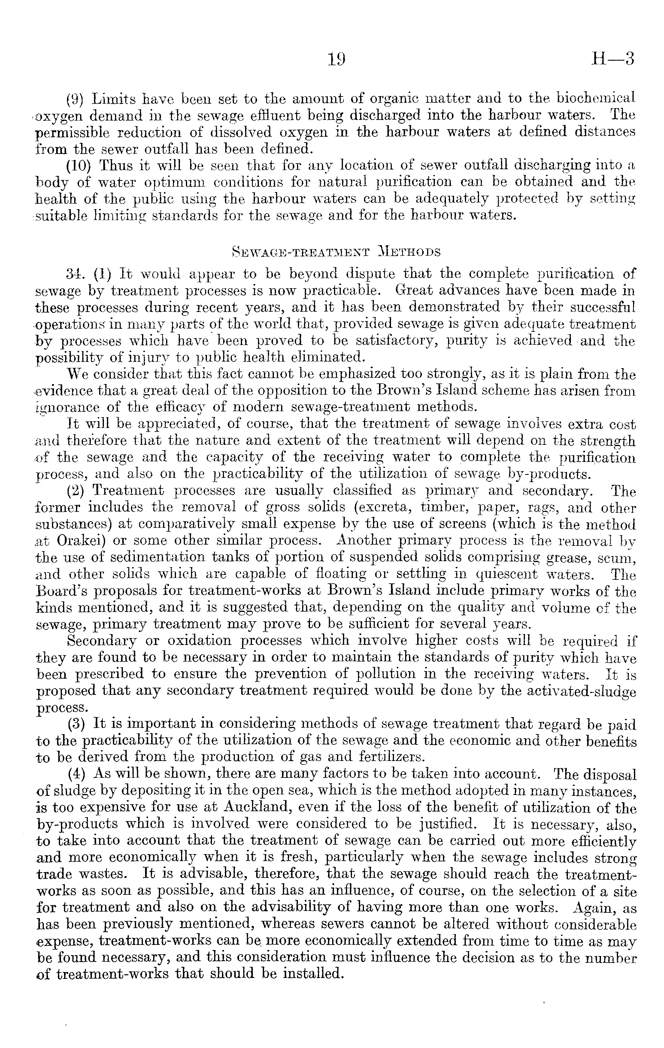 (9) Limits have been set to the amount of organic matter and to the biochemical oxygen demand in the sewage effluent being discharged into the harbour waters. The permissible reduction of dissolved oxygen in the harbour waters at defined distances from the sewer outfall has been defined. (10) Thus it will be seen that for any location of sewer outfall discharging into a* body of water optimum conditions for natural purification can be obtained and the health of the public using the harbour waters can be adequately protected by setting suitable limiting standards for the sewage and for the harbour waters. Sewage-treatment Methods 34. (1) It would appear to be beyond dispute that the complete purification of sewage by treatment processes is now practicable. Great advances have been made in these processes during recent years, and it has been demonstrated by their successful operations in many parts of the world that, provided sewage is given adequate treatment by processes which have been proved to be satisfactory, purity is achieved and the possibility of injury to public health eliminated. We consider that this fact cannot be emphasized too strongly, as it is plain from the •evidence that a great deal of the opposition to the Brown's Island scheme has arisen from ignorance of the efficacy of modern sewage-treatment methods. It will be appreciated, of course, that the treatment of sewage involves extra cost and therefore that the nature and extent of the treatment will depend on the strength of the sewage and the capacity of the receiving water to complete the purification process, and also on the practicability of the utilization of sewage by-products. (2) Treatment processes are usually classified as primary and secondary. The former includes the removal of gross solids (excreta, timber, paper, rags, and other substances) at comparatively small expense by the use of screens (which is the method at Orakei) or some other similar process. Another primary process is the removal by the use of sedimentation tanks of portion of suspended solids comprising grease, scum, and other solids which are capable of floating or settling in quiescent waters. The Board's proposals for treatment-works at Brown's Island include primary works of the kinds mentioned, and it is suggested that, depending on the quality and volume of the sewage, primary treatment may prove to be sufficient for several years. Secondary or oxidation processes which involve higher costs will be required if they are found to be necessary in order to maintain the standards of purity which have been prescribed to ensure the prevention of pollution in the receiving waters. It is proposed that any secondary treatment required would be done by the activated-sludge process. (3) It is important in considering methods of sewage treatment that regard be paid to the practicability of the utilization of the sewage and the economic and other benefits to be derived from the production of gas and fertilizers. (4) As will be shown, there are many factors to be taken into account. The disposal of sludge by depositing it in the open sea, which is the method adopted in many instances, is too expensive for use at Auckland, even if the loss of the benefit of utilization of the by-products which is involved were considered to be justified. It is necessary, also, to take into account that the treatment of sewage can be carried out more efficiently and more economically when it is fresh, particularly when the sewage includes strong trade wastes. It is advisable, therefore, that the sewage should reach the treatmentworks as soon as possible, and this has an influence, of course, on the selection of a site for treatment and also on the advisability of having more than one works. Again, as has been previously mentioned, whereas sewers cannot be altered without considerable expense, treatment-works can be more economically extended from time to time as may be found necessary, and this consideration must influence the decision as to the number of treatment-works that should be installed.