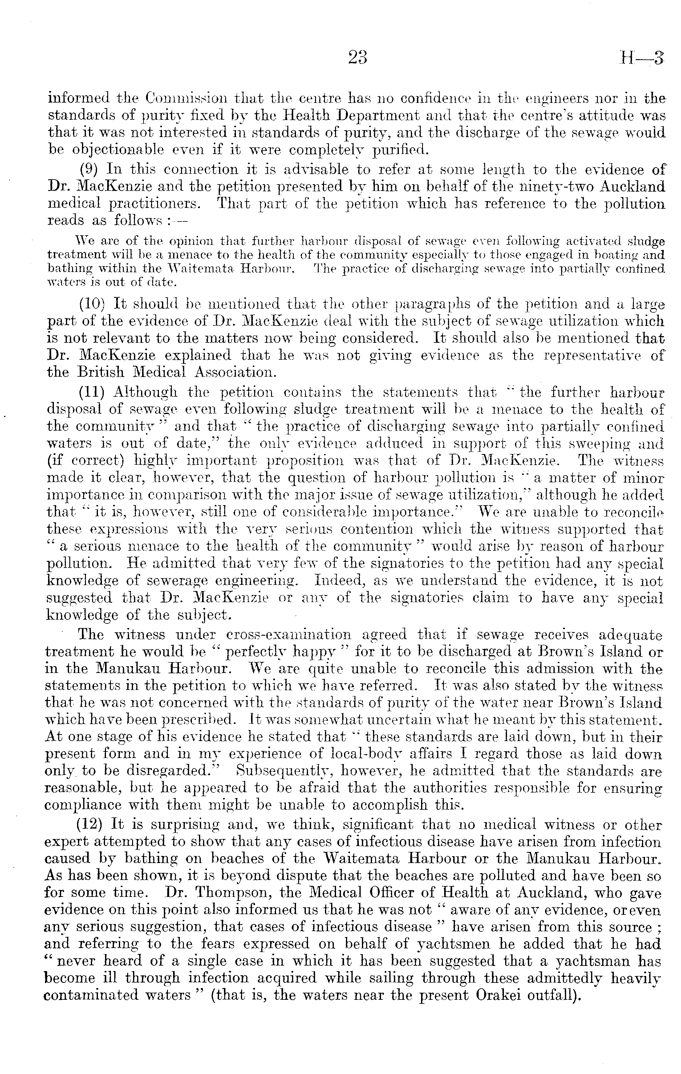 informed the Commission that the centre has no confidence in the engineers nor in the standards of purity fixed by the Health Department and that the centre's attitude was that it was not interested in standards of purity, and the discharge of the sewage would be objectionable even if it were completely purified. (9) In this connection it is advisable to refer at some length to the evidence of Dr. MacKenzie and the petition presented by him on behalf of the ninety-two Auckland medical practitioners. That part of the petition which has reference to the pollution reads as follows :—- We are of the opinion that further harbour disposal of sewage even following activated sludge treatment will be a menace to the health of the community especially to those engaged in boating and bathing within the Waitemata Harbour. The practice of discharging sewage into partially confined waters is out of date. (10) It should be mentioned that the other paragraphs of the petition and a large part of the evidence of Dr. MacKenzie deal with the subject of sewage utilization which is not relevant to the matters now being considered. It should also be mentioned that Dr. MacKenzie explained that he was not giving evidence as the representative of the British Medical Association. (11) Although the petition contains the statements that " the further harbour disposal of sewage even following sludge treatment will be a menace to the health of the community " and that " the practice of discharging sewage into partially confined waters is out of date," the only evidence adduced in support of this sweeping and (if correct) highly important proposition was that of Dr. MacKenzie. The witness made it clear, however, that the question of harbour pollution is " a matter of minor importance in comparison with the major issue of sewage utilization," although he added that "it is, however, still one of considerable importance." We are unable to reconcile these expressions with the very serious contention which the witness supported that " a serious menace to the health of the community " would arise by reason of harbour pollution. He admitted that very few of the signatories to the petition had any special knowledge of sewerage engineering. Indeed, as we understand the evidence, it is not suggested that Dr. MacKenzie or any of the signatories claim to have any special knowledge of the subject. The witness under cross-examination agreed that if sewage receives adequate treatment he would be " perfectly happy " for it to be discharged at Brown's Island or in the Manukau Harbour. We are quite unable to reconcile this admission with the statements in the petition to which we have referred. It was also stated by the witness that he was not concerned with the standards of purity of the water near Brown's Island which have been prescribed. It was somewhat uncertain what he meant by this statement. At one stage of his evidence he stated that " these standards are laid down, but in their present form and in my experience of local-body affairs I regard those as laid down only, to be disregarded." Subsequently, however, he admitted that the standards are reasonable, but he appeared to be afraid that the authorities responsible for ensuring compliance with them might be unable to accomplish this. (12) It is surprising and, we think, significant that no medical witness or other expert attempted to show that any cases of infectious disease have arisen from infection caused by bathing on beaches of the Waitemata Harbour or the Manukau Harbour. As has been shown, it is beyond dispute that the beaches are polluted and have been so for some time. Dr. Thompson, the Medical Officer of Health at Auckland, who gave evidence on this point also informed us that he was not " aware of any evidence, or even any serious suggestion, that cases of infectious disease " have arisen from this source ; and referring to the fears expressed on behalf of yachtsmen he added that he had " never heard of a single case in which it has been suggested that a yachtsman has become ill through infection acquired while sailing through these admittedly heavily contaminated waters " (that is, the waters near the present Orakei outfall).