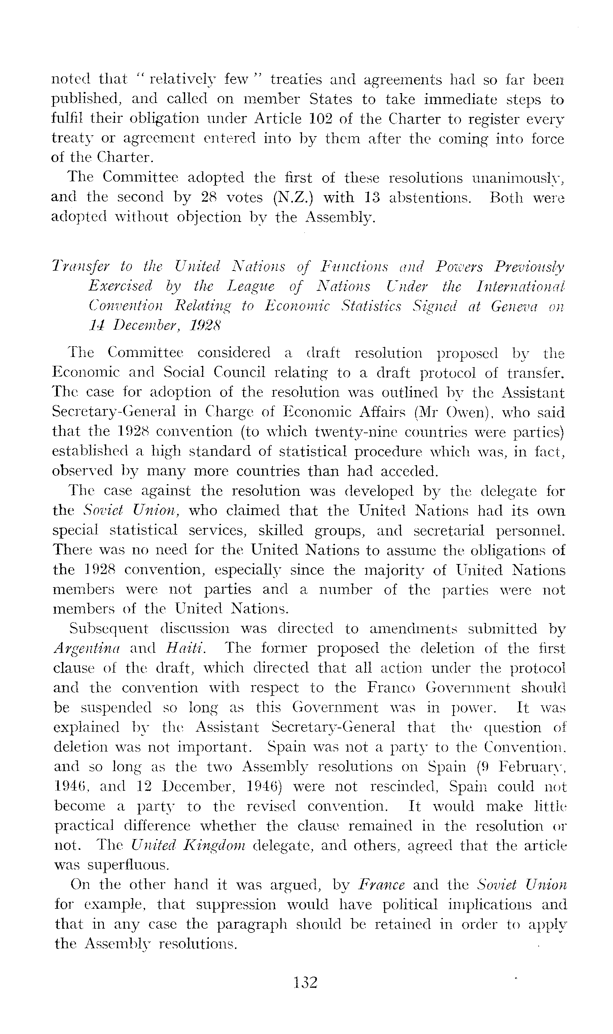 noted that " relatively few " treaties and agreements had so far been published, and called on member States to take immediate steps to fulfil their obligation under Article 102 of the Charter to register every treaty or agreement entered into by them after the coming into force of the Charter. The Committee adopted the first of these resolutions unanimously, and the second by 28 votes (N.Z.) with 13 abstentions. Both were adopted without objection by the Assembly. Transfer to the United Nations of Functions and Powers Previously Exercised by the League of Nations Under the International Convention Relating to Economic Statistics Signed at Geneva on 14 December, 1928 The Committee considered a draft resolution proposed by the Economic and Social Council relating to a draft protocol of transfer. The case for adoption of the resolution was outlined the Assistant Secretary-General in Charge of Economic Affairs (Mr Owen), who said that the 1928 convention (to which twenty-nine countries were parties) established a high standard of statistical procedure which was, in fact, observed by many more countries than had acceded. The case against the resolution was developed by the delegate for the Soviet Union, who claimed that the United Nations had its own special statistical services, skilled groups, and secretarial personnel. There was no need for the United Nations to assume the obligations of the 1928 convention, especially since the majority of United Nations members were not parties and a number of the parties were not members of the United Nations. Subsequent discussion was directed to amendments submitted by Argentina and Haiti. The former proposed the deletion of the first clause of the draft, which directed that all action under the protocol and the convention with respect to the Franco Government should be suspended so long as this Government was in power. It was explained by the Assistant Secretary-General that the question of deletion was not important. Spain was not a party to the Convention, and so long as the two Assembly resolutions on Spain (9 February, 1946, and 12 December, 1946) were not rescinded, Spain could not become a party to the revised convention. It would make little practical difference whether the clause remained in the resolution or not. The United Kingdom delegate, and others, agreed that the article was superfluous. On the other hand it was argued, by France and the Soviet Union for example, that suppression would have political implications and that in any case the paragraph should be retained in order to apply the Assembly resolutions.