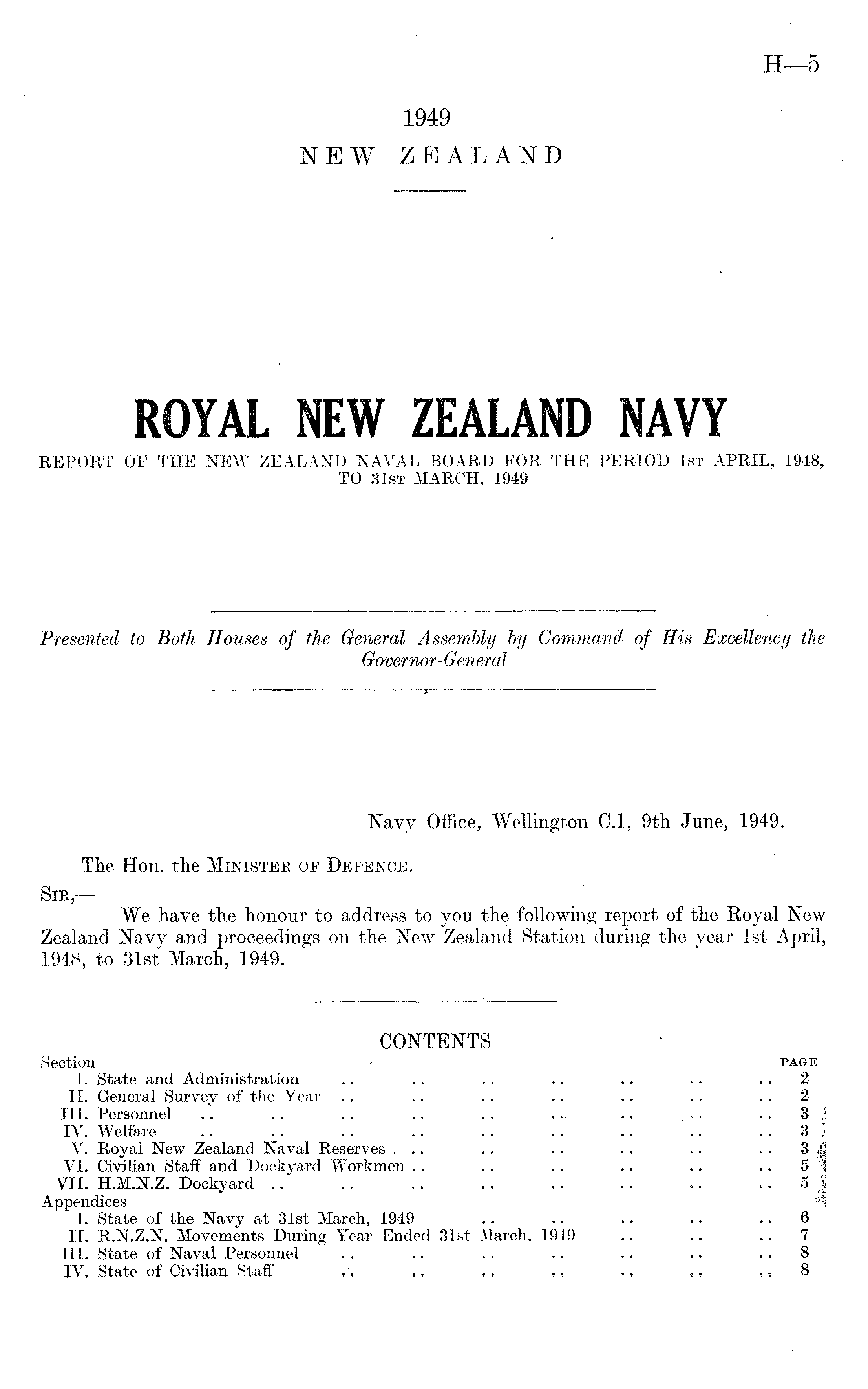 Navy Office, Wellington C.l, 9th June, 1949. The Hon. the Minister of Defence. Sir,We have the honour to address to you th§ following report of the Royal New Zealand Navy and proceedings on the New Zealand Station during the year Ist April, 1948, to 31st March, 1949.