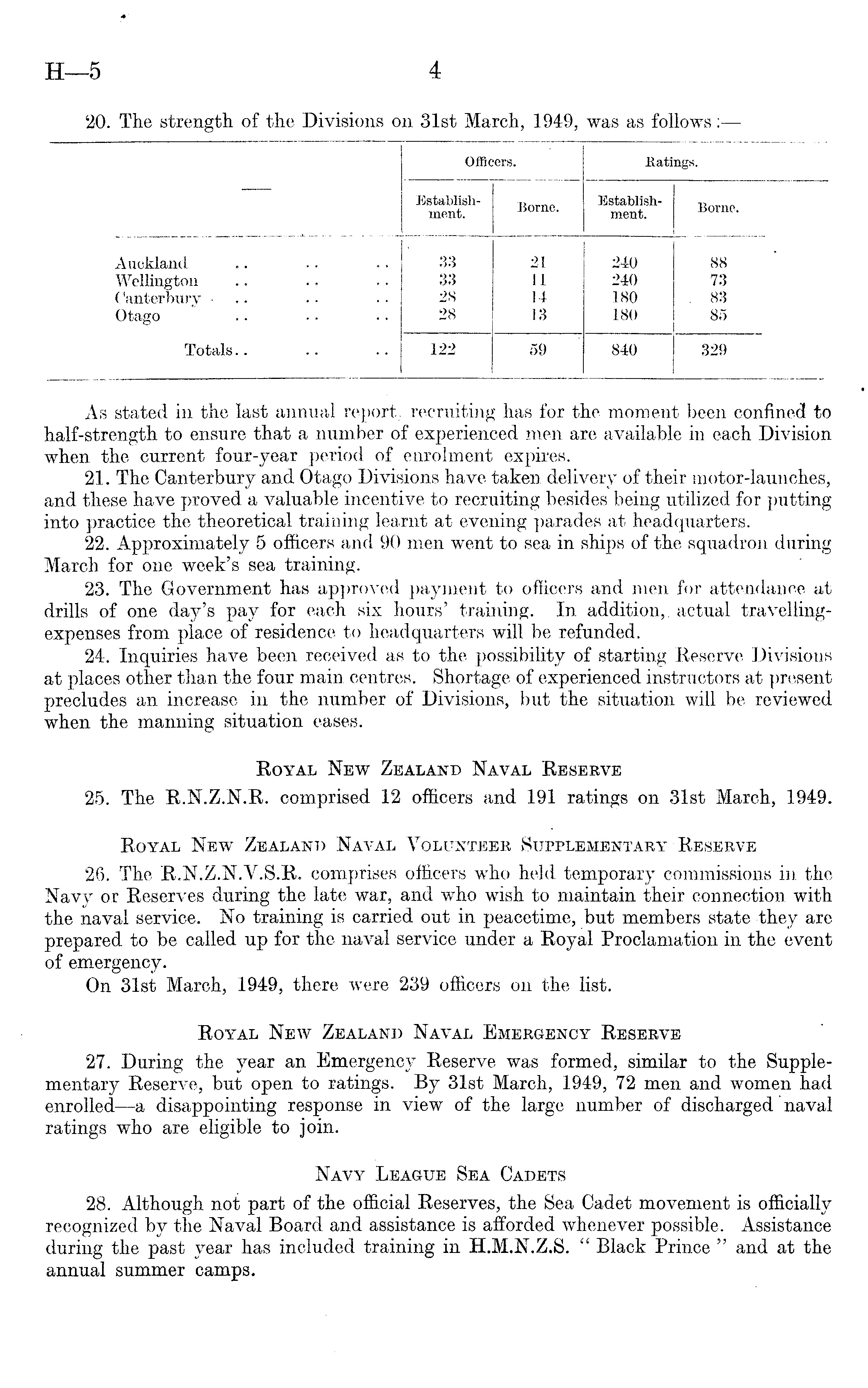 As stated in the last annual report, recruiting has for the moment been confined to half-strength to ensure that a number of experienced men are available in each Division when the current four-year period of enrolment expires. 21. The Canterbury and Otago Divisions have taken delivery of their motor-launches, and these have proved a valuable incentive to recruiting besides being utilized for putting into practice the theoretical training learnt at evening parades at headquarters. 22. Approximately 5 officers and 90 men went to sea in ships of the squadron during March for one week's sea training. 23. The Government has approved payment to officers and men for attendance at drills of one day's pay for each six hours' training. In addition,, actual traVeilingexpenses from place of residence to headquarters will be refunded. 24. Inquiries have been received as to the possibility of starting Reserve Divisions at places other than the four main centres. Shortage of experienced instructors at present precludes an increase in the number of Divisions, but the situation will be reviewed when the manning situation eases. Royal New Zealand Naval Reserve 25. The R.N.Z.N.R. comprised 12 officers and 191 ratings on 31st March, 1949. Royal New Zealand Naval Volunteer Supplementary Reserve 26. The R.N.Z.N.Y.S.R. comprises officers who held temporary commissions in the Navy or Reserves during the late war, and who wish to maintain their connection with the naval service. No training is carried out in peacetime, but members state they are prepared to be called up for the naval service under a Royal Proclamation in the event of emergency. On 31st March, 1949, there were 239 officers on the list. Royal New Zealand Naval Emergency Reserve 27. During the year an Emergency Reserve was formed, similar to the Supplementary Reserve, but open to ratings. By 31st March, 1949, 72 men and women had enrolled —a disappointing response in view of the large number of discharged naval ratings who are eligible to join. Navy League Sea Cadets 28. Although not part of the official Reserves, the Sea Cadet movement is officially recognized by the Naval Board and assistance is afforded whenever possible. Assistance during the past year has included training in H.M.N.Z.S. " Black Prince " and at the annual summer camps.