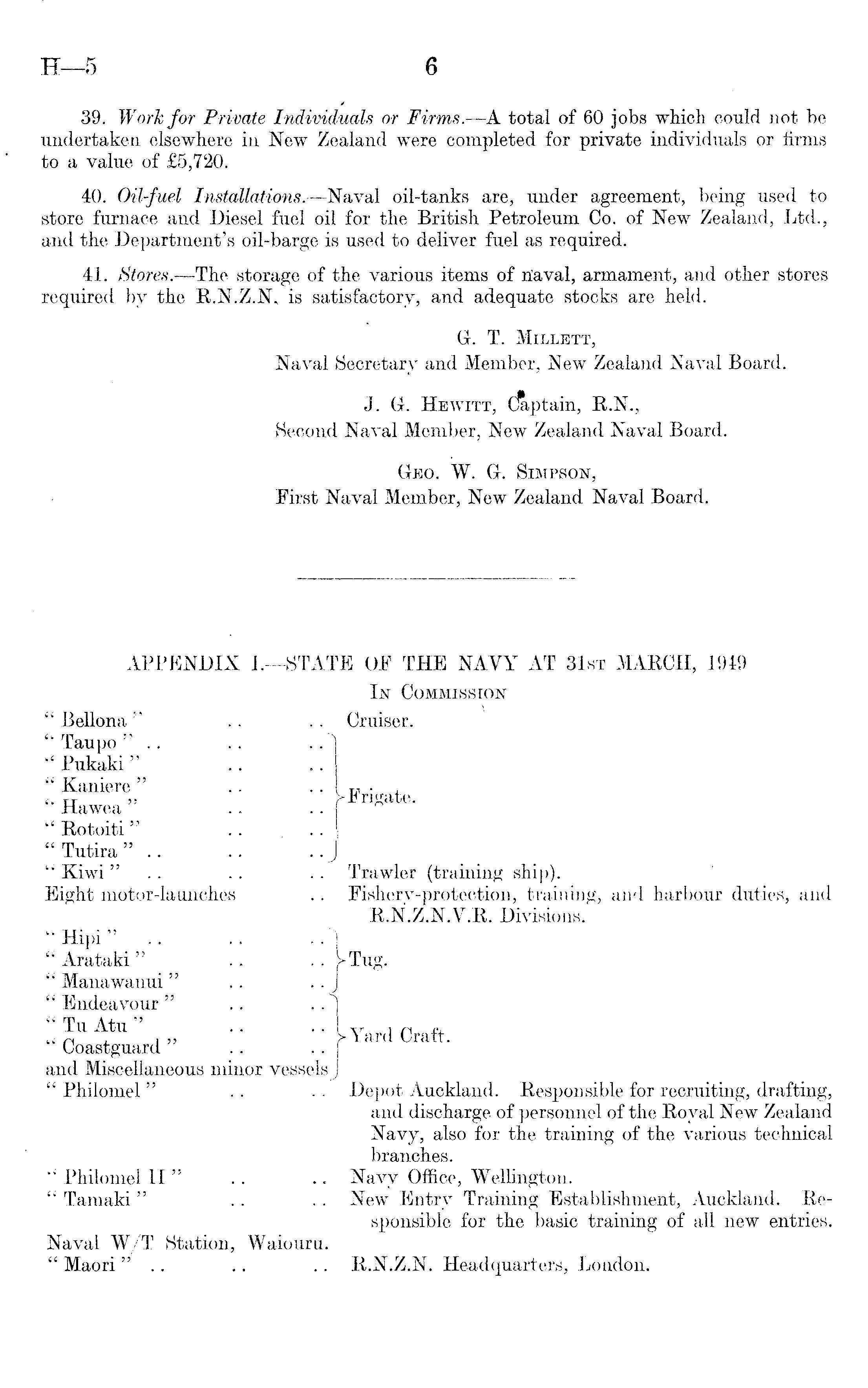 39. Work for Private Individuals or Firms. —A total of 60 jobs which could not be undertaken elsewhere in New Zealand were completed for private individuals or firms to a value of £5,720. 40. Oil-fuel Installations.—Naval oil-tanks are, under agreement, being used to store furnace and Diesel fuel oil for the British Petroleum Co. of New Zealand, Ltd., and the Department's oil-barge is used to deliver fuel as required. 41. Stores.—The storage of the various items of n'aval, armament, and other stores required by the R.N.Z.N. is satisfactory, and adequate stocks are held. G. T. Millett, Naval Secretary and Member, New Zealand Naval Board. J. G. Hewitj, (Japtain, R.N., Second Naval Member, New Zealand Naval Board. Geo. W. G. Simpson, First Naval Member, New Zealand Naval Board.
