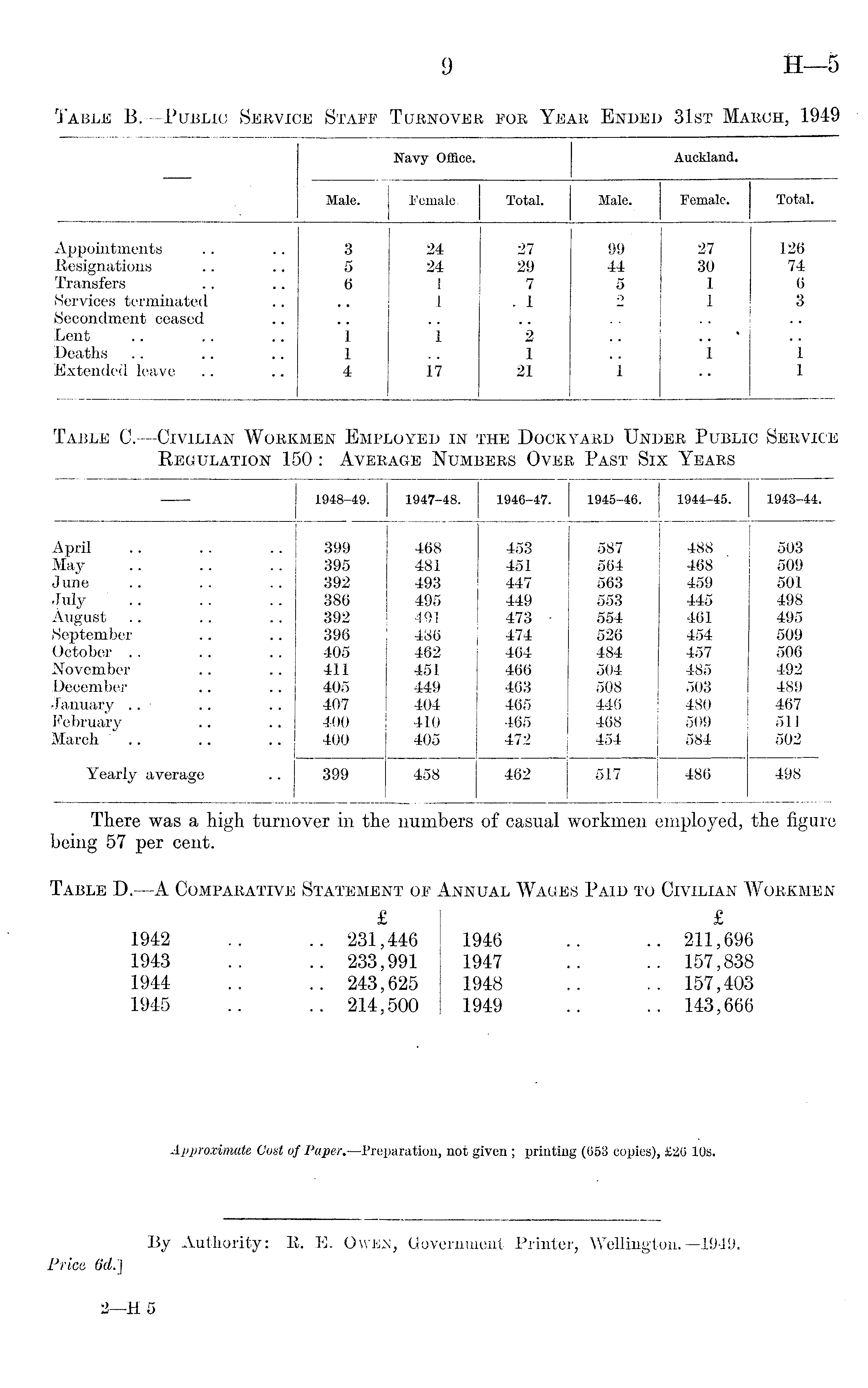 There was a high turnover in the numbers of casual workmen employed, the figure being 57 per cent. Table D. —A Comparative Statement of Annual Wages Paid to Civilian Workmen £ £ 1942 .. .. 231,446 1946 .. .. 211,696 1943 .. .. 233,991 1947 .. .. 157,838 1944 .. .. 243,625 1948 .. .. 157,403 1945 .. .. 214,500 1949 .. .. 143,666