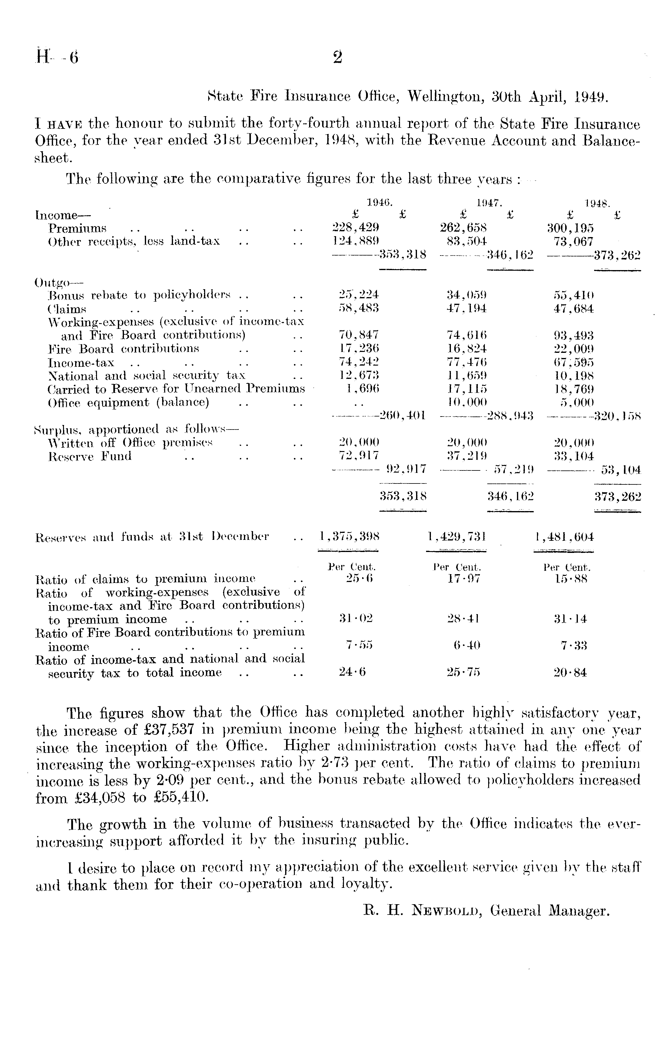State Fire Insurance Office, Wellington, 30th April, 1949. I have the honour to submit the forty-fourth annual report of the State Fire Insurance Office, for the year ended 31st December, 1948, with the Revenue Account and Balancesheet. The following are the comparative figures for the last three years : 1946. 1947. 1948. Income — £ £ £ £ £ £ Premiums .. .. .. .. 228,429 262,658 300,195 Other receipts, less land-tax .. .. 124,889 83,504 73,067 . —3.53,318 346,162 —373,262 Outgo— Bonus rebate to policyholders .. .. 25,224 34,059 55,410 Claims .. .. •• •• 58,483 47,194 47,684 Working-expenses (exclusive of income-tax and Fire Board contributions) . . 70,847 74,616 • 93,493 Fire Board contributions .. .. 17,236 16,824 22,009 Income-tax .. .. .. .. 74,242 77,476 67 ,'595 National and social security tax .. 12,673 11,659 10,198 Carried to Reserve for Unearned Premiums 1,696 17,115 18,769 Office equipment (balance) .. .. .. 10,000 5,000 26 0,401 288,943 320,158 Surplus, apportioned as follows — Written off Office premises .. .. 20,000 20,000 20,000 Reserve Fund .. .. .. 72,917 37,219 33,104 92,917 57,219 53,104 353,318 346,162 373,262 Reserves and funds at 31st December .. 1,375,398 1,429,731 1,481,604 Per Cent. Per Cent. Per Cent. Ratio of claims to premium income .. 25-6 17-97 15-88 Ratio of working-expenses (exclusive of income-tax and Fire Board contributions) to premium income .. .. .. 31-02 28-41 31-14 Ratio of Fire Board contributions.to premium income .. • • ■ • ■ ■ 7-55 6-40 7-33 Ratio of income-tax and national and social security tax to total income .. .. 24-6 25-75 20-84 The figures show that the Office has completed another highly satisfactory year, the increase of £37,537 in premium income being the highest attained in any one year since the inception of the Office. Higher administration costs have had the effect of increasing the working-expenses ratio by 2-73 per cent. The ratio of claims to premium income is less by 2-09 per cent., and the bonus rebate allowed to policyholders increased from £34,058 to £55,410. The growth in the volume of business transacted by the Office indicates the everincreasing support afforded it by the insuring public. I' desire to place on record my appreciation of the excellent service given by the staff and thank them for their co-operation and loyalty. R. H. Newbold, General Manager.
