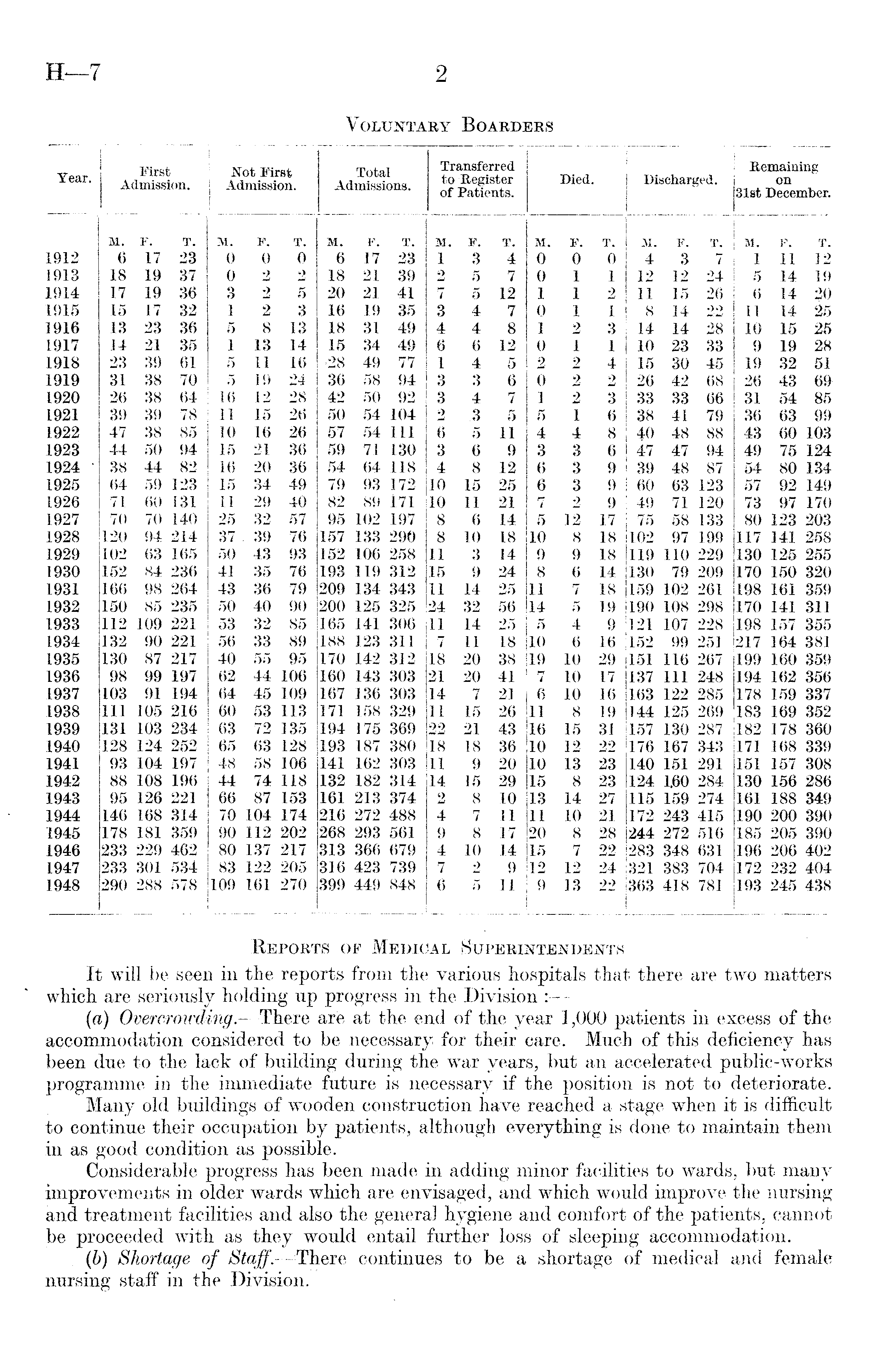 Reports of Medical Superintendents It will be seen in tlie reports from the various hospitals that there are two matters which are seriously holding up progress in the Division : (а) Overcrotvding.—There are at the end of the year 1,000 patients in excess of the accommodation considered to be necessary for their care. Much of this deficiency has been due to the lack of building during the war years, but an accelerated public-works programme in the immediate future, is necessary if the position is not to deteriorate. Many old buildings of wooden construction have reached a stage when it is difficult to continue their occupation by patients, although everything is done to maintain them in as good condition as possible. Considerable progress has been made in adding minor facilities to wards, but many improvements in older wards which are envisaged, and which would improve the nursing and treatment facilities and also the general hygiene and comfort of the patients, cannot be. proceeded with as they would entail further loss of sleeping accommodation. (б) Shortage of Staff. —There continues to be a shortage of medical and female nursing staff in the Division.