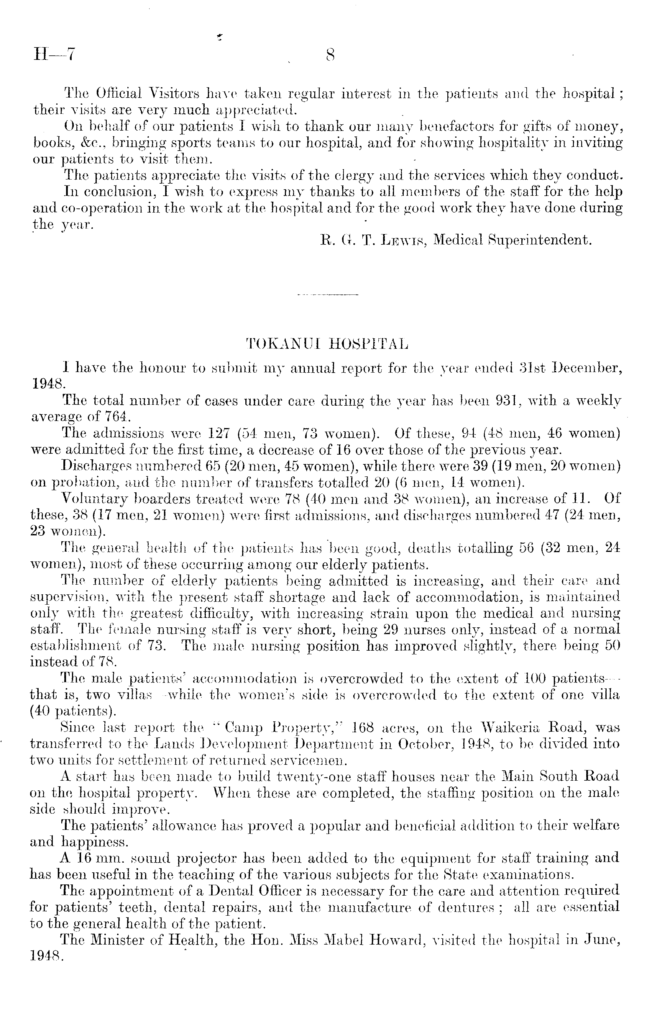 TOKANUI HOSPITAL I have the honour to submit my annual report for the year ended 31st December, 1948. The total number of cases under care during the year has been 931, with a weekly average of 764. The admissions were 127 (54 men, 73 women). Of these, 94 (48 men, 46 women) were admitted for the first time, a decrease of 16 over those of the previous year. Discharges numbered 65 (20 men, 45 women), while there were 39 (19 men, 20 women) on probation, and the number of transfers totalled 20 (6 men, 14 women). Voluntary boarders treated were 78 (40 men and 38 women), an increase of 11. Of these, 38 (17 men, 21 women) were first admissions, and discharges numbered 47 (24 men, 23 women). The general health of the patients has been good, deaths totalling 56 (32 men, 24 women), most of these occurring among our elderly patients. The number of elderly patients being admitted is increasing, and their care and supervision, with the present staff shortage and lack of accommodation, is maintained only with the greatest difficulty, with increasing strain upon the medical and nursing staff. The female nursing staff is very short, being 29 nurses only, instead of a normal establishment of 73. The male nursing position has improved slightly, there being 50 instead of 78. The male patients' accommodation is overcrowded to the extent of 100 patients—that is, two villas—while the women's side is overcrowded to the extent of one villa (40 patients). Since last report the " Camp Property," 168 acres, on the Waikeria Road, was transferred to the Lands Development Department in October, 1948, to be divided into two units for settlement of returned servicemen. A start has been made to build twenty-one staff houses near the Main South Road on the hospital property. When these are completed, the staffing position on the male side should improve. The patients' allowance has proved a popular and beneficial addition to their welfare and happiness. A 16 mm. sound projector has been added to the equipment -for staff training and has been useful in the teaching of the various subjects for the State examinations. The appointment of a Dental Officer is necessary for the care and attention required for patients' teeth, dental repairs, and the manufacture of dentures ; all are essential to the general health of the patient. The Minister of Health, the Hon. Miss Mabel Howard, visited the hospital in June, 1948.