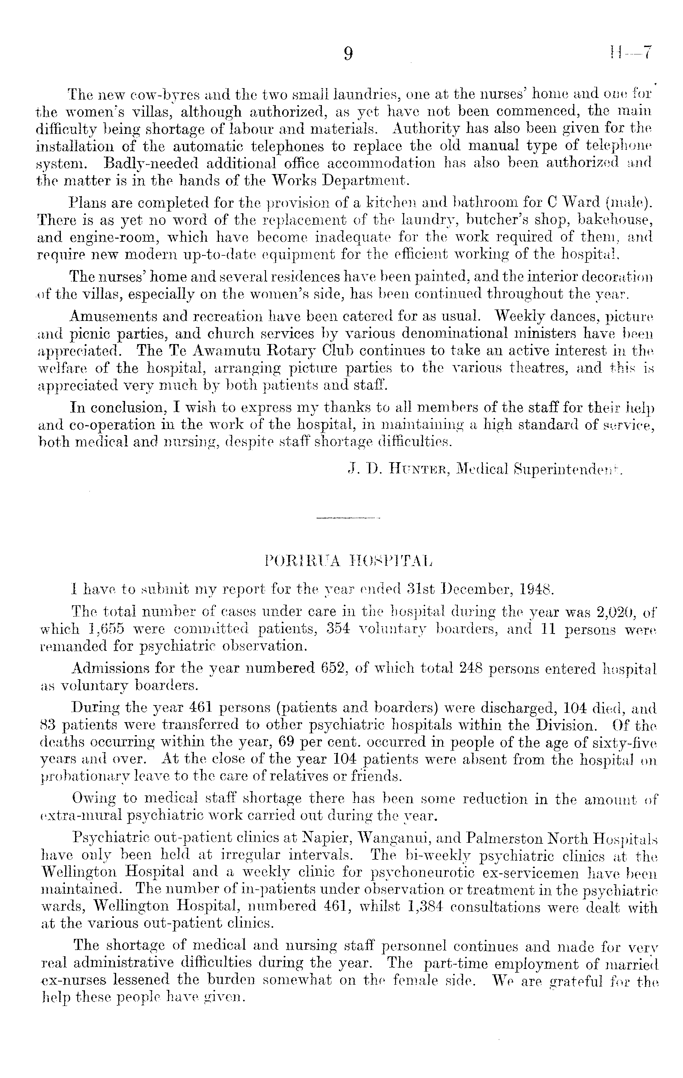 PORIRUA HOSPITAL I have to submit my report for the year ended 31st December, 1948. The total number of cases under care in the hospital during the year was 2,020, of which 1,655 were committed patients, 354 voluntary boarders, and 11 persons were remanded for psychiatric observation. Admissions for the year numbered 652, of which total 248 persons entered hospital as voluntary boarders. During the year 461 persons (patients and boarders) were discharged, 104 died, and 83 patients were transferred to other psychiatric hospitals within the Division. Of the deaths occurring within the year, 69 per cent, occurred in people of the age of sixty-five years and over. At the close of the year 104 patients were absent from the hospital on probationary leave to the care of relatives or friends. Owing to medical staff shortage there has been some reduction in the amount of extra-mural psychiatric work carried out during the year. .. Psychiatric out-patient clinics at Napier, Wanganui, and Palmerston North Hospitals have only been held at irregular intervals. The bi-weekly psychiatric clinics at the Wellington Hospital and a weekly clinic for psychoneurotic ex-servicemen have been maintained. The number of in-patients under observation or treatment in the psychiatric wards, Wellington Hospital, numbered 461, whilst 1,384 consultations were dealt with at the various out-patient clinics. The shortage of medical and nursing staff personnel continues and made for very real administrative difficulties during the year. The part-time employment of married ex-nurses lessened the burden somewhat on the female side. We are grateful for the help these people have given.