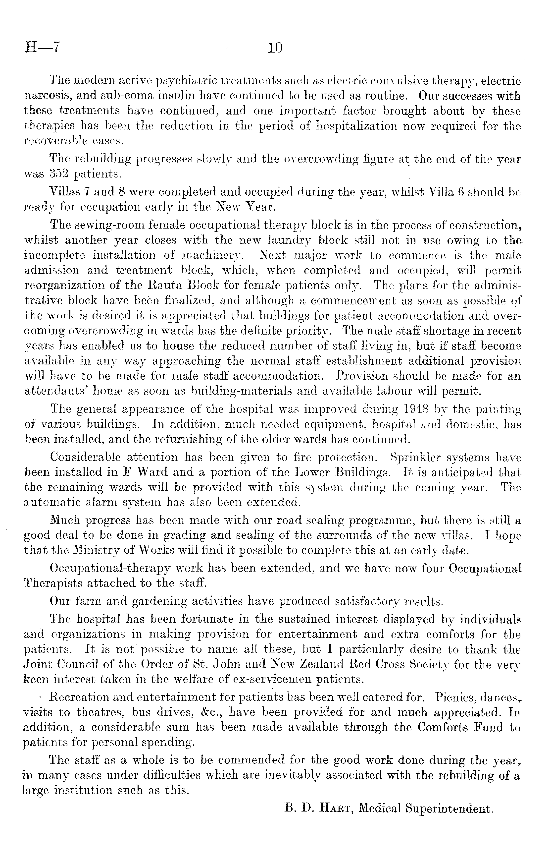 The modern active psychiatric treatments such as electric convulsive therapy, electric narcosis, and sub-coma insulin have continued to be used as routine. Our successes with these treatments have continued, and one important factor brought about by these therapies has been the reduction in the period of hospitalization now required for the recoverable cases. The rebuilding progresses slowly and the overcrowding figure at the end of the year was 352 patients. Villas 7 and 8 were completed and occupied during the year, whilst Villa 6 should be ready for occupation early in the New Year. The sewing-room female occupational therapy block is in the process of construction, whilst another year closes with the new laundry block still not in use owing to theincomplete installation of machinery. Next major work to commence is the male admission and treatment block, which, when completed and occupied, will permit reorganization of the Rauta Block for female patients only. The plans for the administrative block have been finalized, and although a commencement as soon as possible of the work is desired it is appreciated that buildings for patient accommodation and overcoming overcrowding in wards has the definite priority. The male staff shortage in recent years has enabled us to house the reduced number of staff living in, but if staff become available in any way approaching the normal staff establishment additional provision will have to be made for male staff accommodation. Provision should be made for an attendants' home as soon as building-materials and available labour will permit. The general appearance of the hospital was improved during 1948 by the painting of various buildings. In addition, much needed equipment, hospital and domestic, has been installed, and the refurnishing of the older wards has continued. Considerable attention has been given to fire protection. Sprinkler systems have been installed in F Ward and a portion of the Lower Buildings. It is anticipated that the remaining wards will be provided with this system during the coming year. The automatic alarm system has also been extended. Much progress has been made with our road-sealing programme, but there is still a good deal to be done in grading and sealing of the surrounds of the new villas. I hope that the Ministry of Works will find it possible to complete this at an early date. Occupational-therapy work has been extended, and we have now four Occupational Therapists attached to the staff. Our farm and gardening activities have produced satisfactory results. The hospital has been fortunate in the sustained interest displayed by individuals and organizations in making provision for entertainment and extra comforts for the patients. It is not possible to name all these, but I particularly desire to thank the Joint Council of the Order of St. John and New Zealand Red .Cross Society for the very keen interest taken in the welfare of ex-servicemen patients. • Recreation and entertainment for patients has been well catered for. Picnics, dances r visits to theatres, bus drives, &c., have been provided for and much appreciated. In addition, a considerable sum has been made available through the Comforts Fund topatients for personal spending. The staff as a whole is to be commended for the good work done during the year,, in many cases under difficulties which are inevitably associated with the rebuilding of a large institution such as this. B. D. Hart, Medical Superintendent.