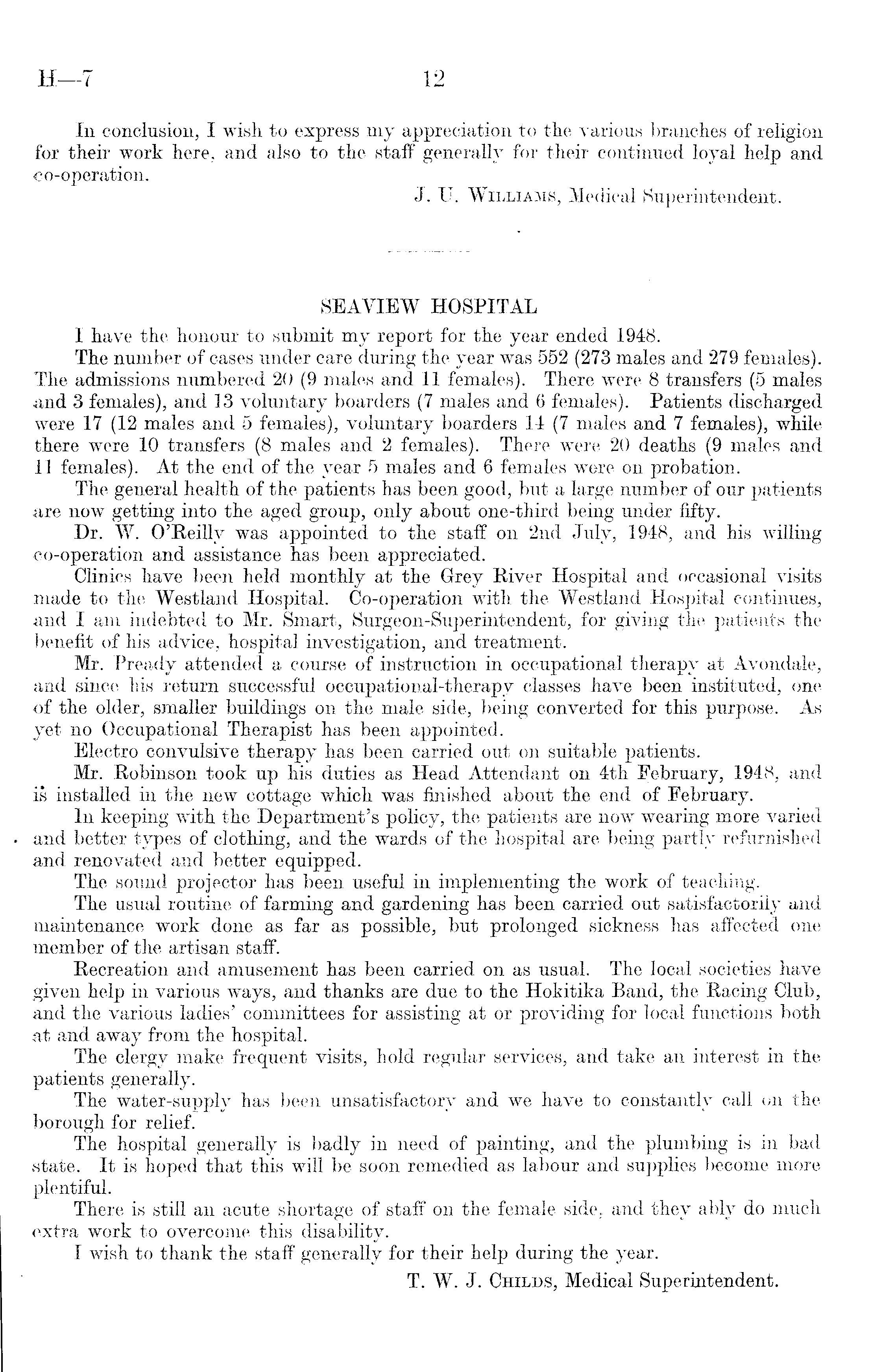 SEAVIEW HOSPITAL I have the honour to submit my report for the year ended 1948. The number of cases under care during the year was 552 (273 males and 279 females). The admissions numbered 20 (9 males and 11 females). There were 8 transfers (5 males and 3 females), and 13 voluntary boarders (7 males and 6 females). Patients discharged were 17 (12 males and 5 females), voluntary boarders 14 (7 males and 7 females), while there were 10 transfers (8 males and 2 females). There were 20 deaths (9 males and 11 females). At the end of the year 5 males and 6 females were on probation. The general health of the patients has been good, but a large number of our patients are now getting into the aged group, only about one-third being under fifty. Dr. W. O'Reilly was appointed to the staff on 2nd July, 1948, and his willing co-operation and assistance has been appreciated. Clinics have been held monthly at the Grey River Hospital and occasional visits made to the Westland Hospital. Co-operation with the Westland Hospital continues, and I am indebted to Mr. Smart, Surgeon-Superintendent, for giving the patients the benefit of his advice, hospital investigation, and treatment. Mr. Pready attended a course of instruction in occupational therapy at Avondale, and since his return successful occupational-therapy classes have been instituted, one of the older, smaller buildings on the male side, being converted for this purpose. As yet no Occupational Therapist has been appointed. Electro convulsive therapy has been carried out on suitable patients. Mr. Robinson took up his duties as Head Attendant on 4th February, 1948, and is installed in the new cottage which was finished about the end of February. In keeping with the Department's policy, the patients are now wearing more varied and better types of clothing, and the wards of the hospital are being partly refurnished and renovated and better equipped. The sound projector has been useful in implementing the work of teaching. The usual routine of farming and gardening has been carried out satisfactorily and maintenance work done as far as possible, but prolonged sickness has affected one member of the artisan staff. Recreation and amusement has been carried on as usual. The local societies have given help in various ways, and thanks are due to the Hokitika Band, the Racing Club, and the various ladies' committees for assisting at or providing for local functions both at and away from the hospital. The clergy make frequent visits, hold regular services, and take an interest in the patients generally. The water-supply has been unsatisfactory and we have to constantly call on the borough for relief. The hospital generally is badly in need of painting, and the plumbing is in bad state. It is hoped that this will be soon remedied as labour and supplies become more plentiful. There is still an acute shortage of staff on the female side, and they ably do much extra work to overcome this disability. I wish to thank the staff generally for their help during the year. T. W. J. Childs, Medical Superintendent.