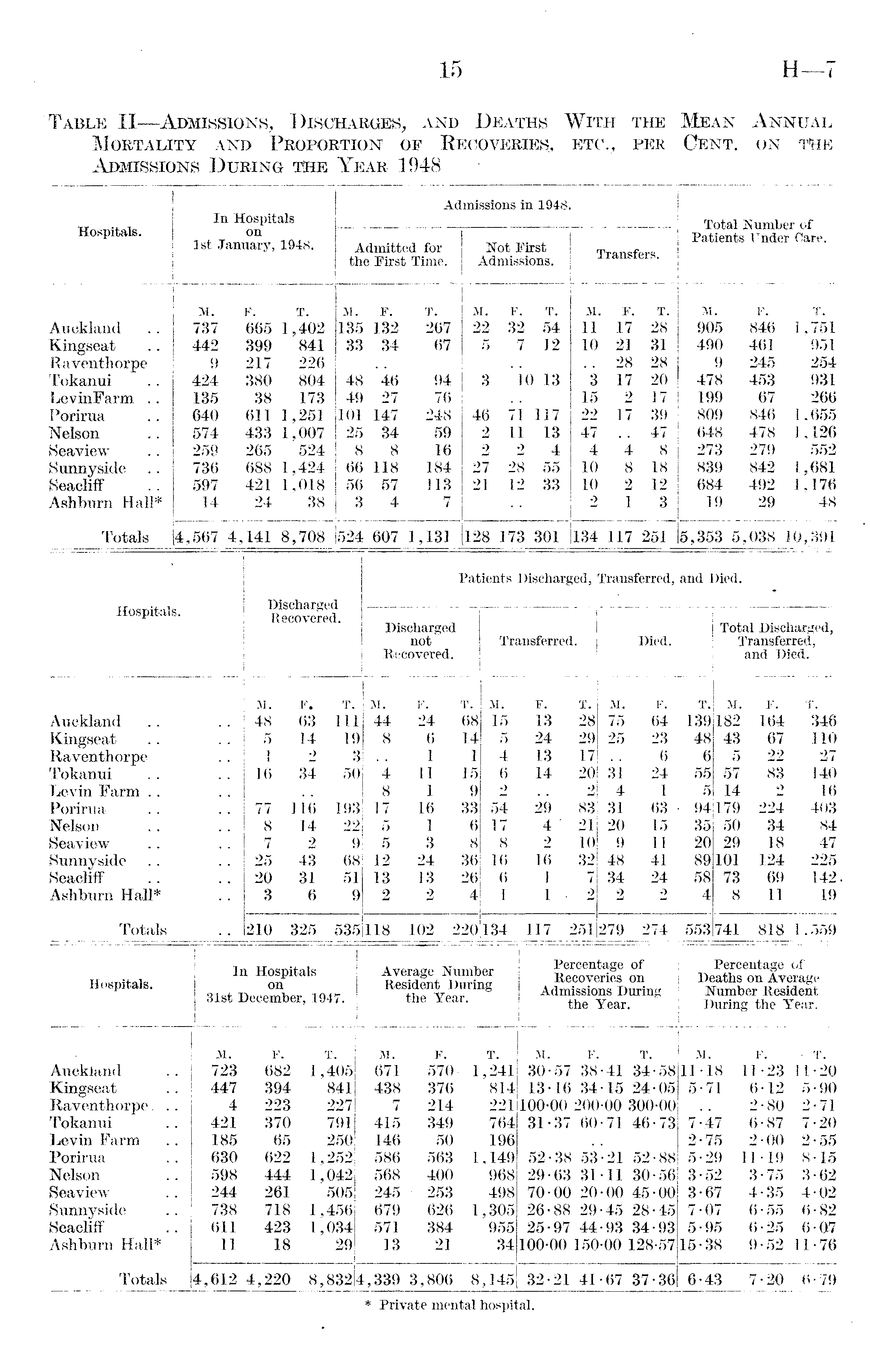 Hospitals. Ia Hospitals on 1st January, 1948. Admissions in 1948. Total Number of Patients Under Care, Admitted for the First Time. Not First Admissions. Transfers. Auckland Kingseat Raventhorpe Tokanui LevinFarm .. Porirua Nelson Seaview Sunnyside SeaclifF Ashburn Hall* Totals M. F. T. 737 665 1,402 442 399 841 9 217 226 424 380 804 135 38 173 640 611 1,251 574 433 1,007 259 265 524 736 6881,424 597 421 1,018 14 24 38 M. F. T. 135 132 267 33 34 67 48 46 94 49 27 76 101 147 248 25 34 59 8 8 16 66 118 184 56 57 113 3 4 7 M. F. T. 22 32 54 5 7 12 3 io 13 46 71 117 2 11 13 2 2 4 27 28 55 21 12 33 M. F. T. 11 17 28 10 21 31 .. 28 28 3 17 20 15 2 17 22 17 39 47 .. 47 4 4 8 10 8 18 10 2 12 2 1 3 M. F. T. 905 846 1,751 490 461 951 9 245 254 478 453 931 199 67 266 809 846 1,655 648 478 1,126 273 279 552 839 842 1,681 684 492 1,176 19 29 48 4,567 4,141 8,708 524 607 1,131 128 173 301 134 117 251 5,353 5,038 10,391 Hospitals. Discharged Recovered. Patients Discharged, Transferred, and Died. Discharged not Recovered. Transferred. Total Discharged, Died. Transferred, and Died. Auckland Kingseat Raventhorpe Tokanui Levin Farm Porirua Nelson Seaview Sunnyside SeaclifF Ashburn Hall* Totals M. F. T. 48 63 111 5 14 19 1 2 3 16 34 50 77 lie 193 8 14 22 7 2 9 25 43 68 20 31 51 3 6 9 M. F. T. 44 24 68 8 6 14 1 .. 1 1 • 4 11 15 8 1 9 ; 17 16 33 !. 5 1 6 i 5 3 8 ; 12 24 36 13 13 26 >2 2 4' M. F. T. 15 13 28 5 24 29 4 13 17 6 14 20 2 2 54 29 83 17 4 ' 21 8 2 10 16 16 32 6 1 7 1 12 M. F. T. 75 64 139 25 23' 48 6 6 31 24 55 4 1 5 31 63 • 94 20 15 35 9 11 20 48 41 89 34 24 58 2-2 4 M. F. T. 182 164 346 43 67 110 5 22 27 57 83 140 14 2 16 179 224 403 50 34 84 29 18 47 101 124 225 73 69 142 8 11 19 210 325 535 ; 118 102 220134 117 251 279 274 553 741 818 1,559 Hospitals. In Hospitals on 31st December, 1947. Average Number Resident During the Year. 1 Percentage of Recoveries on Admissions During the'Year. Percentage of Deaths on Average Number Resident During the Year. Auckland Kingseat Raventhorpe. .. Tokanui Levin Farm Porirua Nelson Seaview Sunnyside SeaclifF Ashburn Hall* Totals M. F. T. 723 682 1,405 447 394 841 4 223 227 421 370 791 185 65 250 630 622 1,252 598 444 1,042 244 261 505 738 718 1,456 611 423 1,034 11 18 29 M. F. T. 671 570 1,241 438 376 814 7 214 221 415 349 764 146 50 196 586 563 1,149 568 400 968 245 253 498 679 626 1,305 571 384 955 13 21 34 M. F. T. 30-57 38-41 34-58 13-16 3415 24-05 100-00 200-00 300-00 31-37 60-71 46-73 52-38 53-21 52-88 29-63 31-11 30-56 70-00 20-00 45-00 26-88 29-45 28-45 25-97 44-93 34-93 100-00 150-00 128-57 M. F. T. 11-18 11-23 11-20 5-71 6-12 5-90 2-80 2-71 7-47 6-87 7-20 2-75 2-00 2-55 5-29 11-19 8-15 3-52 3-75 3-62 3-67 4-35 4-02 7-07 6-55 6-82 5-95 6-25 6-07 15-38 9-52 11-76 4,612 4,220 8,832^ £,339 3,806 8,145 32-21 41-67 37-36 6-43 7-20 6-79 * Private mental hospital.