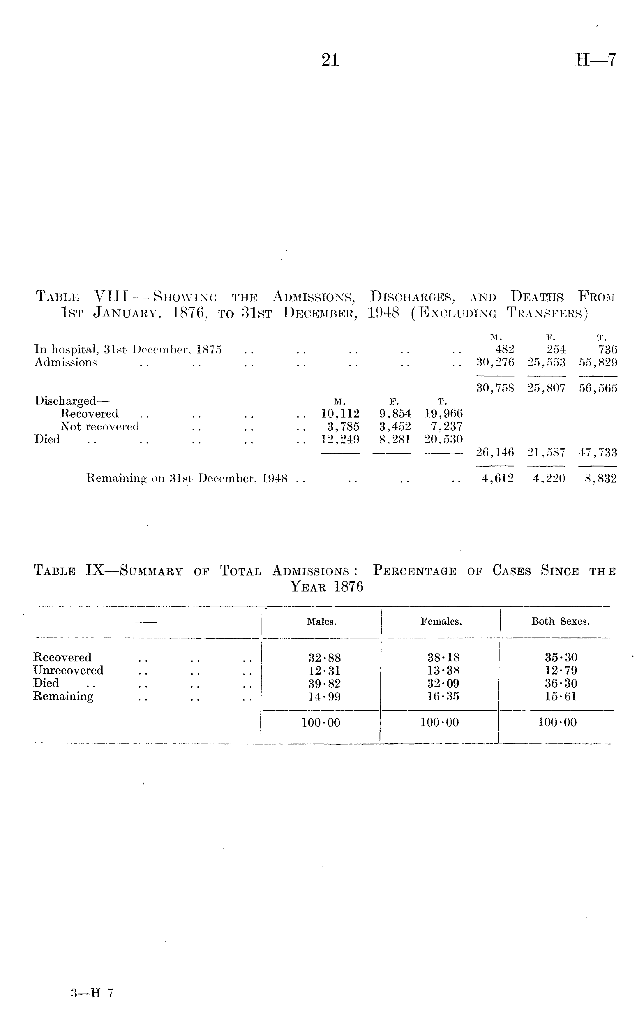 Table VIII Showing the Admissions, Discharges, and Deaths From Ist January, 1876, to 31st December, 1948 (Excluding Transfers) M. F. T. In hospital, 31st December, 1875 .. .. . . .. .. 482 254 736 Admissions .. .. .. .. .. .. .. 30,276 25,553 55,829 30,758 25,807 56,565 Discharged— m. p. t. Recovered .. .. .. .. 10,112 9,854 19,966 Not recovered .. .. .. 3,785 3,452 7,237 Died .. .. .. .. .. 12,249 8,281 20,530 26,146 21,587 47,733 Remaining on 31st December, 1948 .. .. .. .. 4,612 4,220 8,832
