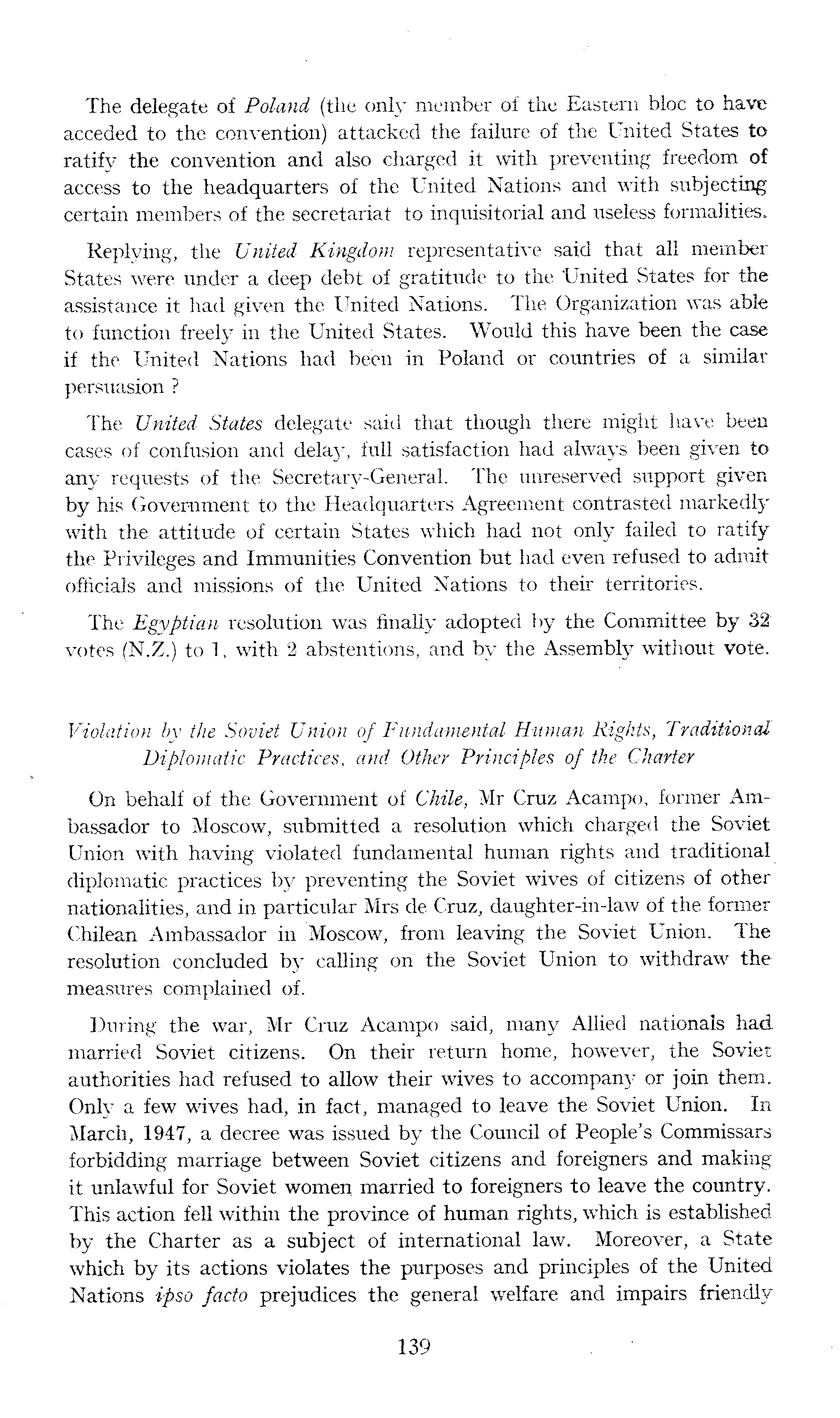 The delegate of Poland (the only member of the Eastern bloc to have acceded to the convention) attacked the failure of the United States to ratify the convention and also charged it with preventing freedom of access to the headquarters of the United Nations and with subjecting certain members of the secretariat to inquisitorial and useless formalities. Replying, the United Kingdom representative said that all member States were under a deep debt of gratitude to the United States for the assistance it had given the United Nations. The Organization was able to function freely in the United States. Would this have been the case if the United Nations had been in Poland or countries of a similar persuasion ? The United States delegate said that though there might have been cases of confusion and delay, full satisfaction had always been given to any requests of the Secretary-General. The unreserved support given by his Government to the Headquarters Agreement contrasted markedly with the attitude of certain States which had not only failed to ratify the Privileges and Immunities Convention but had even refused to admit officials and missions of the United Nations to their territories. The Egyptian resolution was finally adopted by the Committee by 32 votes (N.Z.) to 1, with 2 abstentions, and by the Assembly without vote. Violation by the Soviet Union of Fundamental Human Rights, Traditional Diplomatic Practices, and Other Principles of the Charter On behalf of the Government of Chile, Mr Cruz Acampo, former Ambassador to Moscow, submitted a resolution which charged the Soviet Union with having violated fundamental human rights and traditional diplomatic practices by preventing the Soviet wives of citizens of other nationalities, and in particular Mrs de Cruz, daughter-in-law of the former Chilean Ambassador in Moscow, from leaving the Soviet Union. The resolution concluded by calling on the Soviet Union to withdraw the measures complained of. During the war, Mr Cruz Acampo said, many Allied nationals had married Soviet citizens. On their return home, however, the Soviet authorities had refused to allow their wives to accompany or join them. Only a few wives had, in fact, managed to leave the Soviet Union. In March, 1947, a decree was issued by the Council of People's Commissars forbidding marriage between Soviet citizens and foreigners and making it unlawful for Soviet women married to foreigners to leave the country. This action fell within the province of human rights, which is established by the Charter as a subject of international law. Moreover, a State which by its actions violates the purposes and principles of the United Nations ipso facto prejudices the general welfare and impairs friendly