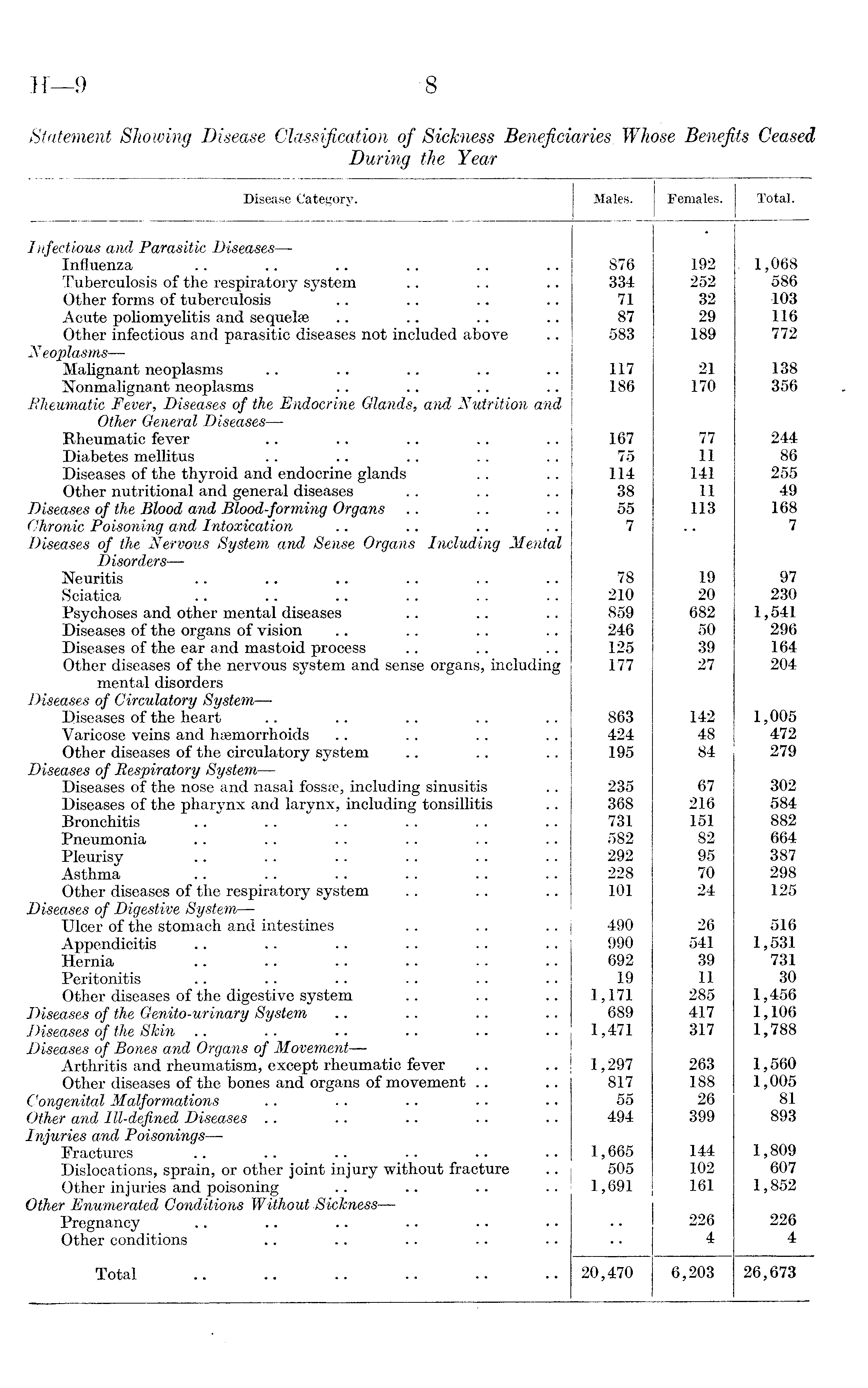 Disease Category. Males. Females. Total. Infectious and Parasitic Diseases— Influenza 876 192 . 1,068 Tuberculosis of the respiratory system .. .. 334 252 586 Other forms of tuberculosis .. .. .. 71 32 103 Acute poliomyelitis and sequelae 87 29 116 Other infectious and parasitic diseases not included above 583 189 772 Neoplasms— Malignant neoplasms 117 21 138 Nonmalignant neoplasms .. .. .. 186 170 356 Rheumatic Fever, Diseases of the Endocrine Glands, and Nutrition and Other General Diseases— Rheumatic fever 167 77 244 Diabetes mellitus .. .. .. .. 75 11 86 Diseases of the thyroid and endocrine glands 114 141 255 Other nutritional and general diseases 38 11 49 Diseases of the Blood and Blood-forming Organs 55 113 168 Chronic Poisoning and Intoxication 7 7 Diseases of the Nervous System and Sense Organs Including Mental Disorders — Neuritis 78 19 97 Sciatica 210 20 230 Psychoses and other mental diseases 859 682 1,541 Diseases of the organs of vision 246 50 296 Diseases of the ear and mastoid process 125 39 164 Other diseases of the nervous system and sense organs, including 177 27 204 mental disorders Diseases of Circulatory System— Diseases of the heart 863 142 1,005 Varicose veins and haemorrhoids 424 48 472 Other diseases of the circulatory system 195 84 279 Diseases of Respiratory System— Diseases of the nose and nasal fossae, including sinusitis 235 67 302 Diseases of the pharynx and larynx, including tonsillitis 368 216 584 Bronchitis 731 151 882 Pneumonia 582 82 664 Pleurisy 292 95 387 Asthma 228 70 298 Other diseases of the respiratory system 101 24 125 Diseases of Digestive System— Ulcer of the stomach and intestines .. .. .. j 490 26 516 Appendicitis .. .. 990 541 1,531 Hernia 692 39 731 Peritonitis 19 11 30 Other diseases of the digestive system 1,171 285 1,456 Diseases of the Genito-urinary System 689 417 1,106 Diseases of the Skin 1,471 317 1,788 Diseases of Bones and Organs of Movement— Arthritis and rheumatism, except rheumatic fever .. .. | 1,297 263 1,560 Other diseases of the bones and organs of movement 817 188 1,005 Congenital Malformations 55 26 81 Other and Ill-defined Diseases 494 399 893 Injuries and Poisonings— 144 1,809 Fractures 1,665 Dislocations, sprain, or other joint injury without fracture .. j 505 102 607 Other injuries and poisoning .. .. .. .. ■ 1,691 161 1,852 Other Enumerated Conditions Without Sickness— Pregnancy 226 226 Other conditions 4 4 Total 20,470 6,203 26,673