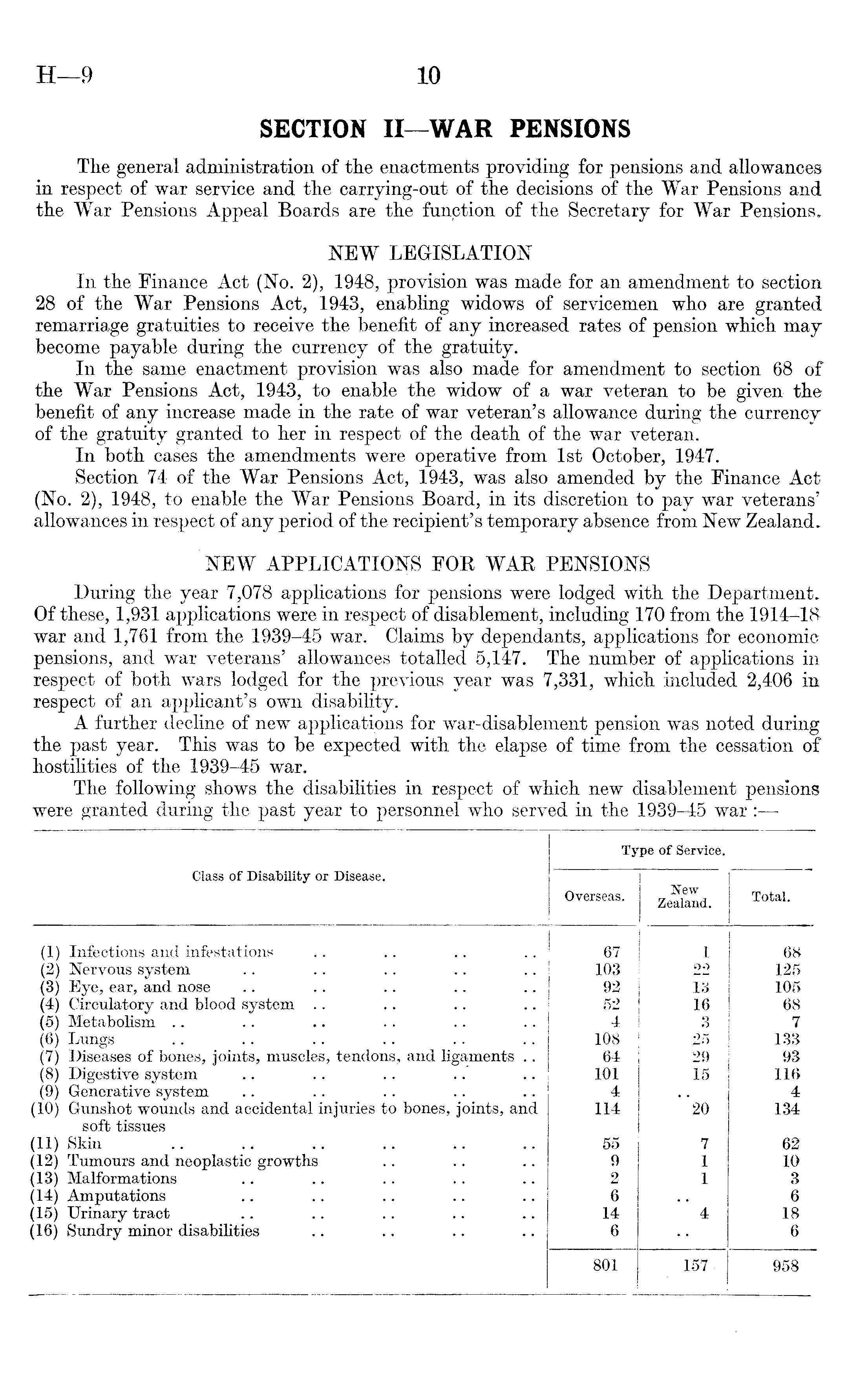 SECTION lI—WAR PENSIONS The general administration of the enactments providing for pensions and allowances in respect of war service and the carrying-out of the decisions of the War Pensions and the War Pensions Appeal Boards are the function of the Secretary for War Pensions. NEW LEGISLATION In the Finance Act (No. 2), 1948, provision was made for an amendment to section 28 of the War Pensions Act, 1943, enabling widows of servicemen who are granted remarriage gratuities to receive the benefit of any increased rates of pension which may become payable during the currency of the gratuity. In the same enactment provision was also made for amendment to section 68 of the War Pensions Act, 1943, to enable the widow of a war veteran to be given the benefit of any increase made in the rate of war veteran's allowance during the currency of the gratuity granted to her in respect of the death of the war veteran. In both cases the amendments were operative from Ist October, 1947. Section 74 of the War Pensions Act, 1943, was also amended by the Finance Act (No. 2), 1948, to enable the War Pensions Board, in its discretion to pay war veterans' allowances in respect of any period of the recipient's temporary absence from New Zealand. NEW APPLICATIONS FOR WAR PENSIONS During the year 7,078 applications for pensions were lodged with the Department. Of these, 1,931 applications were in respect of disablement, including 170 from the 1914-18 war and 1,761 from the 1939-45 war. Claims by dependants, applications for economic pensions, and war veterans' allowances totalled 5,147. The number of applications in respect of both wars lodged for the previous year was 7,331, which included 2,406 in respect of an applicant's own disability. A further decline of new applications for war-disablement pension was noted during the past year. This was to be expected with the elapse of time from the cessation of hostilities of the 1939-45 war.