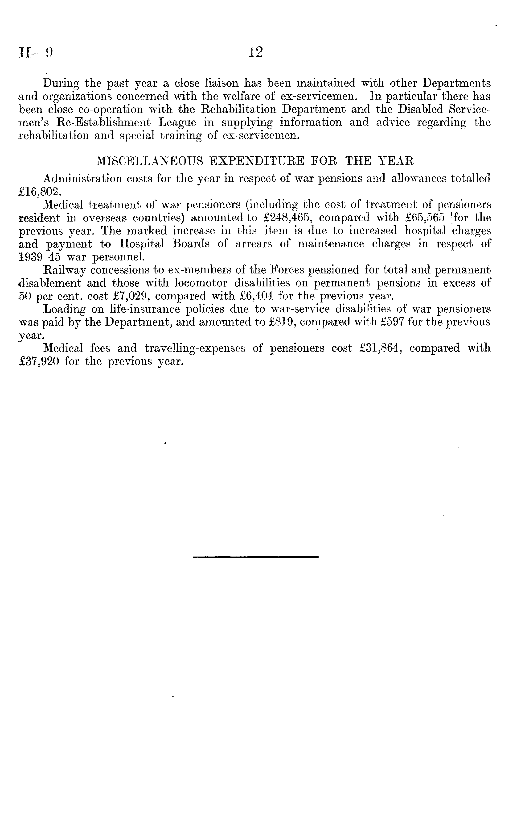 During the past year a close liaison has been maintained with other Departments and organizations concerned with the welfare of ex-servicemen. In particular there has been close co-operation with the Rehabilitation Department and the Disabled Servicemen's Re-Establishment League in supplying information and advice regarding the rehabilitation and special training of ex-servicemen. MISCELLANEOUS EXPENDITURE FOR THE YEAR Administration costs for the year in respect of war pensions and allowances totalled £16,802. Medical treatment of war pensioners (including the cost of treatment of pensioners resident in overseas countries) amounted to £248,465, compared with £65,565 'for the previous year. The marked increase in this item is due to increased hospital charges and payment to Hospital Boards of arrears of maintenance charges in respect of 1939-45 war personnel. Railway concessions to ex-members of the Forces pensioned for total and permanent disablement and those with locomotor disabilities on permanent pensions in excess of 50 per cent, cost £7,029, compared with £6,404 for the previous year. Loading on life-insurance policies due to war-service disabilities of war pensioners was paid by the Department, and amounted to £Bl9, compared with £597 for the previous year. Medical fees and travelling-expenses of pensioners cost £31,864, compared with £37,920 for the previous year.