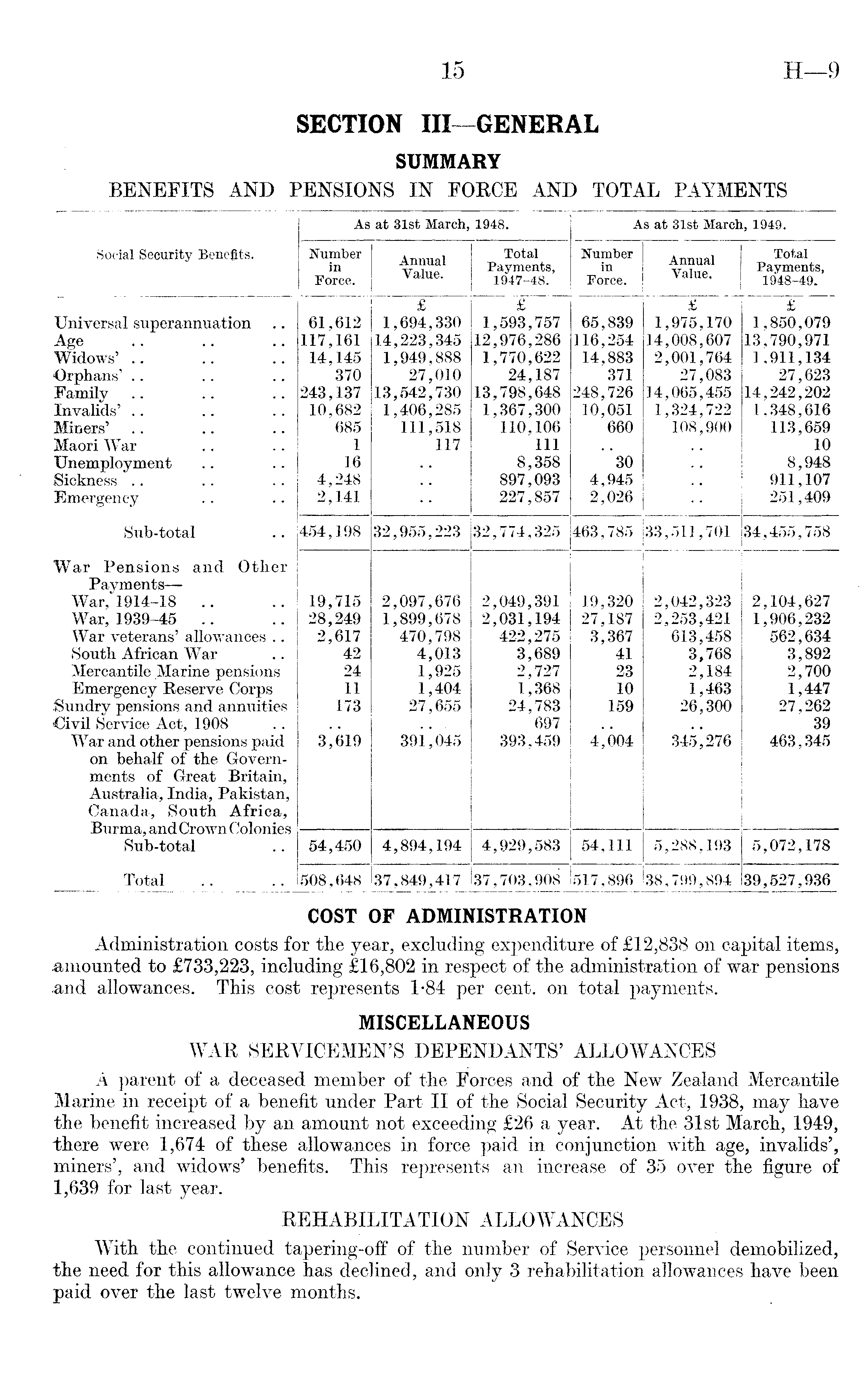 COST OF ADMINISTRATION Administration costs for the year, excluding expenditure of £12,838 on capital items, amounted to £733,223, including £16,802 in respect of the administration of war pensions and allowances. This cost represents 1-84 per cent, on total payments. MISCELLANEOUS WAR SERVICEMEN'S DEPENDANTS' ALLOWANCES A parent of a deceased member of the Forces and of the New Zealand Mercantile Marine in receipt of a benefit under Part II of the Social Security Act, 1938, may have the benefit increased by an amount not exceeding £26 a year. At the 31st March, 1949, there were 1,674 of these allowances in force paid in conjunction with age, invalids', miners', and widows' benefits. This represents an increase of 35 over the figure of 1,639 for last year. REHABILITATION ALLOWANCES With the continued tapering-off of the number of Service personnel demobilized, the need for this allowance has declined, and only 3 rehabilitation allowances have been paid over the last twelve months.