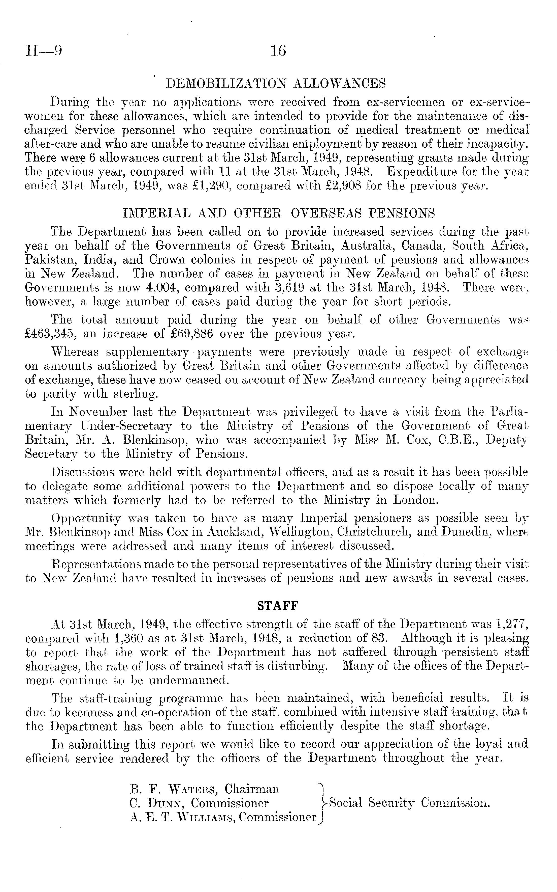 DEMOBILIZATION ALLOWANCES During the year no applications were received from ex-servicemen or ex-service-women for these allowances, which are intended to provide for the maintenance of discharged Service personnel who require continuation of medical treatment or medical after-care and who are unable to resume civilian employment by reason of their incapacity. There were 6 allowances current at the 31st March, 1949, representing grants made during the previous year, compared with 11 at the 31st March, 1948. Expenditure for the year ended 31st March, 1949, was £1,290, compared with £2,908 for the previous year. IMPERIAL AND OTHER OVERSEAS PENSIONS The Department has been called on to provide increased services during the past year on behalf of the Governments of Great Britain, Australia, Canada, South Africa,. Pakistan, India, and Crown colonies in respect of payment of pensions and allowances in New Zealand. The number of cases in payment in New Zealand on behalf of these Governments is now 4,004, compared with 3,619 at the 31st March, 1948. There were, however, a large number of cases paid during the year for short periods. The total amount paid during the year on behalf of other Governments was £463,345, an increase of £69,886 over the previous year. Whereas supplementary - payments were previously made in respect of exchange on amounts authorized by Great Britain and other Governments affected by difference of exchange, these have now ceased on account of New Zealand currency being appreciated to parity with sterling. In November last the Department was privileged to -have a visit from the Parliamentary Under-Secretary to the Ministry of Pensions of the Government of Great Britain, Mr. A. Blenkinsop, who was accompanied by Miss M. Cox, C.8.E., Deputy Secretary to the Ministry of Pensions. Discussions were held with departmental officers, and as a result it has been possible to delegate some additional powers to the Department and so dispose locally of many matters which formerly had to be referred to the Ministry in London. Opportunity was taken to have as many Imperial pensioners as possible seen by Mr. Blenkinsop and Miss Cox in Auckland, Wellington, Christchurch, and Dunedin, where meetings were addressed and many items of interest discussed. Representations made to the personal representatives of the Ministry during their visit to New Zealand have resulted in increases of pensions and new awards in several casesSTAFF At 31st March, 1949, the effective strength of the staff of the Department was 1,277, compared with 1,360 as at 31st March, 1948, a reduction of 83. Although it is pleasing to report that the work of the Department has not suffered through -persistent staff shortages, the rate of loss of trained staff is disturbing. Many of the offices of the Department continue to be undermanned. The staff-training programme has been maintained, with beneficial results. It is due to keenness and co-operation of the staff, combined with intensive staff training, that the Department has been able to function efficiently despite the staff shortage. In submitting this report we would like to record our appreciation of the loyal and efficient service rendered by the officers of the Department throughout the year. B. F. Waters, Chairman C. Dunn, Commissioner , Social Security Commission. A. E. T. Williams, Commissioner J